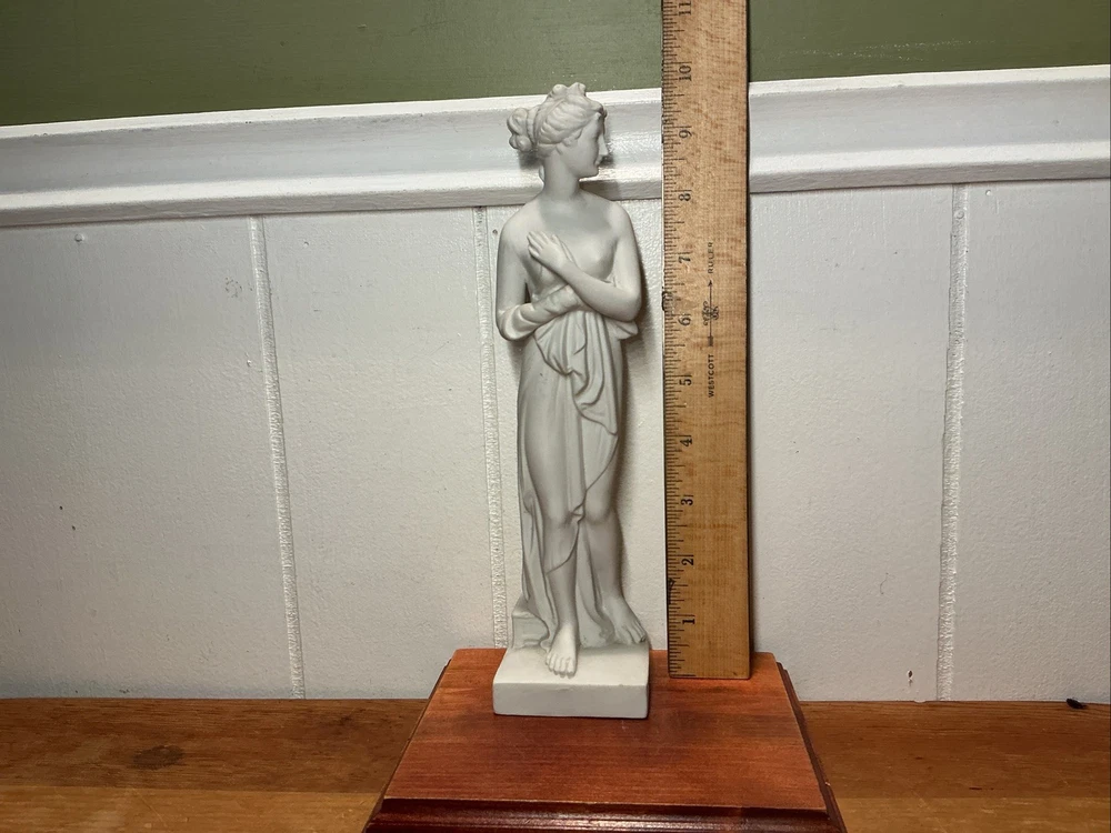The Canova Classical Sculpture Venus Italica is a small Museum reproduction sculpture measuring 9.8 inches in height. Made of plaster, it features a figurative art style with elements of Realism and Classical themes. This statue is a replica of the original work by artist Canova, depicting the subject of Venus Italica with a focus on Egyptian, Religious, Mythology, Roman, History, and Greek influences. Produced using pottery techniques in Japan, this sculpture captures the essence of timeless artistry and craftsmanship.