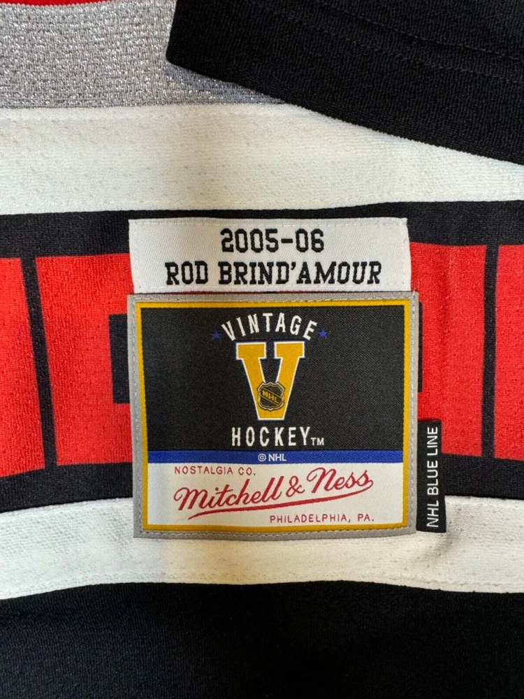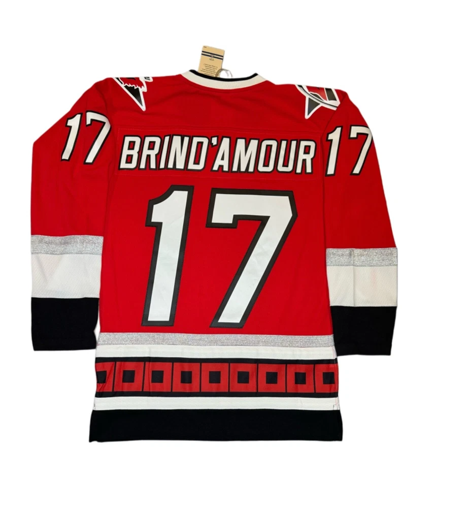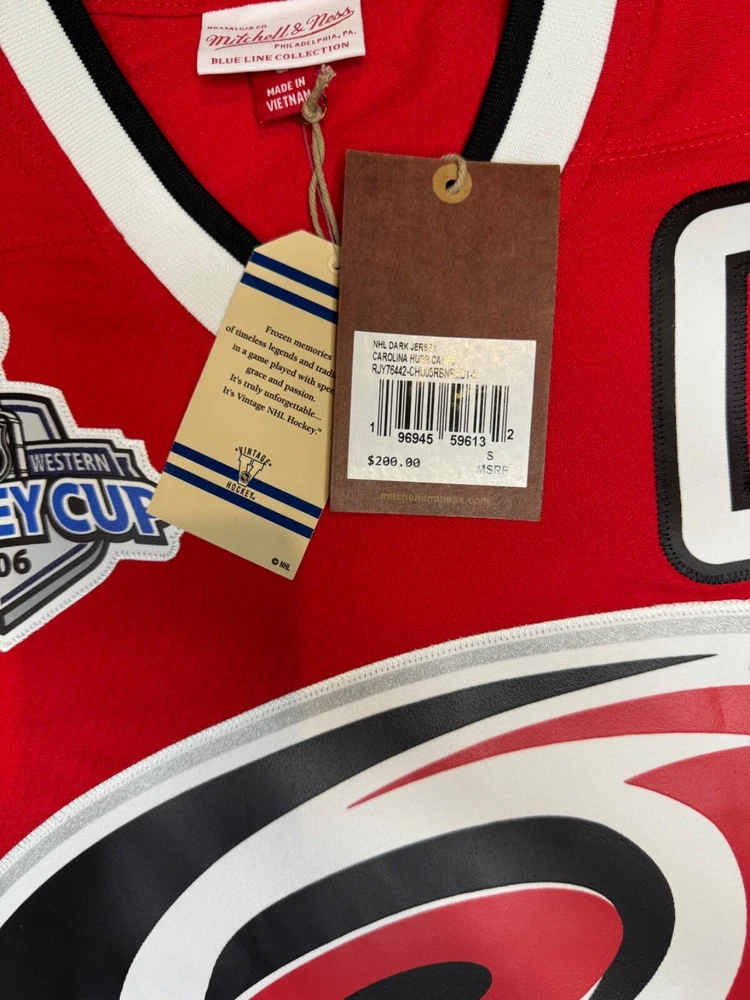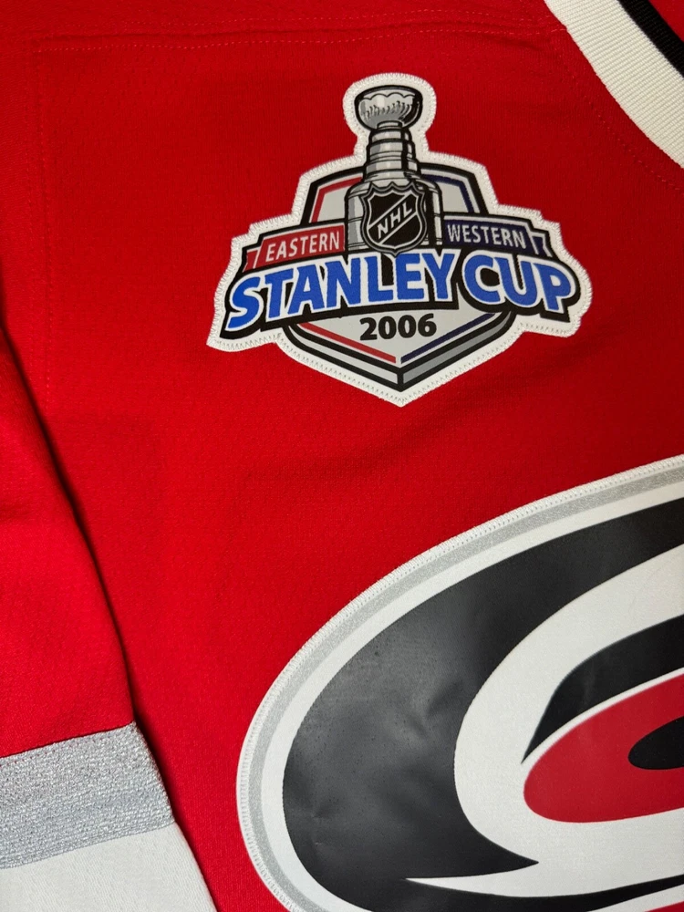The product is a Mitchell & Ness Stanley Cup Champion Brindmore Jersey in size 2XL for men, featuring the colors of the Carolina Hurricanes team in the National Hockey League (NHL). This jersey is designed to celebrate the team's success in the Stanley Cup, making it a fitting choice for fans looking to show their support. It is a high-quality fan apparel perfect for those looking to represent the Carolina Hurricanes with pride and style.