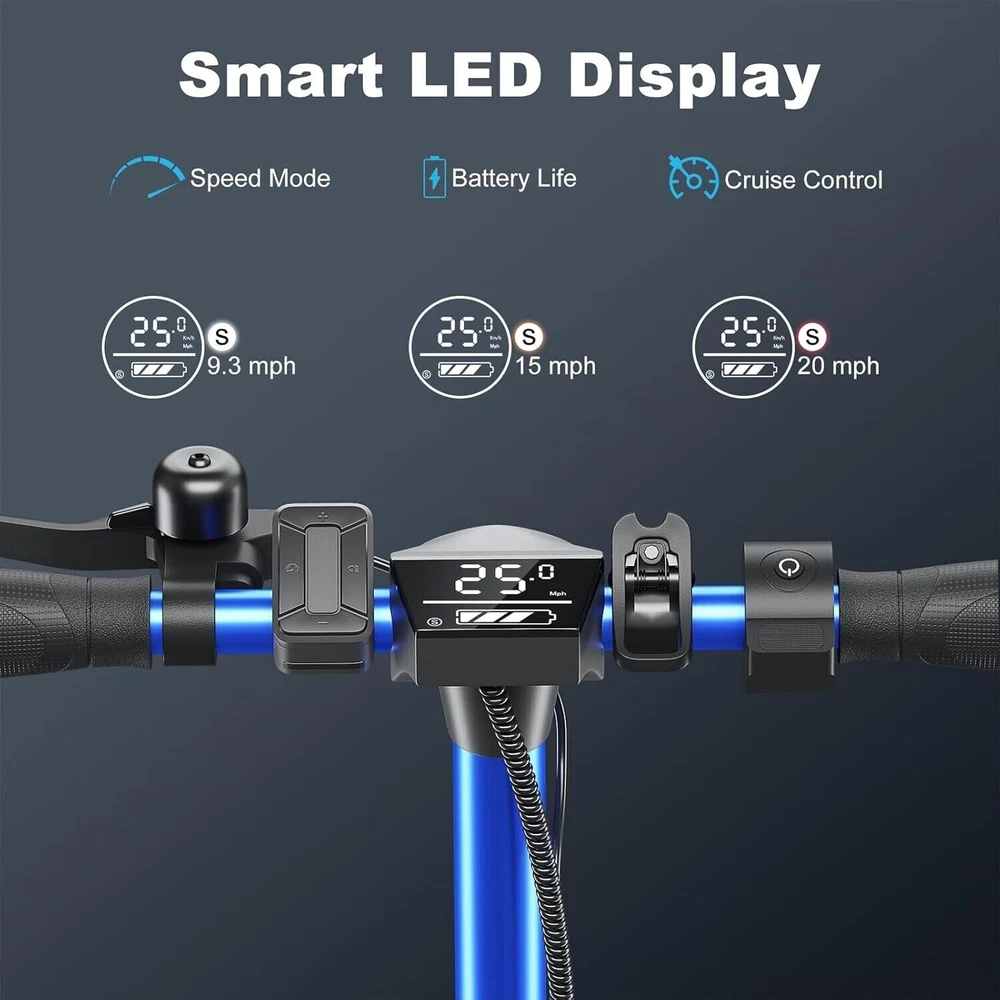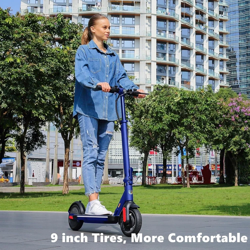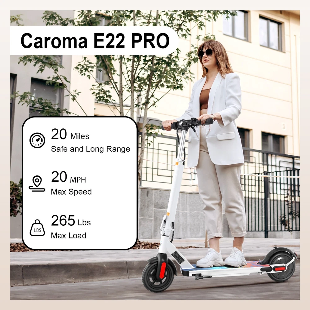 Product Description About this item Ideal Commute Partner: Caroma electric scooter is equipped with a 350W rear-wheel motor that delivers up to 630W of powerful power, which makes the scooter reach max speed 20 mph and ride on 20° max slope easily. Thanks to the 285Wh large capacity battery and superior battery management system, you can reach travel range up to max 20 miles. Caroma electric scooter adults can take you anywhere in the city and is also the perfect solution for the last mile of your commute Comfortable and Safe Riding: Auto Triple Lighting System(automatic headlight, taillight & pedal light) lights up road of night riding. Adjustable height handlebar (40" - 46") fits for teens and adults. 9" honeycomb solid tires are explosion-proof, anti-puncture and self-healing. Rear Shock Absorber brings up comfortable riding experience. Dual braking system(EABS & Drum braking) make sure riders can safely stop scooter in seconds Intelligent APP Control: Connect the mobile app to the electric scooter's Bluetooth. You can control speed mode, cruise control, headlight and pedal light. At the same time, you can record the data of each ride, so that you can easily enjoy riding LED Display and Three Speed Modes: The LED display shows real-time speed, battery life, speed mode and cruise control. With multifunctional button console, riders can easily control headlight, switch speed mode, activate cruise control. In order to meet the different needs of use from teens to adults, the electric scooter is equipped with 3 speed gears: 9.3 mph/15.5 mph/20 mph Folding Portable Design: This adult electric scooter features an convenient one step folding system, and the weight of the electric scooter is only 34.7 lbs. The folded size is 44.5" x 18.5" x 19.7". It's great convenience for storage and portability, you can take it on the subway, bus and trunk of car Tip: Actual range is affected by different loads, road conditions, temperature conditions and riding habits.