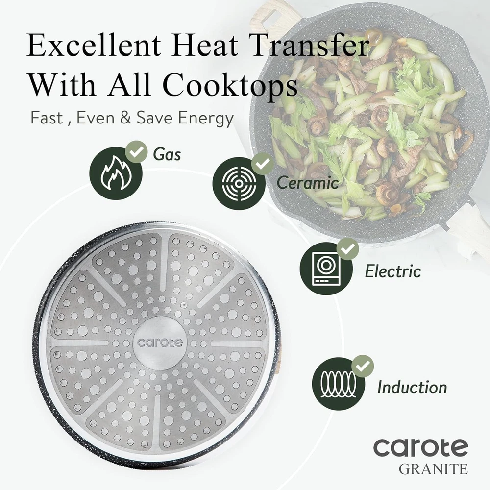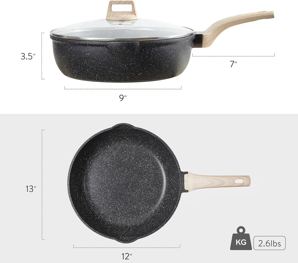 Store New Arrivals Add to Favorite View Feedback Contact CAROTE 12Inch Nonstick Deep Frying Pan with Lid, 5.5 Qt Jumbo Cooker Saute Pan Description Item model number A07745 Maximum Temperature 250 Degrees Celsius Capacity 6.1 Liters Country of Origin China Has Nonstick Coating Yes Is Oven Safe Yes Product Dimensions 7.09 x 12.6 x 3.54 inches Material Non Stick Granite, Aluminum Shape rectangular prism Model Name 32cm deep frying pan with lid EU Spare Part Availability Duration 2 Years Is Discontinued By Manufacturer Yes Specific Uses For Product cooking on various hobs Is Dishwasher Safe No Item Weight 5.59 pounds Special Feature Gas Stovetop Compatible, Electric Stovetop Compatible, Induction Stovetop Compatible Color Classic Granite Compatible Devices Gas Stovetop, Ceramic Stovetop, Industion Stovetop, Electric Coil Handle Material Bakelite Recommended Uses For Product Sautéing, poaching, braising, and deep frying Product Care Instructions Hand Wash Only Size 5.5 QT saute pan [Superior Nonstick Performance] - Our saute pan, made with natural granite materials, provides superior nonstick performance with 100% PFOA Free and non-toxic properties. Enjoy healthier cooking with less oil intake. Advanced technology ensures a long-lasting and naturally nonstick surface that effortlessly releases food. [Super Easy to Clean] - Featuring 5x nonstick ability and a rivetless interior, our deep frying pan prevents food from sticking. After use, simply rinse it with soapy water for easy and convenient cleaning. [Heat Quickly and Evenly] - The enlarged induction base of our saute pan facilitates quick and even heat distribution. No more waiting, as you'll achieve better cooking results in less time. It is safe for all stoves, including induction. [Perfect Large Size] - Our non-stick saute pan is designed with a deep pan size to meet different cooking needs such as sautéing, poaching, braising, and deep frying. It is especially suitable for large families and can fulfill your everyday cooking requirements. [Ergonomic Design] - Double pouring spout, left - and right-handed pouring can be more convenient and effective. The long-lasting tempered glass lid allows you to monitor the cooking status and helps limit splashes on your stove. The wooden handle provides a comfortable grip and stays cool while cooking. [Service & Guarantee] - Each CAROTE cookware undergoes strict multi-inspection processes. If you receive any defect items caused by delivery, please don't hesitate to reach out to us. We offer a 100% refund or a new replacement guarantee. Product Description We Care, We Protect The natural material extracted from granite is health for daily use. With the super nonstick property,Carote classic pots and pans set is welcomed over 30 countries and regions. 1 Super Easy to Clean 2 Fast and Even Heat Durable and Nonstick Our saute pan, made with natural granite materials, provides superior nonstick performance with 100% PFOA Free and non-toxic properties. Advanced technology ensures a durable and naturally nonstick surface that effortlessly releases food. CAROTE Saute Pan with Large Capacity Our non-stick 5.5 QT saute pan is designed with a deep pan size to meet different cooking needs such as sautéing, poaching, braising, and deep frying. It is especially suitable for large families and can fulfill your everyday cooking requirements. Jumbo Cooker with Double Pour Spout Double pouring spout, left - and right-handed pouring can be more convenient and effective. Why with this very affordable offer? Carote cut all the middleman from the supply chain, we sell directly from factory to your hand, save all the extra cost from each part, set global service team all by ourselves.Enjoy the benefit with the best value cookware. ABOUT US We offer high-quality home products at competitive prices. At laydremgoodsofficial , we're committed to providing a seamless and satisfying shopping experience with a touch of American comfort. SHIPPING We are always working hard to ensure your package arrives as soon as possible. Please understand that some factors like weather, high postal traffic, and the performance of shipping companies are outside of our control. We offer free shipping to the lower 48 states and ship within 2 business days of payment, usually sooner. We do not accept P.O. Boxes. Please provide a physical address. Orders ship within 1–2 business days after payment Standard delivery: 3–5 business days Expedited shipping options available U.S. domestic orders only RETURNS We offer a 30-Day Return Policy on items which you are not completely satisfied with. You have the option for a full-refund or an exchange of the item. Item must be in original condition Original packaging and tags included Return request made within 30-day window For assistance, message us through eBay. PAYMENT Our Payment methods managed by eBay. CONTACT US This page content is yet to come Please ad us to your favorite seller and visit again later Thank You WHY BUY FROM US U.S.-based & fast shipping Premium quality home & travel accessories Top-rated customer satisfaction Responsive and friendly communication CUSTOMER SATISFACTION We try our very best to make sure every customer is completely satisfied. If there's a problem, message us! We're happy to help. We're available 24/7 via eBay messaging. Whether you have questions about products, tracking, or returns — we're here to help!