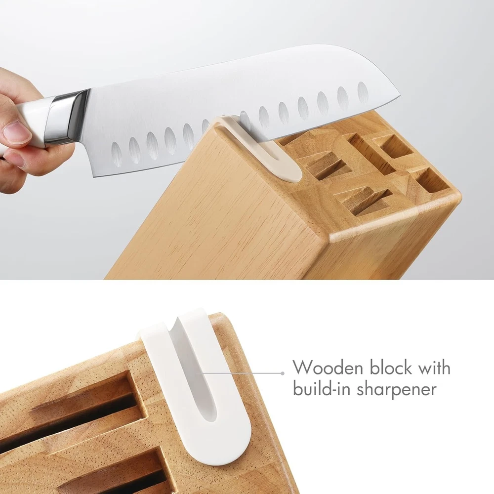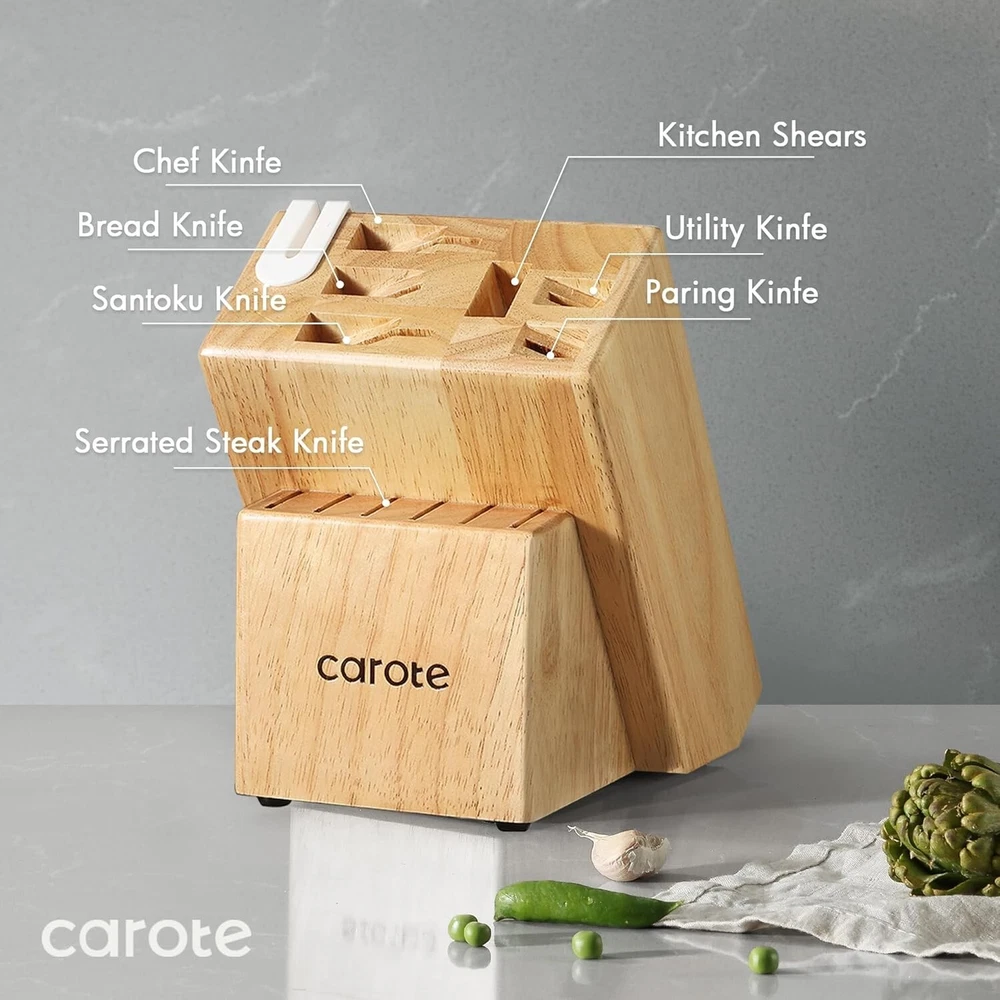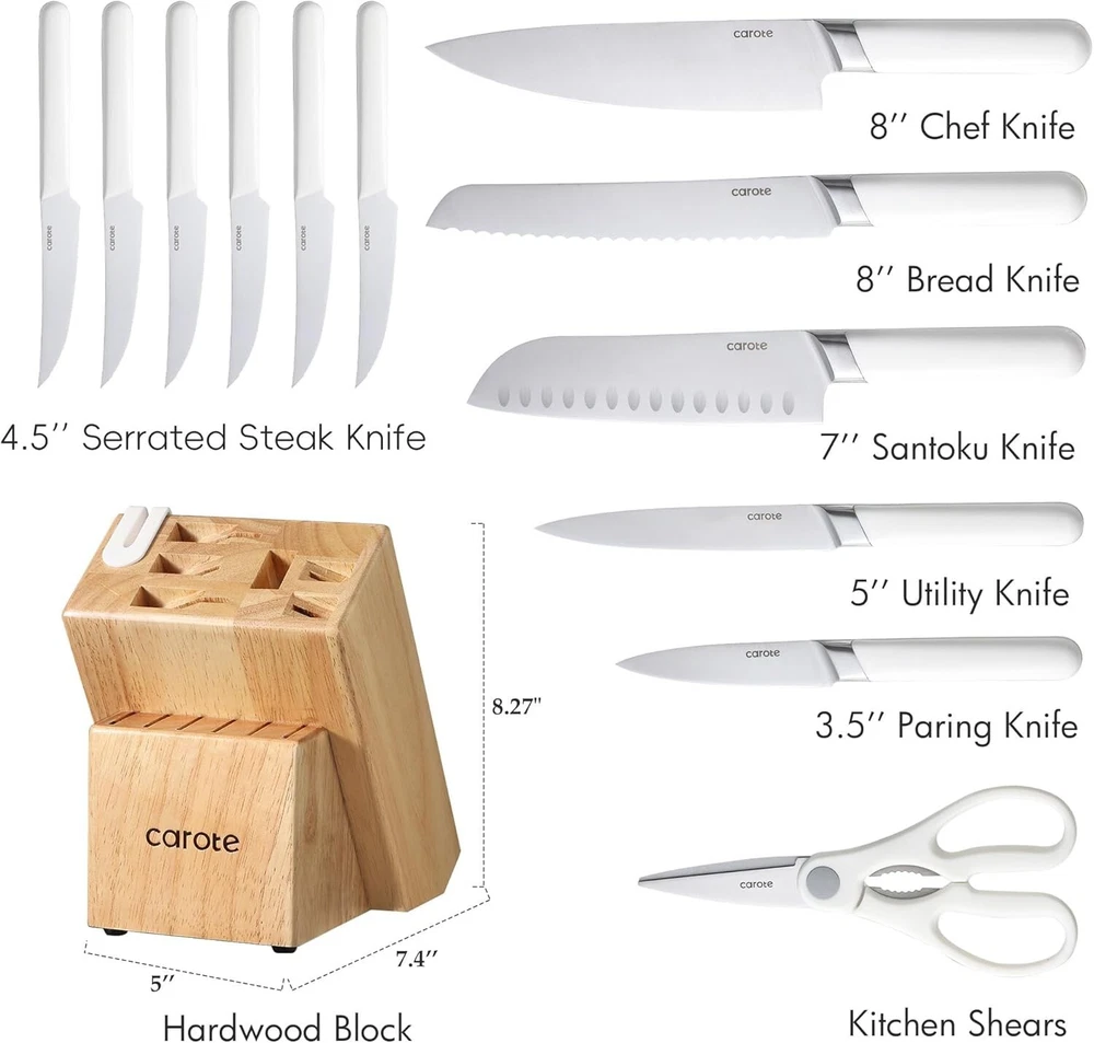 CAROTE Knife Set Precise lasers are used to ensure each blade edge is at the optimal cutting angle for sharpness.It brings efficiency to save more time in everyday food preparation. CAROTE Kitchen Knife Set features precision stainless-steel blades that resist stains and rust. And each knife is precision forged from single piece of sturdy stainless-steel that for exceptional durability. Ergonomically handle provides a secure, comfortable grip. And full tangs and extra-wide forged bolsters ensure balance, stability and control.The Block with Built-in Sharpener saves storage space and saves time in making the knife sharper. CAROTE Knife Set with Block includes all the most common kitchen knives, 8" chef knife, 8" bread knife, 7" santoku knife, 5" utility knife, 3.5"paring knife, as well as a six-piece steak knife set, kitchen shears, 14-slot hardwood storage block with built-in sharpener. SERVICE & GUARANTEE: Each CAROTE Chef knife set passes a strict multi-inspection process. In case you received defective items caused by delivery, please don't hesitate to reach out to us. You will be guaranteed to get a refund or a new replacement
