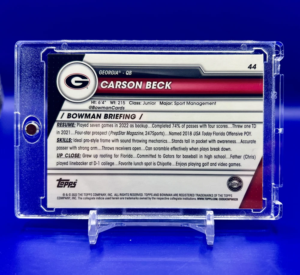 2023 CARSON BECK 1ST BOWMAN CHROME U INVESTMENT CARD GEORGIA HEISMAN CARD SHIPPED SECURELY SHIPPING IS ALWAYS FREE WITH JLKDIRECT