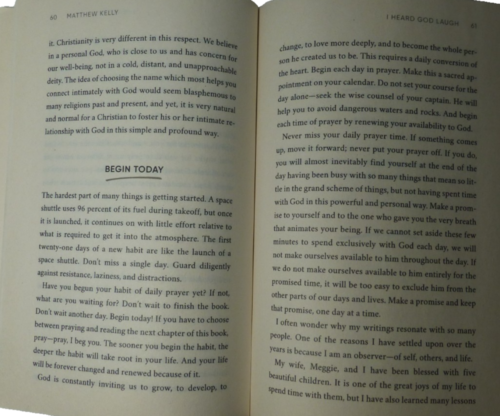 CASE OF 64 BRAND NEW BOOKS Paperback edition. NEW UNOPENED CASE. Only shipping to lower 48 contiguous states. Authored by Matthew Kelly, New York Times Best Selling Author. Ideal for Anyone seeking inspiration, spiritual awakening, inner peace. This book is ideal for anyone interested in having Better communication with Their Own God. Ideal for groups like AA, substance abuse, churches, therapists, etc. (Or for resale.) The words "God", "Lord", "Yahweh", "Adonai", "Christian", "Jesus" & "Christianity" appear, but no attempt is made to "convert" you to any specific religion. It's meant as a non-denominational worship guide. This is more of a "Self Help" type book with a Positive upbeat attitude about improving your life thru prayer to Your own God for Your own life and needs.
