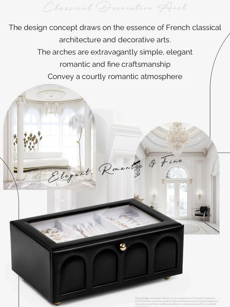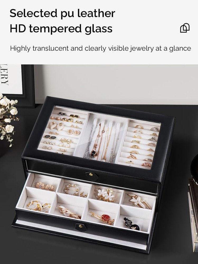 CASEGRACE Jewelry Box for Women, 2 Layer Double Drawer Jewelry Organizer Glass Lid, Large Jewelry Display Case for Necklace Bracelet Earrings Rings Storage for Dresser, Black - Buy Now with Fast Shipping! CASEGRACE Jewelry Box for Women, 2 Layer Double Drawer Jewelry Organizer Glass Lid, Large Jewelry Display Case for Necklace Bracelet Earrings Rings Storage for Dresser, Black Product Details Brand: CASEGRACE Style: Modern Special Feature: Adjustable Product Dimensions: 11.8"D x 4.3"W x 7.9"H Shape: Rectangular Finish Type: Leather-like Inner Material: Velvet Number of Drawers: 2 Number of Compartments: 2 Jewelry Storage Type: Jewelry Box Brand: CASEGRACE Style: Modern Special Feature: Adjustable Product Dimensions: 11.8"D x 4.3"W x 7.9"H Shape: Rectangular Finish Type: Leather-like Inner Material: Velvet Number of Drawers: 2 Number of Compartments: 2 Jewelry Storage Type: Jewelry Box Manufacturer: CASEGRACE Occasion: Mother's Day Mounting Type: Table Top Closure Type: Flip Top Lid Part Number: sp01321hs Item Weight: 3.19 pounds Country of Origin: China Item model number: sp01321hs Finish: Leather-like Special Features: Adjustable Included Components: Jewelry Box Batteries Included?: No Batteries Required?: No Date First Available: October 10, 2024 Key Features ✅ French retro style: draws on the essence of French classical architecture and decorative arts using arches of luxury minimalist design, elegant and romantic, exquisite craftsmanship, to create a romantic atmosphere of the palace-style ✅ Transparent windows make it easier to find your favorite jewels before you open it. You can use it in many situations such as living room, bedroom, wardrobe, jewelry store, never messy dressing table anymore. ✅ Durable Material&Perfect Size: Made of premium PU leather, great texture and stain resistant, with soft velvet lining, protect your jewelry from dust and scratch. Attractive surface, durable quality. Dimension: 11.81x 7.87 x 4.33 inch (L x W x H) . ✅ Multifunction Storage&Double Drawer: Double layers jewelry organizer box contains grids with different size to store all kinds of jewelries or cosmetics. Dividers in the drawers all can be removed to meet your different needs. ✅ Best Gift Choice: Jewelry display box will be a wonderful gift for Valentine's Day, Mother's Day, Thanksgiving, Christmas gift for her, birthdays and weddings for mom, girlfriend, colleague or someone special in your life. Product Description