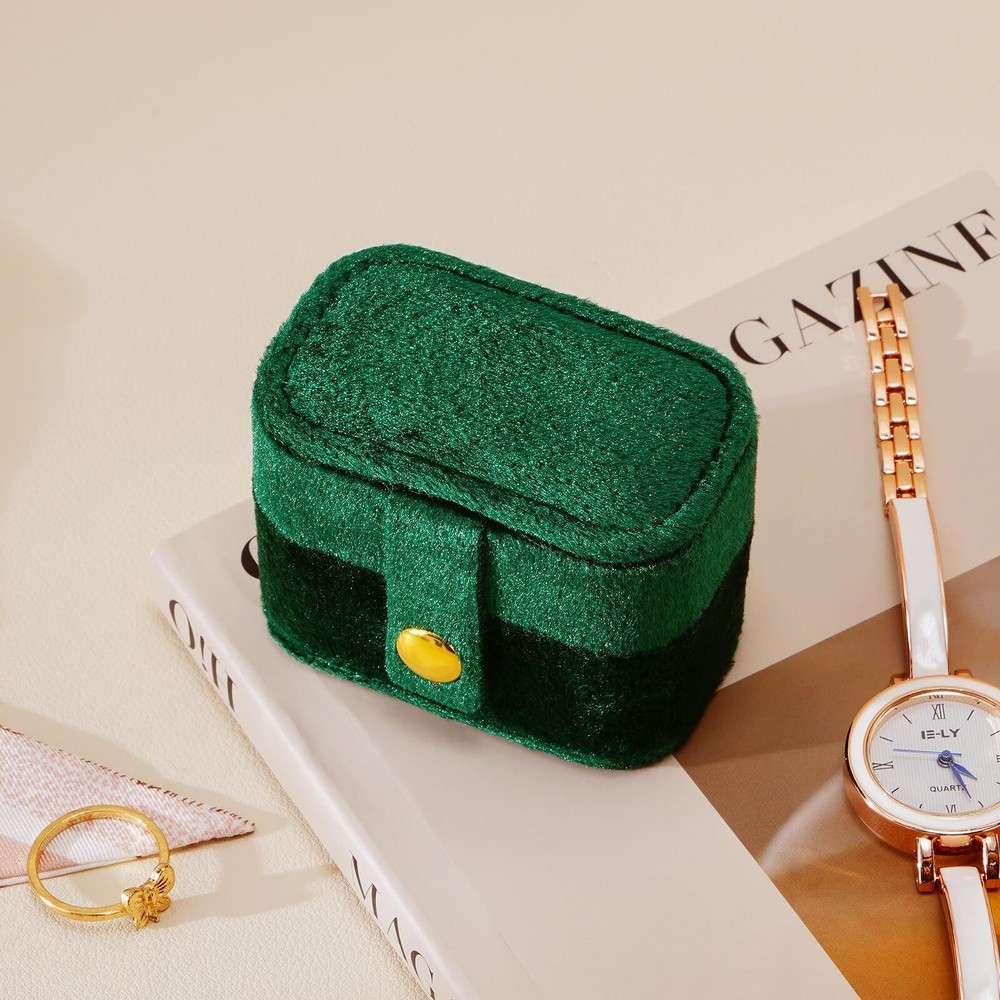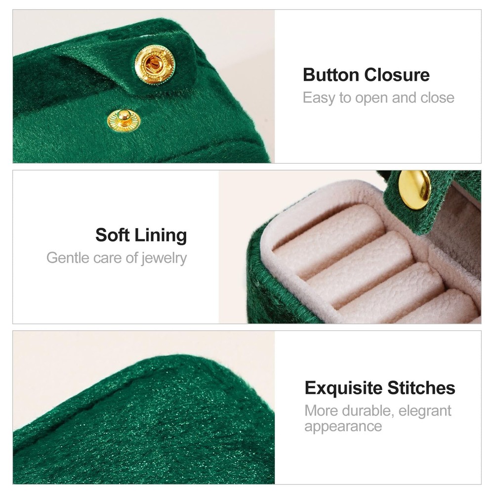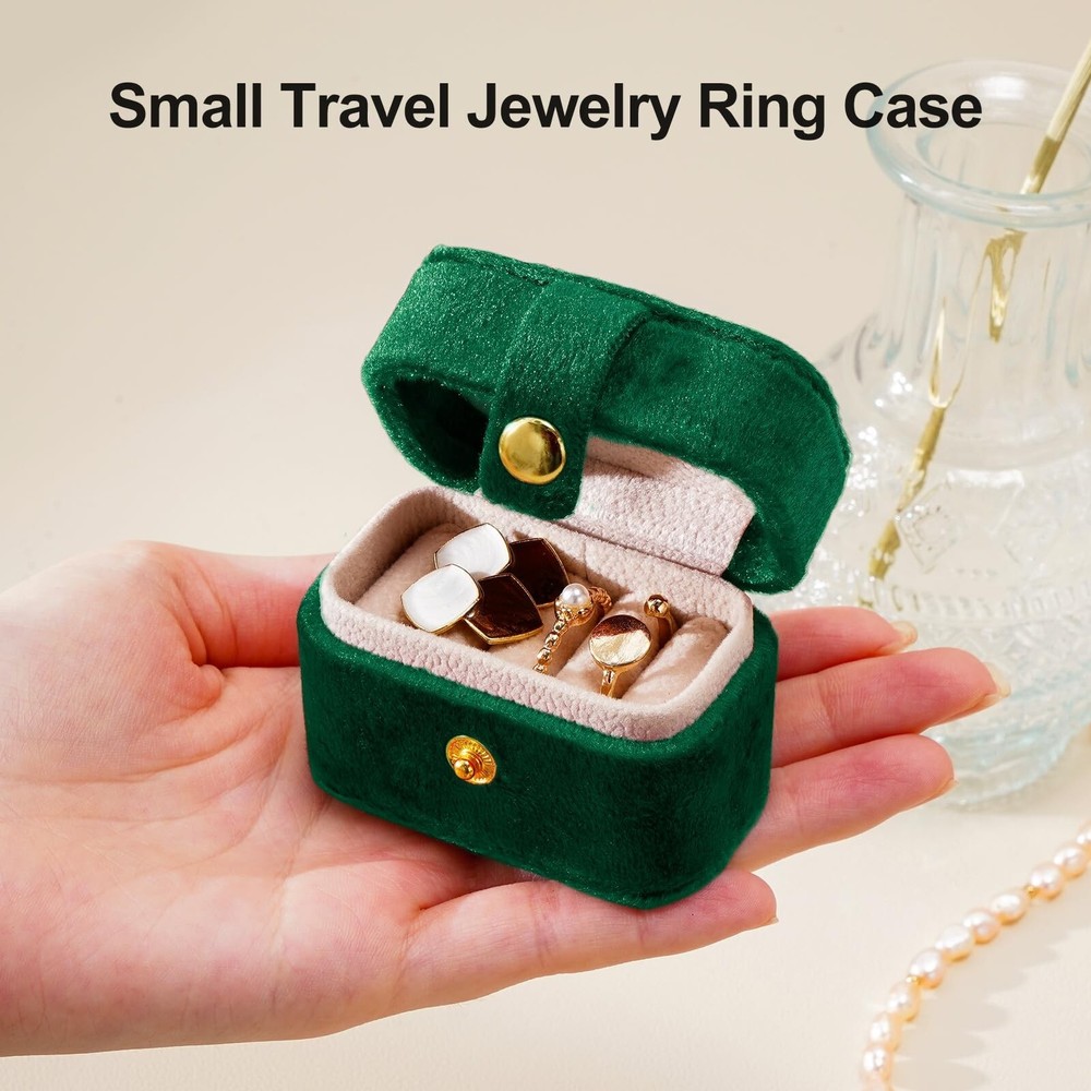 CASEGRACE Velvet Travel Jewelry Case - Portable Small Jewelry Ring Box Plush Velvet Ring Storage Case for Rings Earrings, Travel Essential Accessories for Women, Emerald - Buy Now with Fast Shipping! CASEGRACE Velvet Travel Jewelry Case - Portable Small Jewelry Ring Box Plush Velvet Ring Storage Case for Rings Earrings, Travel Essential Accessories for Women, Emerald Product Details Color: Emerald Brand: CASEGRACE Material: Leather Style: Modern Special Feature: Portable Recommended Uses For Product: Earring Product Dimensions: 2.6"D x 1.53"W x 1.85"H Target Audience: Women Finish Type: Fabric-lined Inner Material: Velvet Color: ‎Emerald Brand: ‎CASEGRACE Material: ‎Leather Style: ‎Modern Special Feature: ‎Portable Recommended Uses For Product: ‎Earring Product Dimensions: ‎2.6"D x 1.53"W x 1.85"H Target Audience: ‎Women Finish Type: ‎Fabric-lined Inner Material: ‎Velvet Number of Drawers: ‎2 Number of Compartments: ‎5 Jewelry Storage Type: ‎Jewelry Roll Number of Items: ‎1 Manufacturer: ‎CASEGRACE Occasion: ‎Engagement, Mother's Day, Wedding, Birthday Mounting Type: ‎Table Top Closure Type: ‎Button Item Weight: ‎2.39 ounces Country of Origin: ‎China Size: ‎Velvet Finish: ‎Fabric-lined Item Package Quantity: ‎1 Special Features: ‎Portable Batteries Included?: ‎No Batteries Required?: ‎No Date First Available: July 21, 2023 Key Features ✅ Jewelry Ring Storage Case: Small jewerly ring box design to meet your ring storage needs. Make your beloved rings or earrings easy to carry, also display your jewelries in a beautiful and elegant manner. ✅ Velvet Jewelry Ring Case: Adopt exquisite velvet which feels fluffy with graceful luster, soft lining provide the best protection for your beloved jewelry, button closure design makes it easy to open and close. ✅ Protable Size: 2.60*1.53*1.85inch, cute and small design make it easy to carry in your handbag or luggage, suitable for travel storage, business trip or daily use. Elegant and luxurious color adds a touch of simplicity to the plush velvet jewelry box, making the jewelry organizer show exquisite luxury. ✅ Multifunctional Ring Organizer: 5 ring roll can fix your rings or earrings storage well. With this Mini jewelry ring organizer, you will no longer worried about the rings or earrings lost while travling. ✅ Perfect Gift Ideal: Small jewelry box features a premium velvet touch softness and inviting designs, will be an ideal gift for Valentine's Day, Mother's Day, Thanksgiving, best Christmas gift for girls in this winter, birthdays and weddings for your mom, girlfriend, colleague or any other special women in your life. Product Description