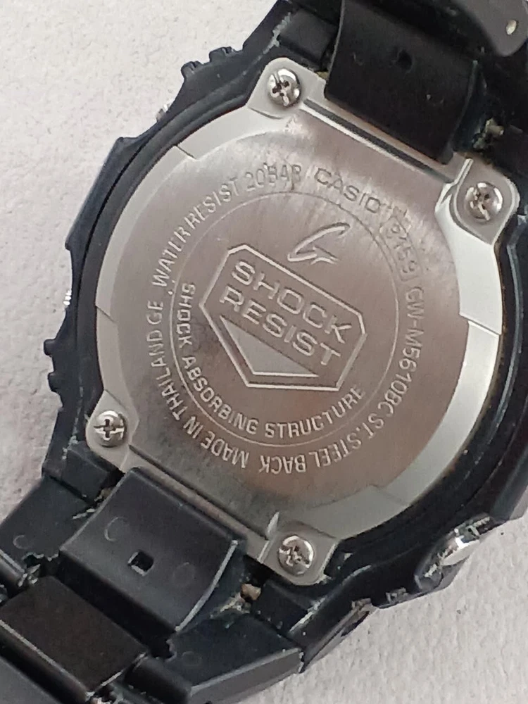 Case Color: Black Display: Digital Country/Region of Manufacture: Japan Water Resistance: 200 m (20 ATM) Case Size: N/A Customized: No Brand: Casio Features: Date Indicator, Water-Resistant Movement: Quartz Reference Number: GW-M5610, GWM5610 Model: G-SHOCK Type: Wristwatch Bezel Color: Black Case Material: N/A Dial Color: Black Band Material: Resin Band Color: Black Department: Men Seller Notes: “Good Condition”