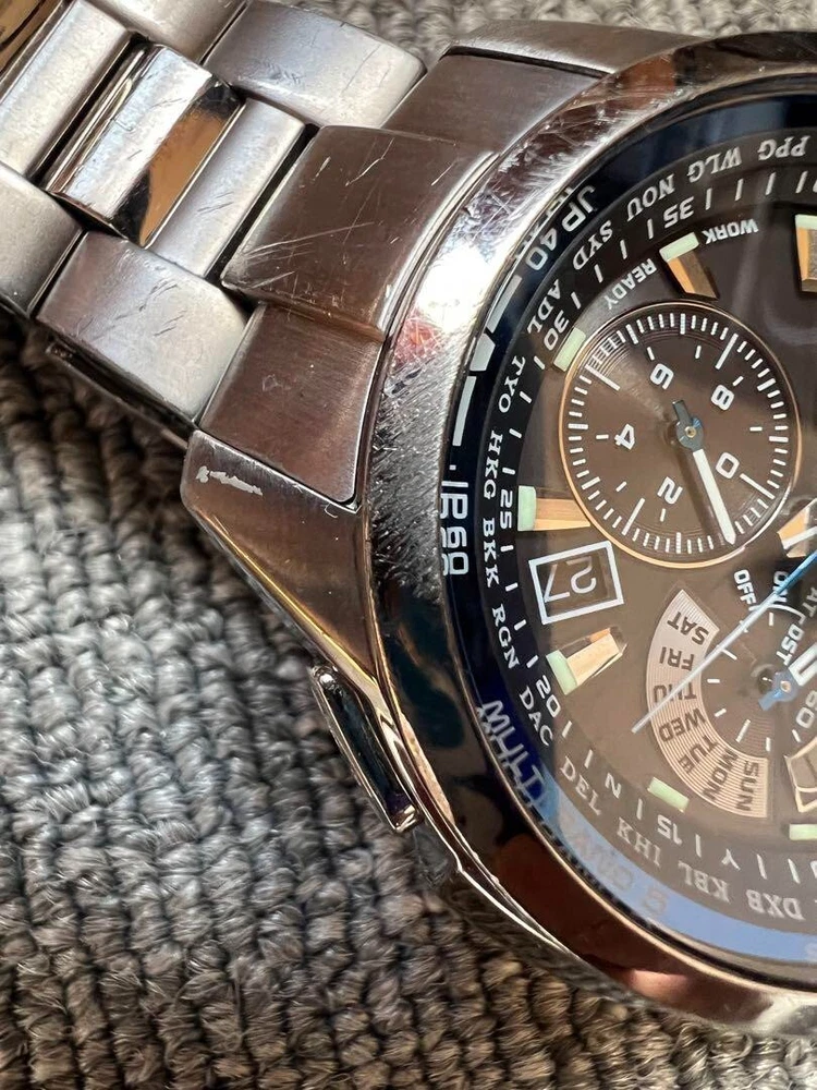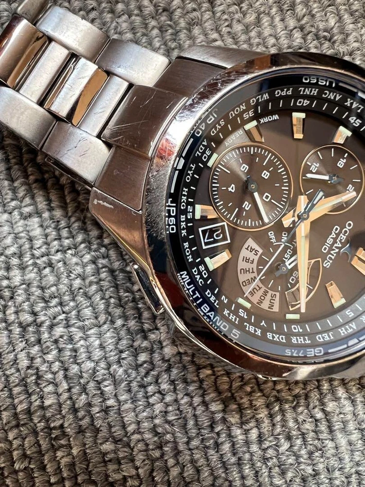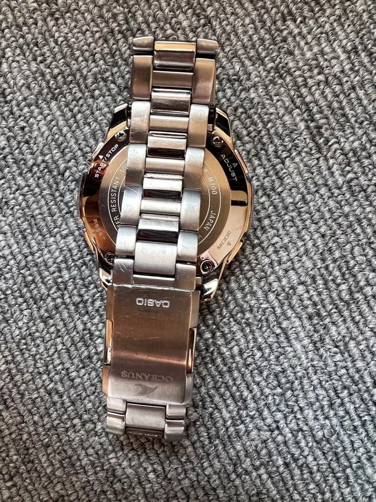 Department: Men Case Material: Titanium Band Color: Silver Seller Notes: “Good condition with minor scratch. Please see pictures of the item.” Dial Color: Black Watch Shape: Round Brand: Casio Country/Region of Manufacture: Japan Case Color: Silver Reference Number: OCWM700 Caseback: Solid gtin13: NA Handedness: Left Band/Strap: Bracelet Indices: Baton Indexes Band Material: Titanium Features: 12-Hour Dial, Chronograph, Date Indicator, Day Indicator, Water-Resistant, World Time Type: Wristwatch Style: Casual, Dress/Formal Display: Analog Model: Casio Oceanus Movement: Quartz UPC: NA Bezel Color: Silver Handmade: No