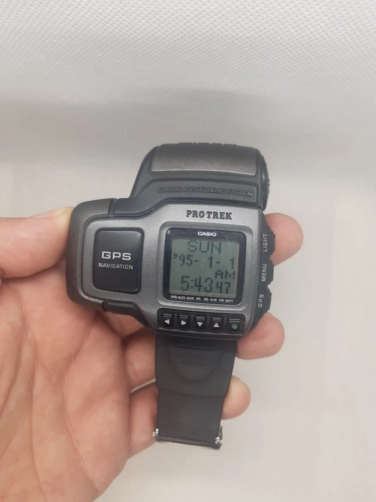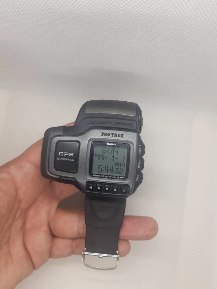 This RARE Vintage New Old Stock Casio Pathfinder / Pro Trek GPS Retro Watch is a must-have for any collector. Made in the 1990s in Japan and being the first consumer GPS wristwatch. It features a digital display, GPS, and water resistance up to 50 meters (5 ATM). I'm not sure if the gps tech of 1999 works with what's available now though. sound and light working properly. Its unique features and vintage style make it a great addition to any watch collection. Don't miss out on this opportunity to own a piece of history.