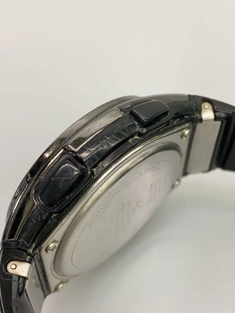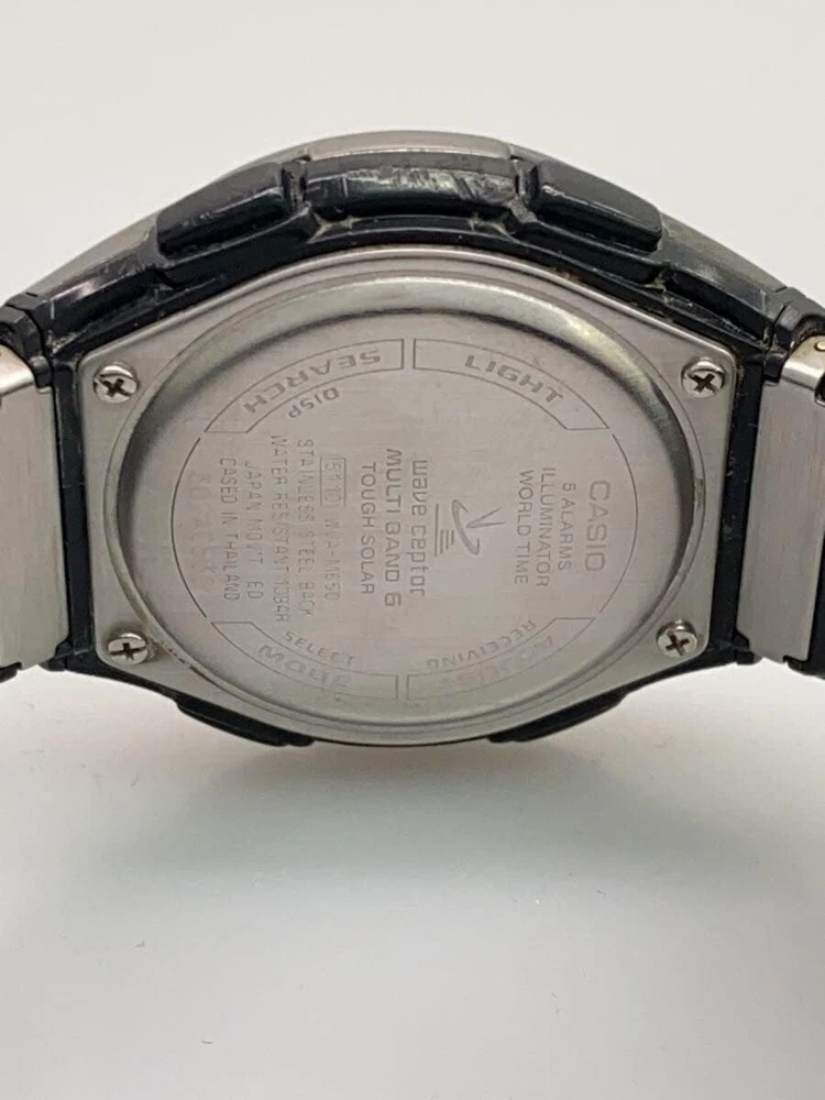 Bezel Type: N/A Case Material: Stainless Steel Brand: Casio Caseback: N/A Vintage: No Case Color: Silver Seller Warranty: No Band/Strap: Two-Piece Strap Case Thickness: N/A Band Color: Black Customized: No Closure: N/A With Service Records: No Seller Notes: “Very good condition” With Original Box/Packaging: Yes Case Finish: N/A Handmade: No Water Resistance: 100 m (10 ATM) Year Manufactured: 2010-Now Band Material: Resin Indices: 12-Hour Dial, 24-Hour Dial, Baton Indexes Features: 24-Hour Dial, 12-Hour Dial, Alarm, Atomic/Radio Controlled, Backlight, Chronograph, Day/Date, World Time Movement: Quartz (Solar Powered) Type: Wristwatch Dial Pattern: N/A gtin13: 4971850027287 Country/Region of Manufacture: Japan Watch Shape: Round Style: Casual Theme: N/A With Papers: Yes Reference Number: WVA-M650-1AJF Escapement Type: N/A Dial Color: Black With Manual/Booklet: No Display: Analog & Digital UPC: 4971850027287 Number of Jewels: N/A Bezel Color: Silver Model: Casio Wave Ceptor Department: Men