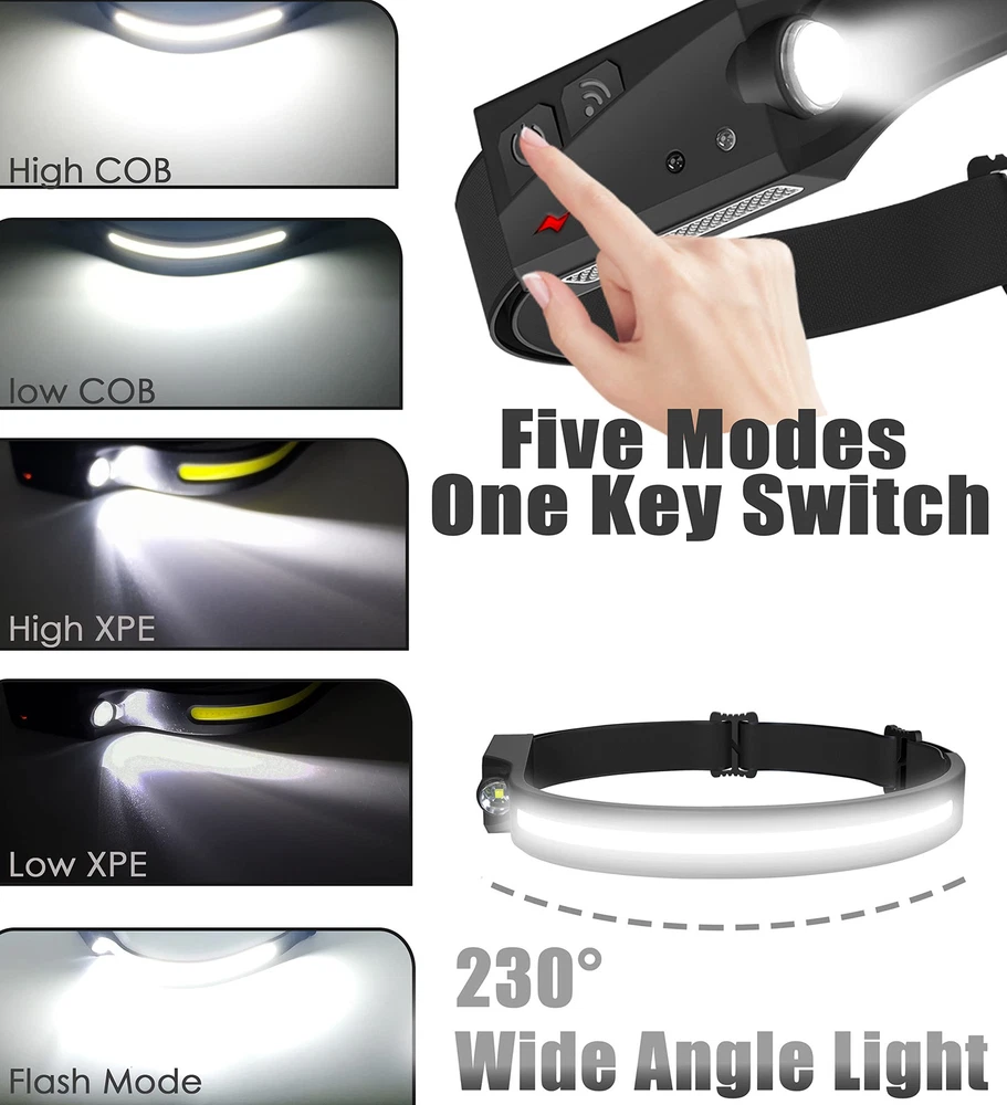 【Cob surface flood light source】: 3 mode level high low SOS, strong and soft light for choice according to your various lighting needs. Cob strap provide 230-degree wide vision illumination angle, wide illumination range, bright and not dazzling. 【2 light source Switch】: Front LED Cob strap for flood vision, side light spotlight vision. Simply press the button to switch between the 2 mode. The side light with projector for focus strong beam, can reach to 100 meters illumination. 【Lightweight and Convenient】: Lightweight hand free: the head light with soft silicone, lightweight, cotton elastic brand, length adjustable, comfortable to wear. Even if kids wear it, feel nothing. Hand wave sensing avoid hassle to find button while working. 【Easy to Charge】: Built in USB charging 1200ma battery,easy to charge with any USB port. Need to charge when the indicator show red. While charge the indicator show green. 【Hands free for working】: IPX4 waterproof headlamp, no worry in rainy snow weather. Suitable for maintenance work, outdoor sports, night cycling, night running, camping, night fishing, emergency situations, etc. One year hassle free in case of any quality issue to make your purchase risk fee.