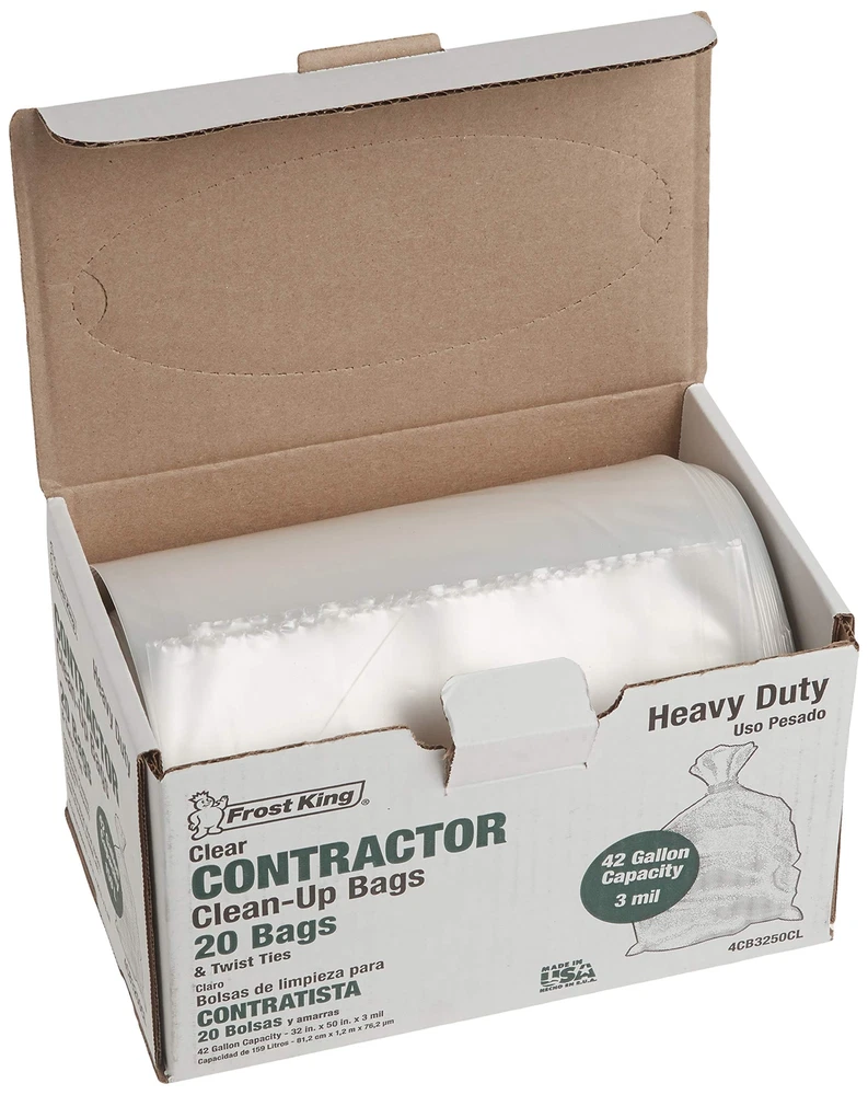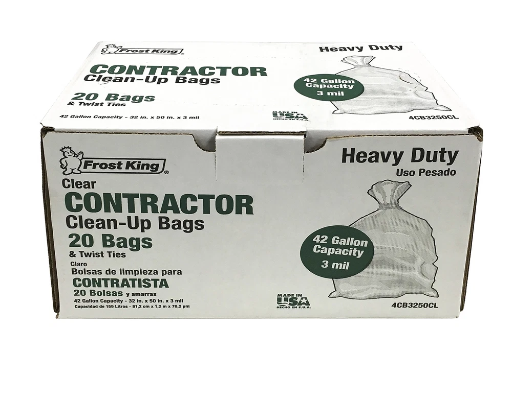 Product Description These 7-bushel-capacity Heavy Duty Contractor Bags will stand up to rugged use day in and day out. Great for hauling sharp, heavy trash around construction sites. On rolls for easy dispensing and storage. Fits 42 Gallons. Manufacturer Information 1-800-526-5265 42-gallon-capacity Heavy Duty Contractor Bags will stand up to rugged use day in and day out - 20 bags Great for hauling sharp, heavy trash around construction sites. On rolls for easy dispensing and storage Use for your toughest projects, including construction, plumbing, landscaping, carpentry and more Can handle wood, metal, rocks, cable, branches, drywall, etc.