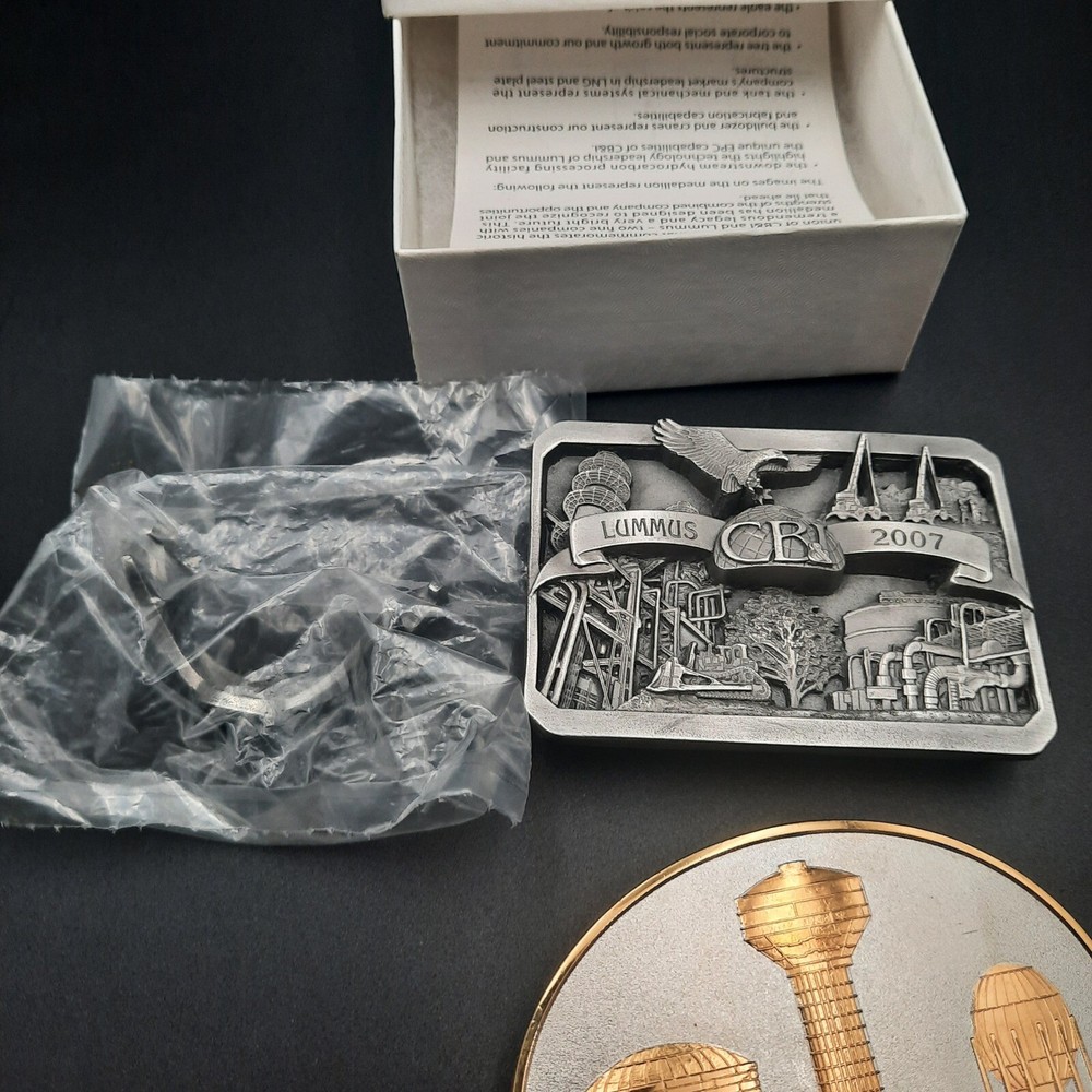 This detailed CB&I and Lummus belt buckle commemorates their 2007 partnership, marked by the engraved phrase "Joining forces to build the future." The buckle is crafted from a silver-tone metal with intricate raised industrial imagery and detailed logos. It features an oval front with a textured background and gold-tone accents, including the phrase "Working Safe Together" with industrial icons. The back is equipped with a sturdy clasp and loop for secure wear. This buckle is a perfect collectible for industrial enthusiasts or as a unique statement piece. Color: Gold Accents: Logo, Buckle, Medallion Type: Belt Buckle Department: Men Material: Metal, Zinc Alloy, Copper Style: Western Buckle Pattern: Solid Keywords: CB&I, Lummis, Belt Buckle, Working Safe Together, 2007, Limited Edition, Commemorative, Industrial, Collector's Item, Vintage Buckle
