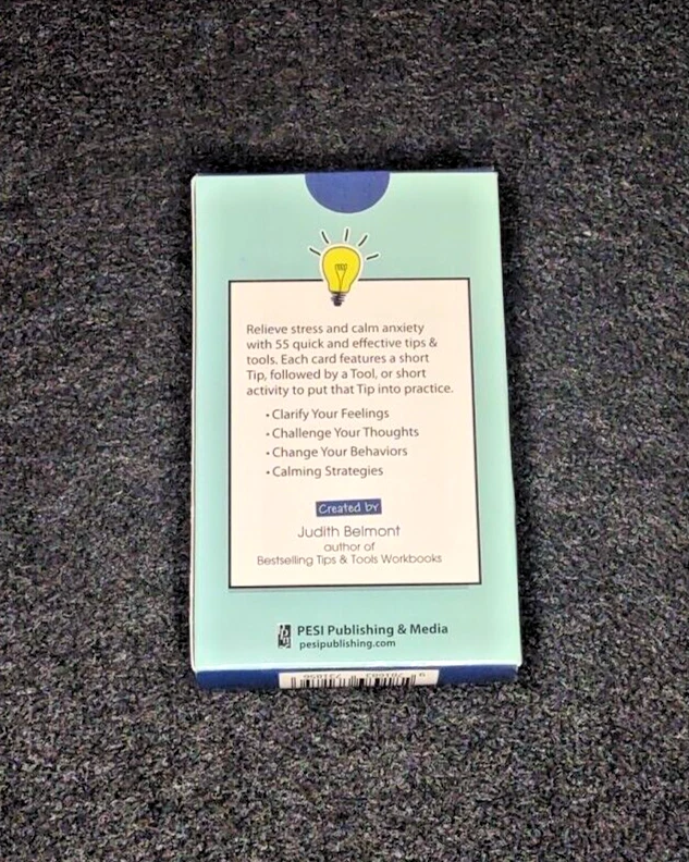 Relieve stress and calm anxiety with 55 quick and effective tips and tools. Each card features a short Tip, followed by a Tool, or short activity to put that Tip into practice. -Clarify Your Feelings -Challenge Your Thoughts -Change Your Behaviors -Calming Strategies