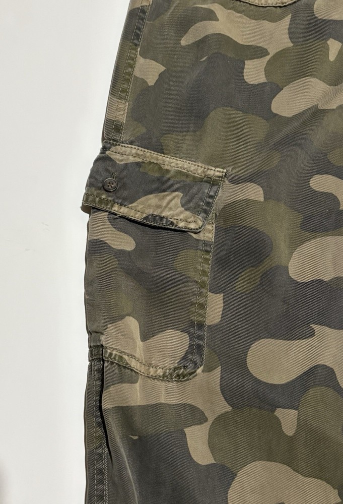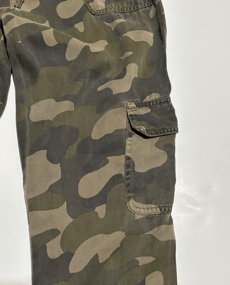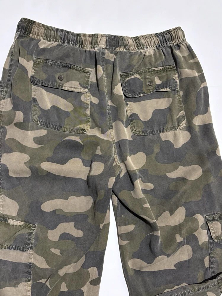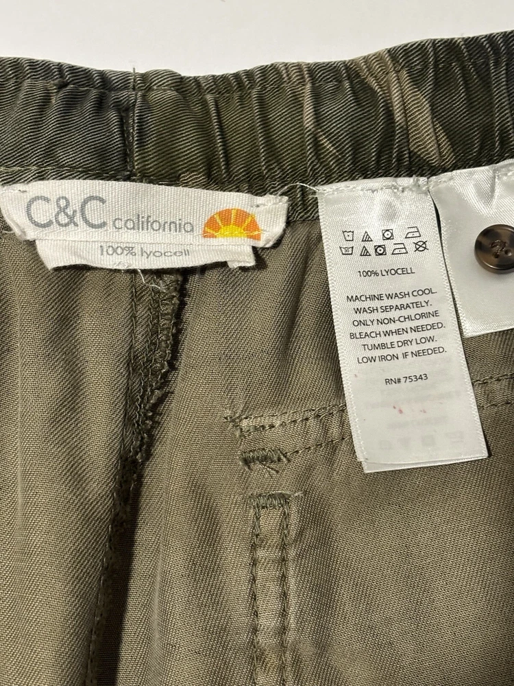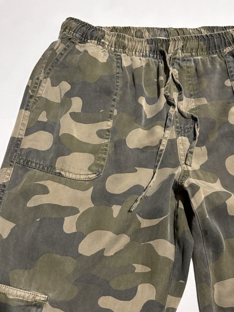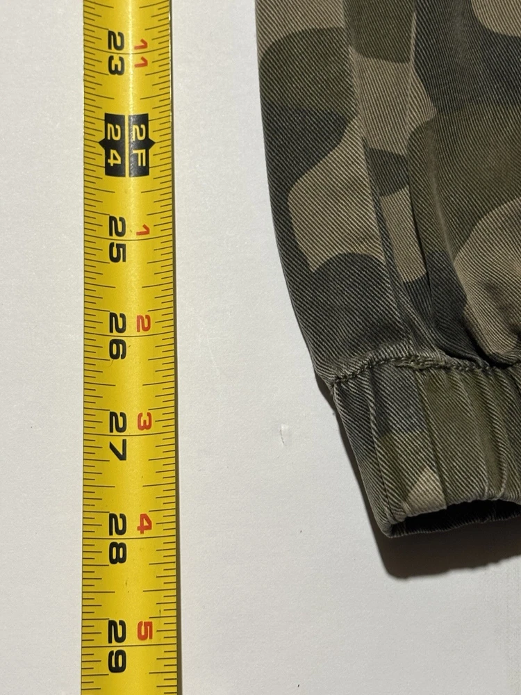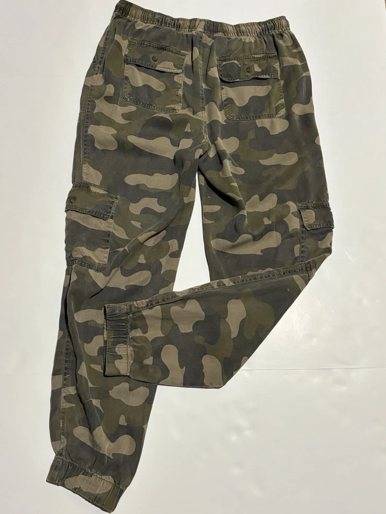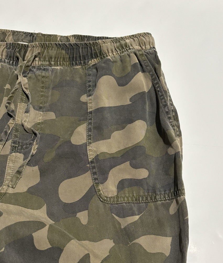 These C&C California jogger pants for women feature a camouflage pattern in green, with a drawstring closure and a waist size of 30 inches. Made of 100% Lyocell fabric, they are designed for comfort with an elastic waist and tapered leg style. Suitable for various occasions like travel, activewear, and casual wear, they also offer practical features such as pockets and breathability, making them ideal for outdoor activities in winter, fall, and spring seasons. AS IS, NO Flaws - Measuring 30" Waist and 28" Length Note: Missing size tag!