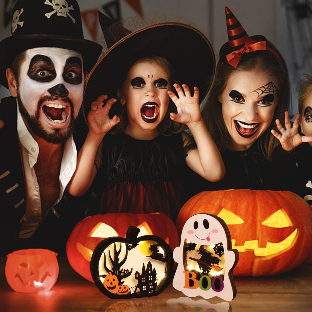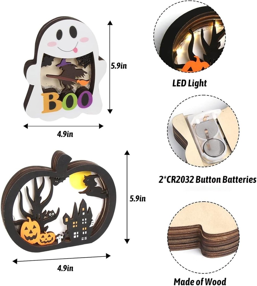 CCINEE 2pcs Halloween Lighted Wooden Table Decoration, Ghost Pumpkin Medium Product Details Package Dimensions: 5.91 x 5.12 x 2.13 inches Item Weight: 8.1 ounces Manufacturer: CCINEE Package Includes: You will get 2 pieces of Halloween boo letters wood signs in 2 different styles, the size is 5.9"×5.11". And the batteries are included. Durable Material: Our Halloween wooden table decors are made of premium wood material coated with eco-friendly paint, and the thickness is around 1.37inch, durable and not fade or deform wooden base to fix the table topper. Halloween Atmosphere: Happy Halloween centerpiece adopt cute designs, filled with classic Halloween elements like pumpkin, BOO, ghosts, witch, castle, bats and so on, vibrant colors of them can well add to the festive atmosphere in your home. Easy To Use: An ON/OFF switch at the back of the light for manual control. Just need 2*CR2032 button batteries(Included) and the lights come on.This Decorative Light is portable, it can be hung on walls and can make it stand on the table. Wide Application: Halloween table topper are suitable as cute table centerpieces for Tier tray decorations, also can put them on the office desk, shelf, counter, bedroom, coffee house, shop window for Halloween decorations. It can also be given as a Trick or Treat gift to families and friends.