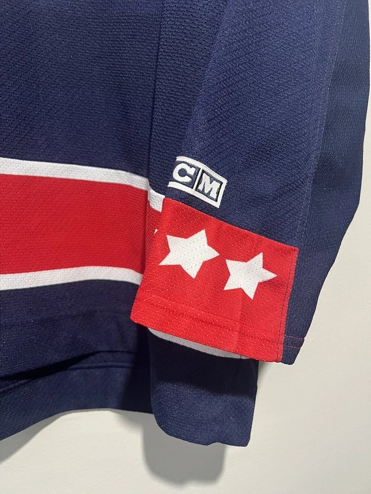 Show your support for the Columbus Blue Jackets with this vintage men's NHL hockey jersey by CCM. Made with high-quality materials, this jersey is perfect for any fan of the National Hockey League. The jersey features the team's iconic logo and comes in a size XL. Whether you're watching the game at home or cheering on the team at the arena, this jersey is sure to make a statement. It's officially licensed and perfect for regular season games. The 18 oz capacity ensures a comfortable fit, and the blue color is sure to turn heads. Don't miss out on the chance to own a piece of NHL history with this vintage hockey jersey.