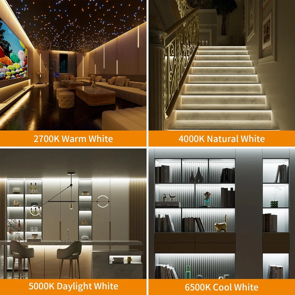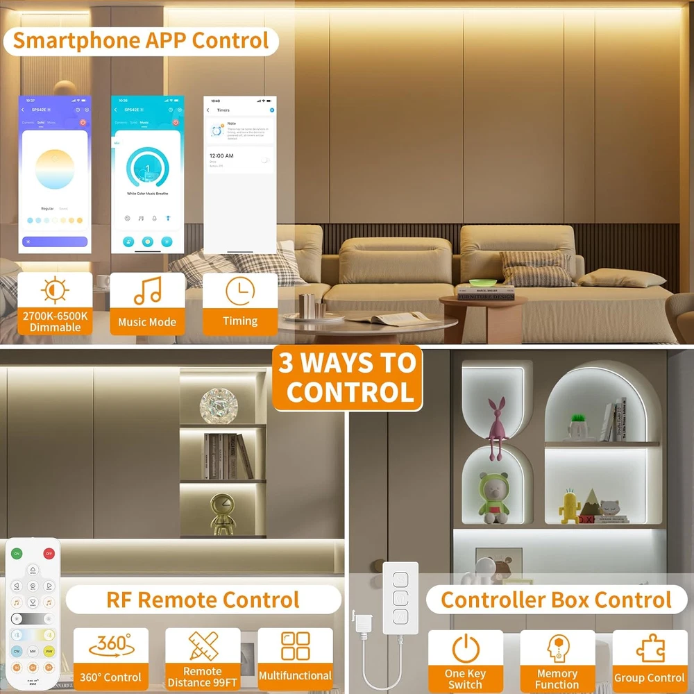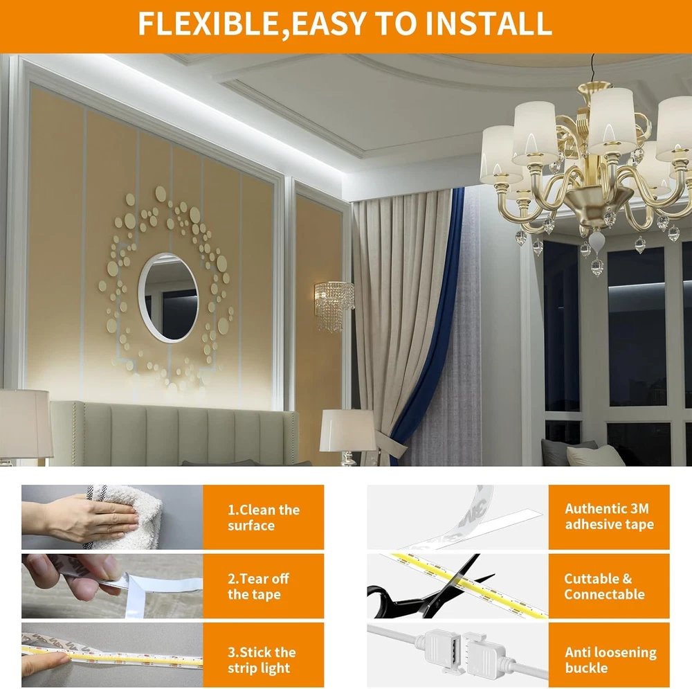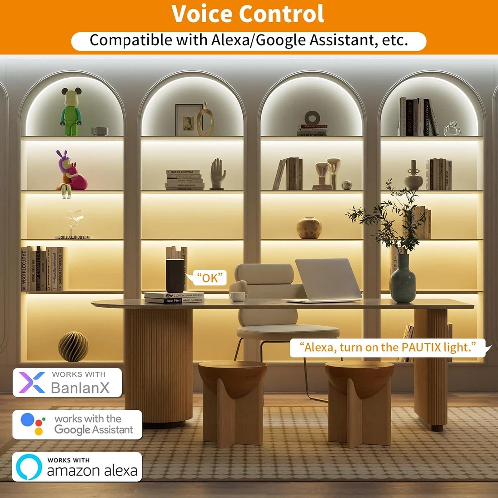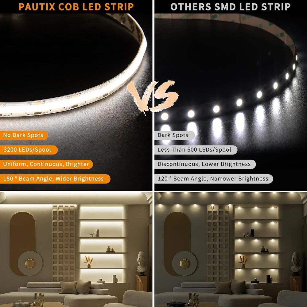 Store New Arrivals Add to Favorite View Feedback Contact Fast deliveries to the customer's home Quality customer service John Make the customers happy! CCT COB LED Strip Light White Tunable 3200Leds,Cri90+ 16.4Ft/5M Dimmable 2700K-6500K 24V LED Tape Lights Kit,Work with Alexa/Google Assistant,For under Cabinet Bedroom Kitchen DIY Lighting Description 【Tunable White COB LED Strip Light】Dimmable white light from warm white to cool white (2700K-6500K),whether you are relaxing or working,one light to meet all your needs! With 3200LEDs,PAUTIX Tunable COB led strip light creates super bright and even lighting performance.Anti slip buckle design, connection is not easy to loose 【The Highlights of COB LED Lights】180 degrees beam angle design for 50% wider lighting,multiple chips on board for uniform illumination,NO MORE worries about dark spot! Lower power, higher luminous efficiency,higher color rendering index(CRI>90) 【Group Control】You can create groups in the BanlanX APP, add multiple PAUTIX strip lights of the same kit to the APP and control them simultaneously. You can also use one remote to control multiple identical controllers by unlocking 1-to-1 pairing. (For unlocking methods, please refer to the user manual included in the controller package) 【Voice Control】Compatible with Alexa/Google Assistant/BanlanX. You can control your PAUTIX strip lights via voice commands by simply adding BanlanX to Alexa/Google Assistant. You can call Alexa/Google Assistant to turn on/off your PAUTIX strip light at any time, and even control its brightness/color temperature with your voice. Built-in music mode, let your lights keep rhythm with the music! 【DIMMABLE and DIY】Upgraded RF Remote is 360°multi-directional,you don't need to pointed directly at the receiver like IR remote,you can choose different color temperature and brightness.With stronger 3M adhesive and flexible design,PAUTIX Tunable COB led strip light can be reliably installed on clean/dry/smooth surface(The width of CCT strip is 10mm, please use PAUTIX 10mm CCT connectors "B0B659F5WB" to connect or solder with 3 wires) 【Widely Use & Durable】PAUTIX Tunable COB LED Strip light is ideal for high-end business clubs,under cabinet,dressing mirror,make-up table,closet,bookshelf,wine shelf,TV backlight and other places need decoration. Real double-layer PCB board and high-quality materials make PAUTIX COB led strip light durable,the lifespan is more than 65,000 hours 【What You Get】1 x PAUTIX 16.4ft Tunable White COB LED Strip, 1 x 24V/2A Power Supply,1 x RF Remote Controller, 1 x Controller Receiver,1 x User Manual.We provide lifetime customer service. Please feel free to contact PAUTIX if you encounter any problems while using the product! Product Description ACCESSORIES & RELATED PRODUCTS Add to Cart Add to Cart Add to Cart Add to Cart Add to Cart Add to Cart Add to Cart Customer Reviews 4.0 out of 5 stars 46 4.2 out of 5 stars 5 4.3 out of 5 stars 267 4.3 out of 5 stars 135 4.5 out of 5 stars 646 4.4 out of 5 stars 216 4.2 out of 5 stars 77 Price $9.99 $ 9 . 99 $13.99 $ 13 . 99 $59.99 $ 59 . 99 $49.99 $ 49 . 99 $43.99 $ 43 . 99 $24.99 $ 24 . 99 $39.99 $ 39 . 99 Color / White 2700K-6500K CCT Tunable White RGB Full Color(Addressable) 4000K/Natural White RGB Full Color Addressable RGB Full Color Length / / 32.8ft/10m 16.4ft/5m 24ft/7.5m 16.4ft/5m 24ft/7.5m Number of LED / / 6400 LEDs(640 LEDs/m) 3150 LEDs(630 LEDs/m) 3780 LEDs(504 LEDs/m) 3150 LEDs(630 LEDs/m) 6300 LEDs(840 LEDs/m) Waterproof Grade IP30(Non-waterproof) IP30(Non-waterproof) IP30(Non-waterproof) IP30(Non-waterproof) IP30(Non-waterproof) IP30(Non-waterproof) IP30(Non-waterproof) Brand PAUTIX PAUTIX PAUTIX PAUTIX PAUTIX PAUTIX PAUTIX HIGH QUALITY, CHOOSE PAUTIX 1 Voice Activation 2 Music Mode & Dynamic Mode 3 Timing & Memory Function 4 Group Control 5 How to Connect with Alexa 1 Bedroom/2700K 2 Bathroom/3000K 3 Wardrobe/4000K 4 Cabinets/5000K 5 Living Room/6500K 1 Strong 3M Adhesive 2 No Flicker 3 UL Listed 4 High CRI 90+ 5 Cuttable & Connectable 1 Connection Diagram 2 How to Connect to BanlanX 3 Remote Instructions PRODUCT PARAMETERS Operating Voltage DC24V Measured Power Max. 20W/m(Measured with two channels); 10W/m for one channel; The measured power is 41W for 16.4ft. It is normal that the measured power will be lower than the theoretical power due to the effect of voltage drop. Length 16.4ft/5m Width 10mm(0.39in) CRI 90+ Number of LED 3200 LEDs(640 LEDs/m) Color Temperature 2700K-6500K CCT Tunable White Luminous Flux 100-120 Lumen/w SDCM ≤3 Cutting Unit 25mm/0.98in Control Method RF remote control; APP control; Control box one key switch; Voice control. Support one-to-many control; Group control Controller Information Model: PAUTIX SP542E; Input voltage: DC5-24V; Single channel maximum output is 2A,the total output of two channels is 4A/96W(DC24V). So you can only use this controller to drive up to 90W of strip lights. Please be sure to replace a controller with a higher output if the total power of the strip light exceeds 90W. UL-Listed Yes Type of Strip COB(chip on board) Packing List 1 × 16.4FT CCT COB LED strip light; 1 × RF remote; 1 × Control box; 1 × 24V 48W white power supply; 1 × User manual Brand PAUTIX Item model number S640F010W24-COB-CCT-5M-SP542E Light Source Type COB Style Modern Number of Items 1 Power Source Corded Electric Number of Light Sources 3200 Country of Origin China Theme Christmas, Halloween, Thanksgiving Style Number S640F010W24-COB-CCT-5M-SP542E Controller Type Remote Control, App Control, Button Control, Voice Control Connectivity Protocol Bluetooth, Wi-Fi Occasion Type Christmas Seasons All Seasons Additional Features Dimmable,2700K-6500K White CCT Tunable,Voice Control,Group Control,Music Mode Package Dimensions 5.91 x 5.43 x 2.6 inches; 14.39 ounces White Brightness 4200 Lumens Indoor/Outdoor Usage Indoor Material Type Polyester Light Color 2700K-6500K Water Resistance Level Not Water Resistant Occasion Christmas 