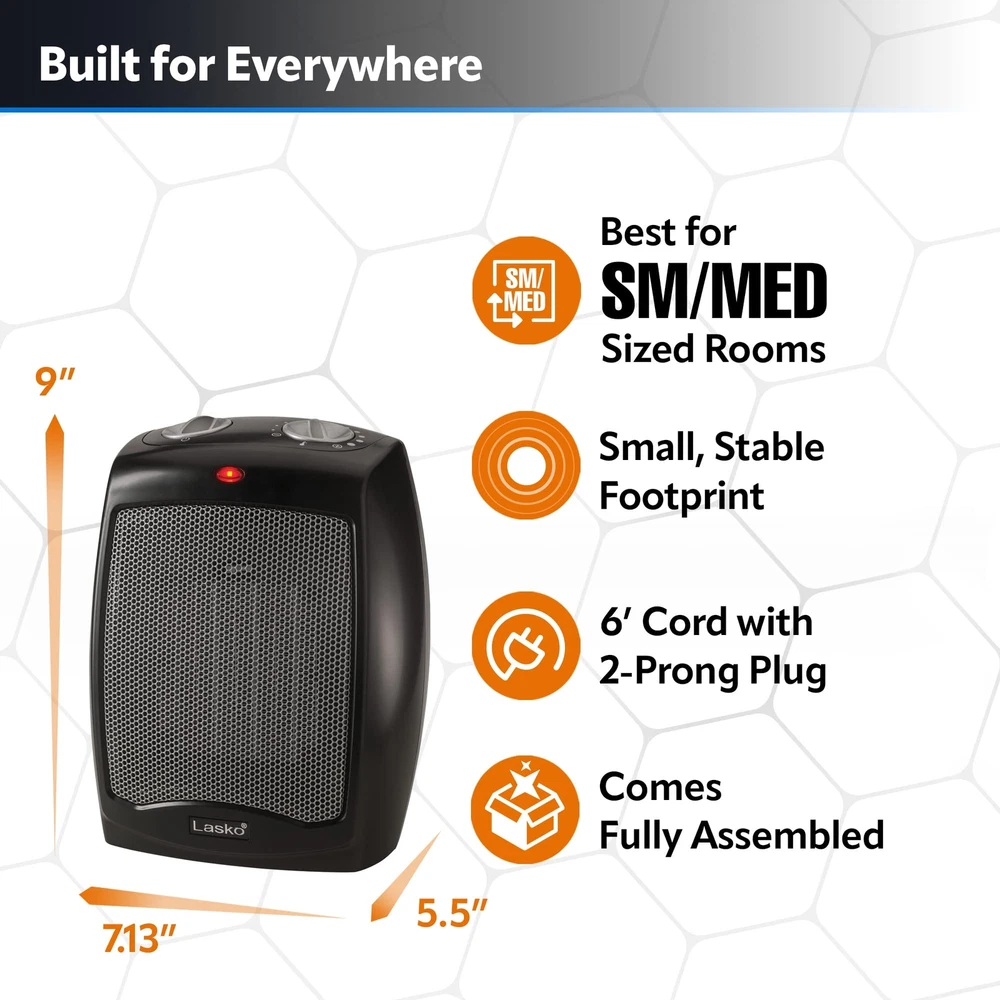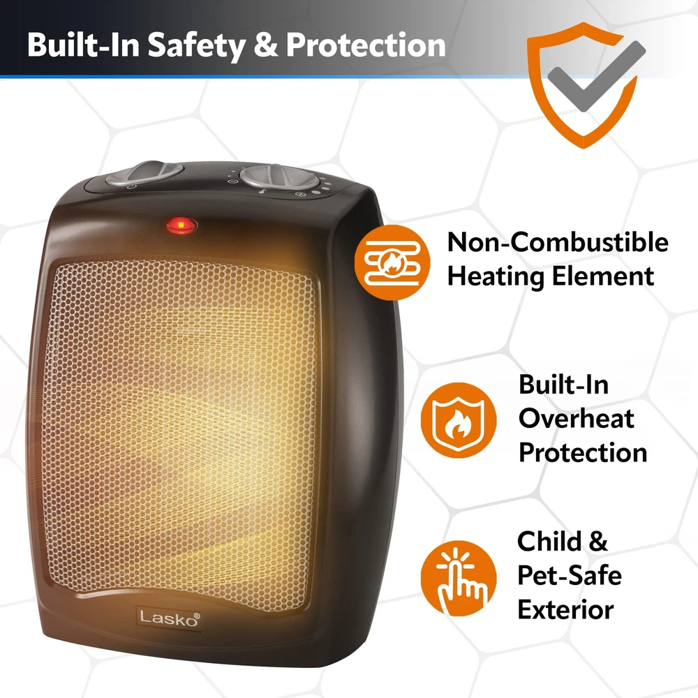 This compact space heater from brings 1500 watts of comforting warmth to your room. A classic design in black with easy to use manual controls and built-in safety features, plus adjustable thermostat for personalized comfort. Two convenient knobs located on the top of the heater allow you to set the adjustable thermostat to your desired temperature and select from 3 quiet settings; high heat, low heat, or fan only. ✅【3 QUIET SETTINGS】Including high heat, low heat, and fan only make this electric space heater ideal for warming up an area in your home or home office. Combined with an adjustable thermostat This personal space heater is great for small areas. ✅【ADJUSTABLE THERMOSTAT】Allows you to adjust the heater's 1500 watt ceramic heating element. With 11 different temperature settings you're sure to find a comfortable setting. Simply turn the dial to the heat setting you desire and enjoy comforting heat. ✅【CONVENIENT CARRY HANDLE】The built-in handle makes it easy to move the space heater. Thanks to the heater's compact Size and convenient carry handle you can easily move the heater from the kitchen, to the bedroom, or under the desk. ✅【BUILT-IN SAFETY FEATURES】Overheat protection ensures the space heater does not overheat even if left on for an extended amount of time. The space heater also features a cool-touch exterior. This allows the space heater's body to stay cool even when it's on high. For added safety, this portable space heater is ETL Listed. ✅【FULLY ASSEMBLED】Allows you to take the heater out of the box and have it working it minutes. Simply plug the heater into a wall outlet, select your desired heat and thermostat settings, and enjoy the warmth from your new space heater.