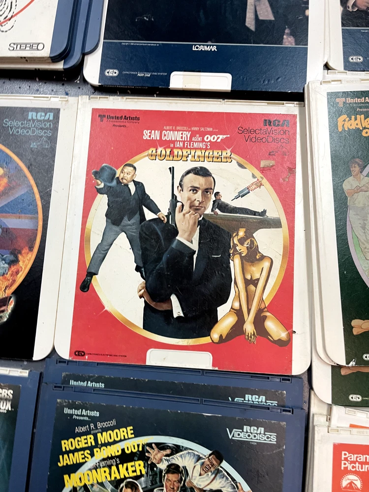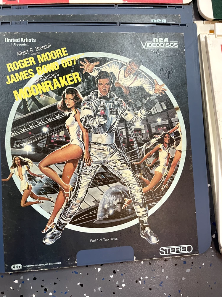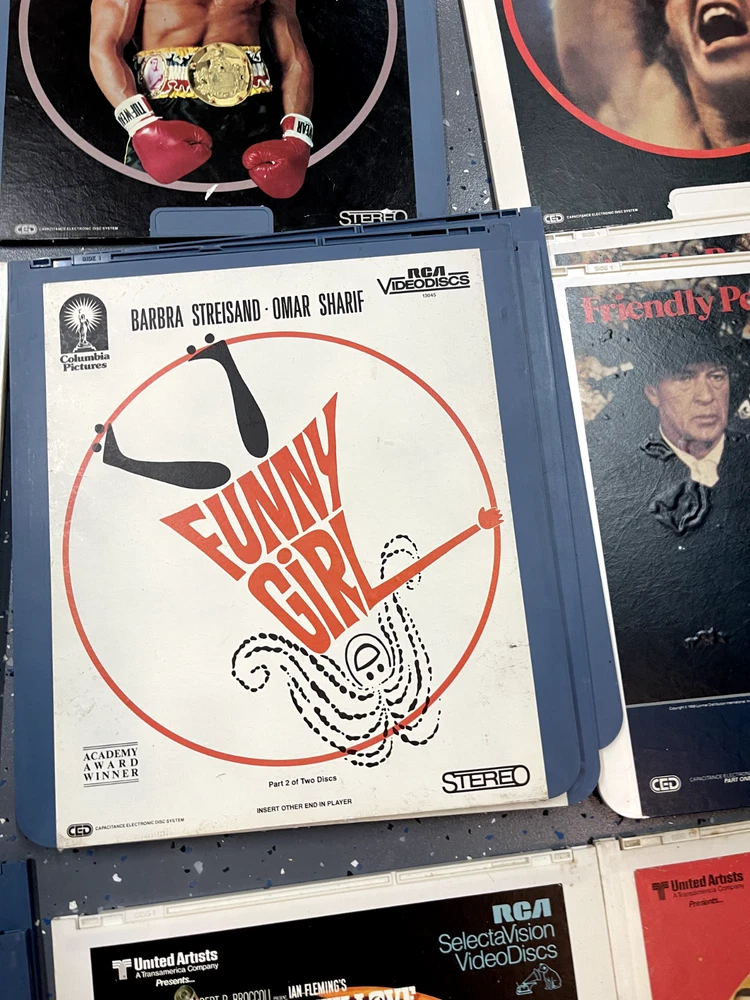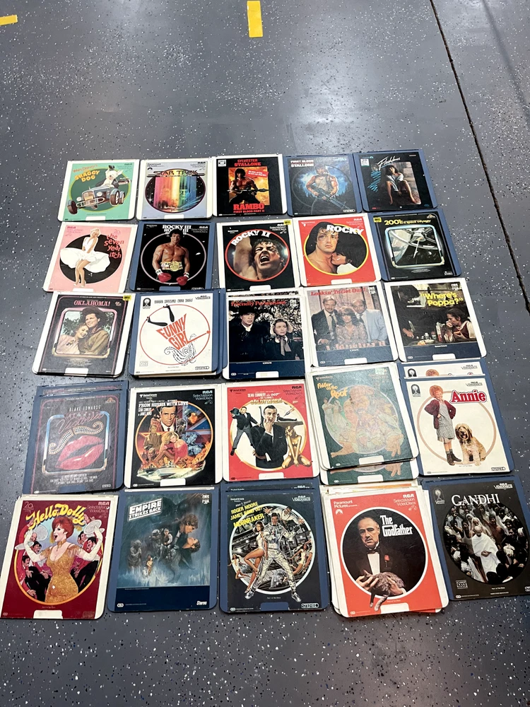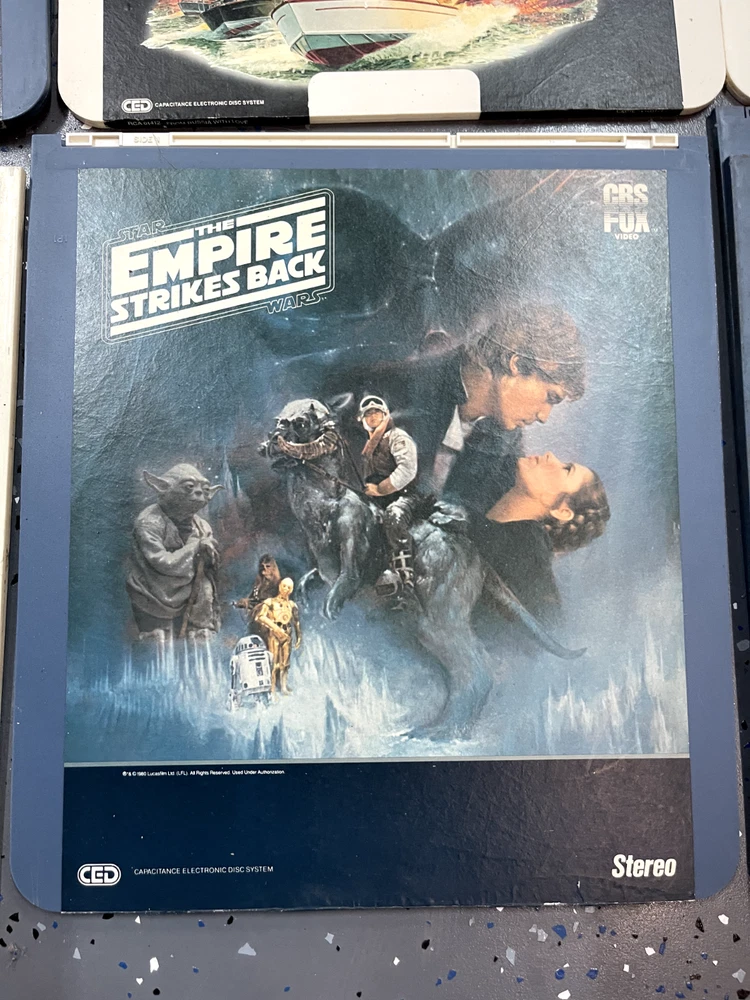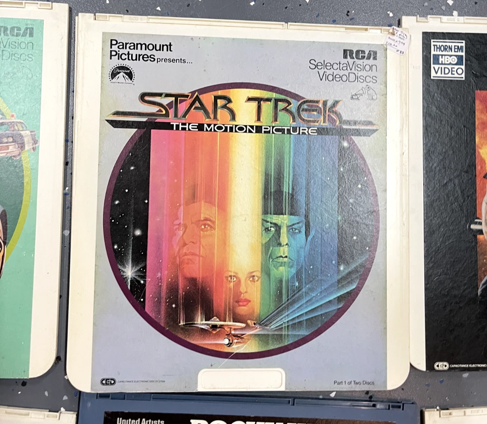 The product is a CED Selectavision Video Disc featuring a selection of SciFi, Action, and Drama movies such as Star Trek Empire strikes back, Rocky and Rambo. It allows you to choose your own movie from a variety of genres including Western, Musical, and Comedy, produced by Walt Disney Studios.