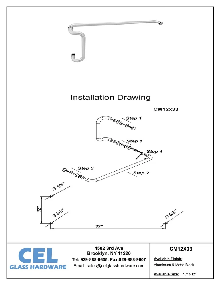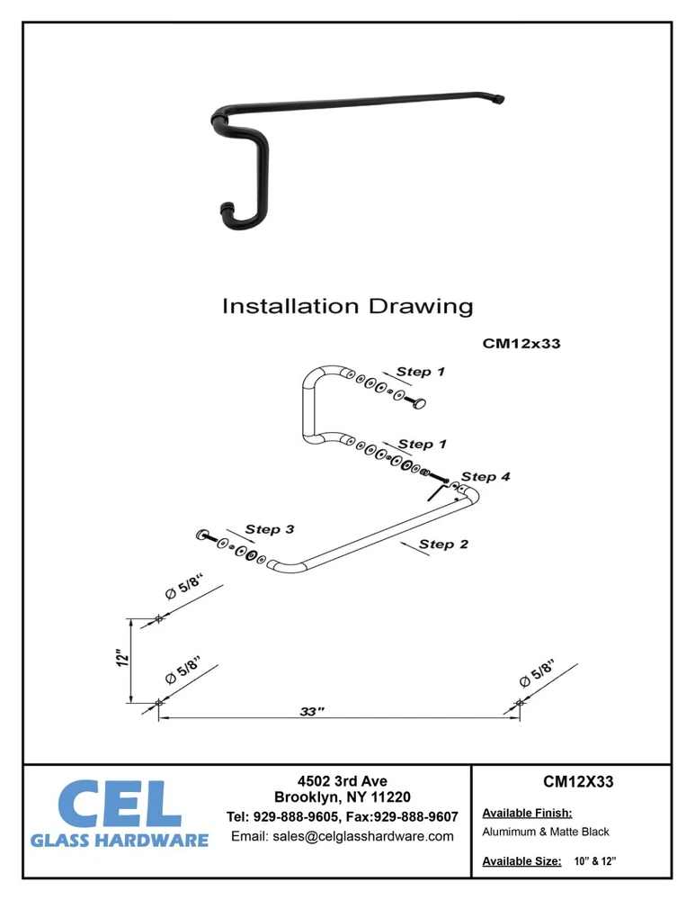 This CEL Round Solid Aluminum Storefront Door Pull Handle and Push Bar Set is the perfect addition to any entrance. Made with high-quality aluminum material, it is a durable and long-lasting option for those in need of a new door handle and push bar set. The clear anodized and dark bronze color options allow for a sleek and modern design that will complement any room. CM12X33 CEL Round Solid Aluminum Storefront Door Pull Handle and Push Bar Set - 12"X33" Handle Size: 12" Center to Center Bar Size: 33" Center to Center Glass Thickness: 1/4" to 1/2" Material: Aluminum Weight: 5lb ***** THIS IS HEAVY DUTY ***** Fits : Glass and Aluminum Doors Our wholesale store and warehouse are located at Brooklyn, NY. If you are looking for lot purchase or specific length or color that are not listing here; please kindly message me! We are looking forward to do business with you!
