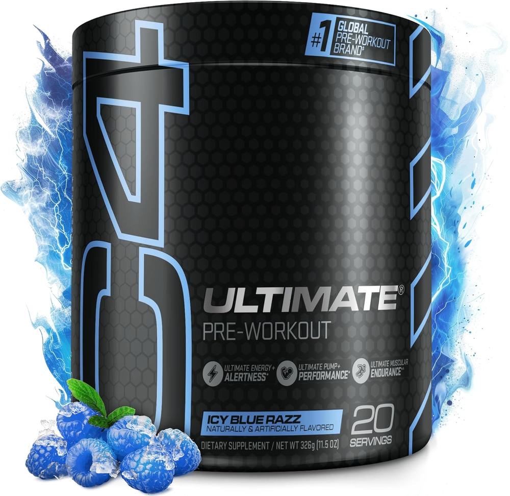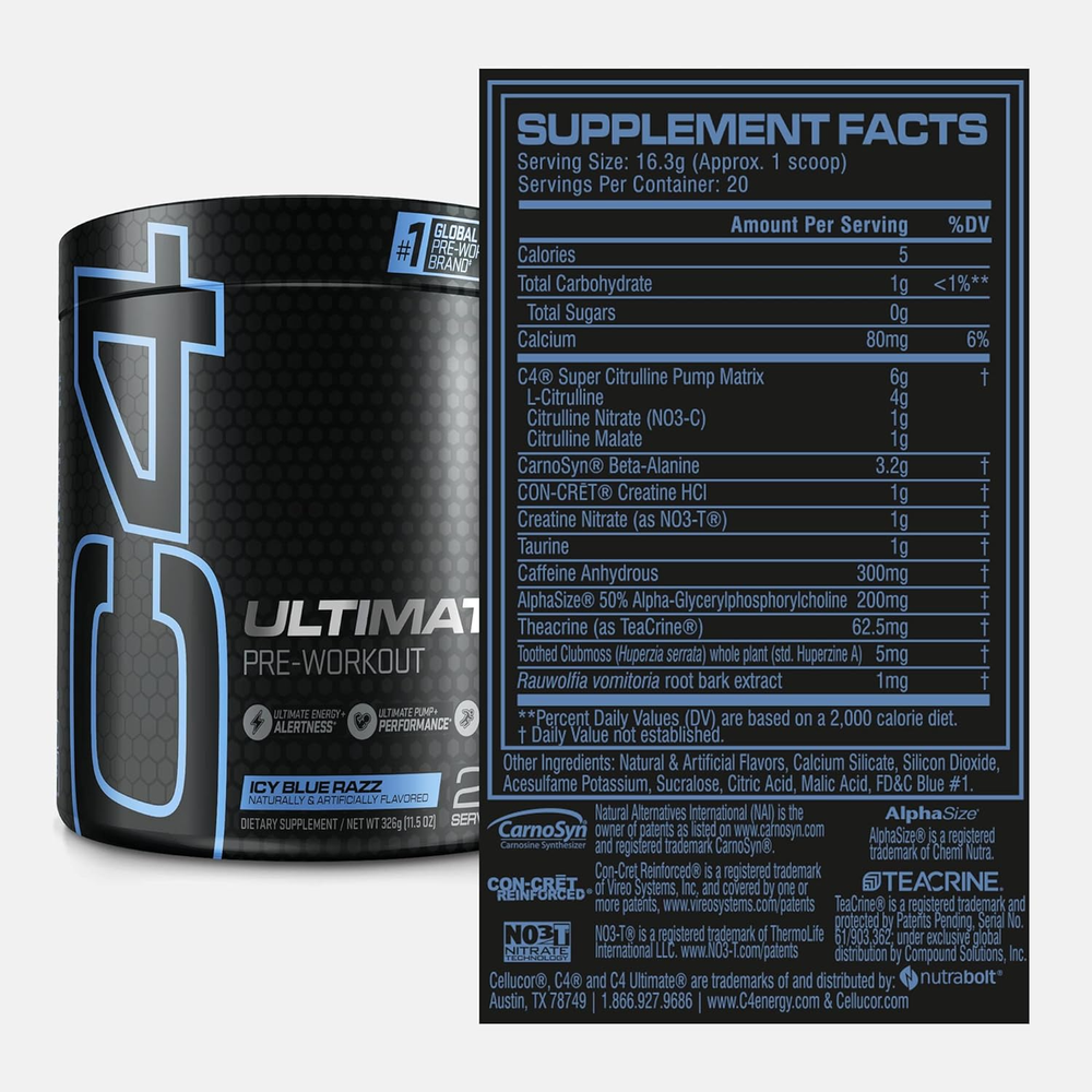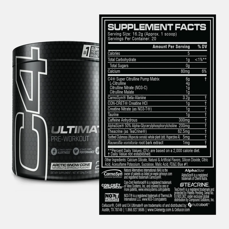 Make your training hit harder than ever with the revamped C4 Ultimate – tailored for workout warriors who demand nothing but the best. Our new Tri-Stim formula packs a potent punch of 300mg of Caffeine, TeaCrine®, and Dynamine™, for the ultimate high-stim energy experience that makes your old PR feel like your new warmup weight. Next up, PeptiPump®, an AI-powered designer peptide exclusive to C4, boosts performance while Tyrosine and Huperzine A keep you in the zone for a strong mind-muscle connection. Leave no reps in the tank with enhanced muscular endurance from CarnoSyn® Beta-Alanine*, BetaPower®, and the patented Velox® Performance Blend for hard-hitting pumps and enhanced performance. Experience the pinnacle of pumps, energy, and focus with the newly enhanced C4 Ultimate - backed by the 20-year legacy of C4's innovation in sports nutrition.* ^Studies have shown benefits of CarnoSyn® Beta-Alanine to be correlated with cumulative use. Key Features: TRI-STIM ENERGY: Experience unstoppable energy with our tri-stim blend of 300mg Caffeine + TeaCrine® + Dynamine™.* HARD HITTING PUMPS: Made with VELOX®: a patented mix of L-Arginine + L-Citrulline for seriously satisfying pumps & performance.* MUSCULAR ENDURANCE^: Smash through plateaus and keep hitting harder with enhanced muscular endurance from CarnoSyn® Beta-Alanine + BetaPower®.* ENHANCED MENTAL FOCUS: Get in the zone for a strong mind-to-muscle connection with Tyrosine + Huperzine A + Caffeine.* AI-POWERED PEPTIDES: PeptiPump® is an AI-powered designer peptide exclusively found in C4.* C4: Backed by 20 years of sports nutrition expertise, we’ve raised the bar with an innovative selection of supplements. Ingredients: 300mg Caffeine: Ultimate energy + enhanced focus.* Dynamine™: Compliments Caffeine to help support increased energy. * TeaCrine®: Supports increased energy, mood, and focus when in combination with Caffeine.* Huperzine A: In conjunction with Caffeine, supports enhanced focus.* Tyrosine: Supports cognitive function under physical stress.* Velox® Performance Blend: A patented combination of L-Citrulline and L-Arginine designed to support performance, pump, and recovery.* CarnoSyn® Beta-Alanine*: Clinically studied ingredient that helps support muscular endurance and combat muscular fatigue.* BetaPower®: Clinically studied ingredient naturally derived form of betaine, from beets, that helps maintain muscle cell hydration.* Creatine Nitrate (NO3-T®) : Supports increased pump and training performance.* PeptiPump® Bioactive Lentil Peptides: Used in combination with VELOX® Performance Blend and Creatine Nitrate to support increased pump and training performance.* ^Studies have shown benefits of CarnoSyn® Beta-Alanine to be correlated with cumulative use.