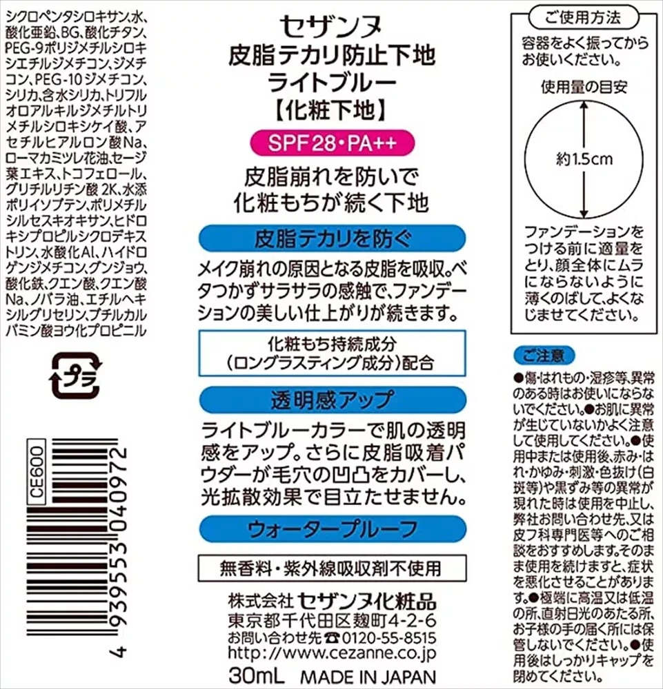 Size/Dimensions: 30ml Brand: CEZANNE Material: Anti-sebum formula Features: Anti-shine base, reduces oil and shine Size: Light Blue Country/Region of Manufacture: Japan Type: Does not apply