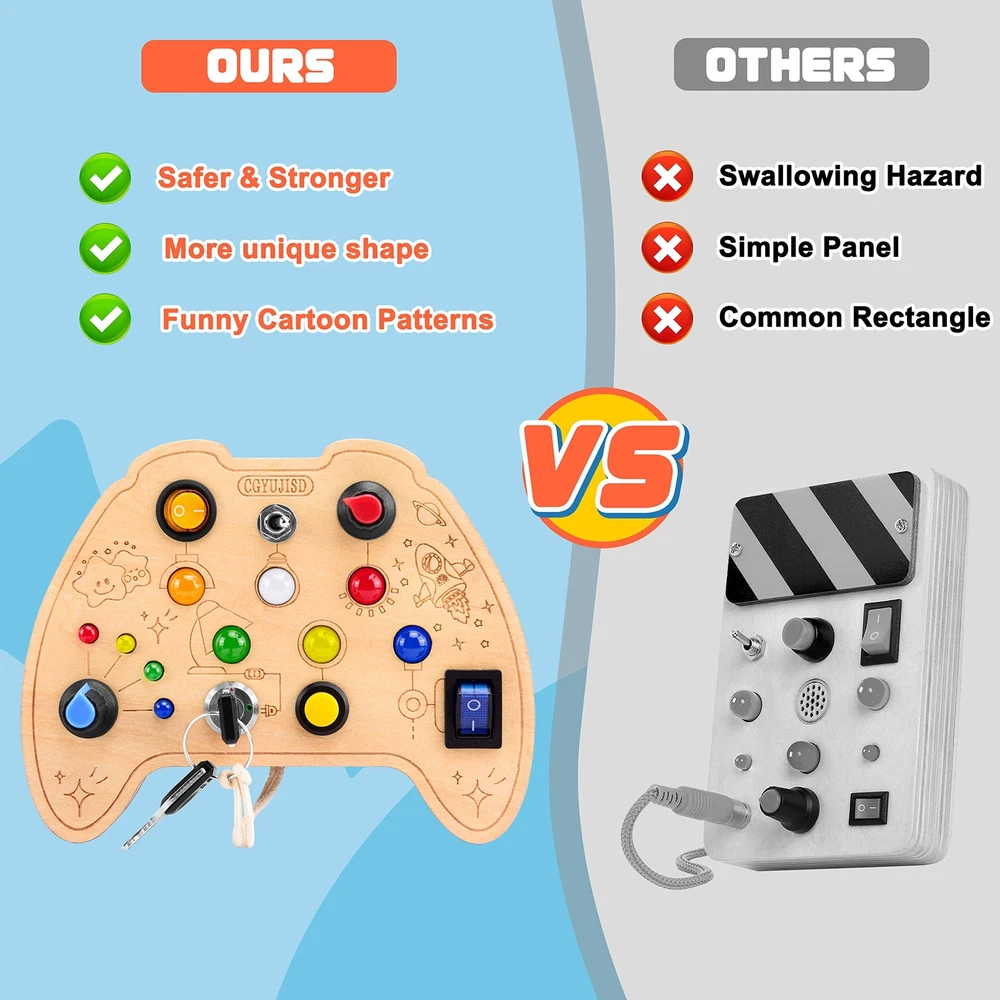 CGYUJISD Busy Board Montessori Toys for Toddler, Wooden Sensory Toys Light Switch Travel Toys-Preschool Educational Learning Activities Toys-Gifts for 1+ Year Old Baby and Toddler CGYUJISD Montessori Busy Board for Toddler, Cute Pattern Wooden Sensory Toy for Autistic Children for 3+ Year Old Boys and Girls WELL DESIGNED: This busy board is specially designed for toddlers who love switches and LED lights. It has 7 different switches and 10 LED lights, and each switch corresponds to a different color or style of LED light. Each LED is adjusted to the brightness suitable for your baby without dazzling LEARN & PLAY: The toddlers could use this toddler busy board to recognize different colors and switches. The sensory toy could exercise baby's thinking ability and hands-on ability. This Montessori Busy Board is a perfect birthday Christmas gift for kids SIZE & SUITABLE: CGYUJISD busy board is 5.4"L x 4.3"W x 2.2"H. This montessori toy for 3+ year old is great at home, on the plane, in the car, and while traveling, and it's a nice travel toy that will allow your little one to calm down and do their own thing SAFE TOY: Each baby busy board is carefully ground by hand to ensure a smooth surface, it doesn't have sharp edges or any small parts that come off easily so that don't have to worry about your baby breaking it CUSTOMER SATISFACTION GUARANTEE: If your child doesn't like it, just return for a complete refund! Wish you a great day Shipping from the USA All of our products are shipped from the USA, ensuring quick delivery to your destination. Payment We offer the following payment methods: PayPal, credit card, bank transfer, and eBay's secure payment system. Free Shipping & Free Returns Shipping within the USA is FREE. Additionally, any return is absolutely free for you. Risk-Free Purchase You have the option to return an item within 30 days without any justification. We cover the return shipping costs! Fast Shipping We ship immediately upon receipt of payment. Generally, the package is delivered within 2-3 days in the USA. If it takes longer, we will contact you. Quality and Costs Made in Europe, USA, China No customs fees or additional charges Total satisfaction guarantee Invoice with declared VAT available upon request in .pdf format Feedback Your feedback is very important to us. After you pay for your purchase, you will automatically receive positive feedback from us.