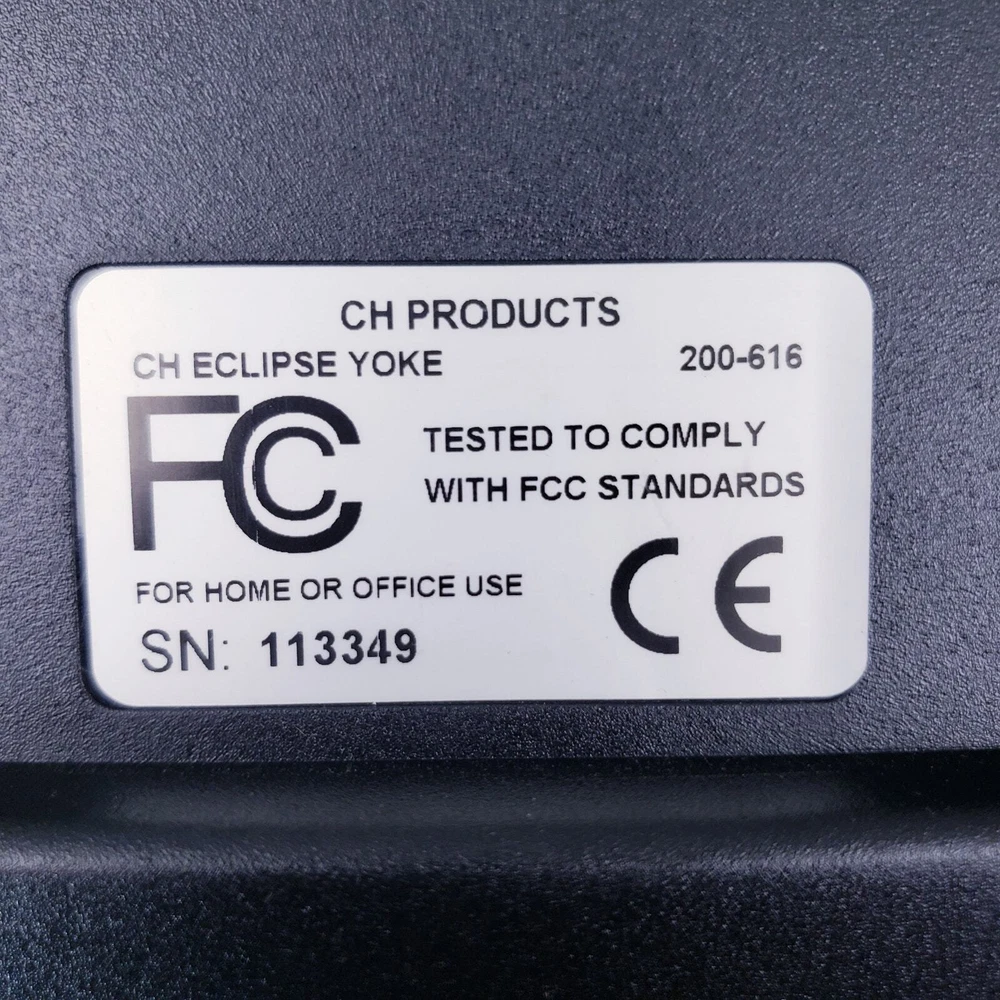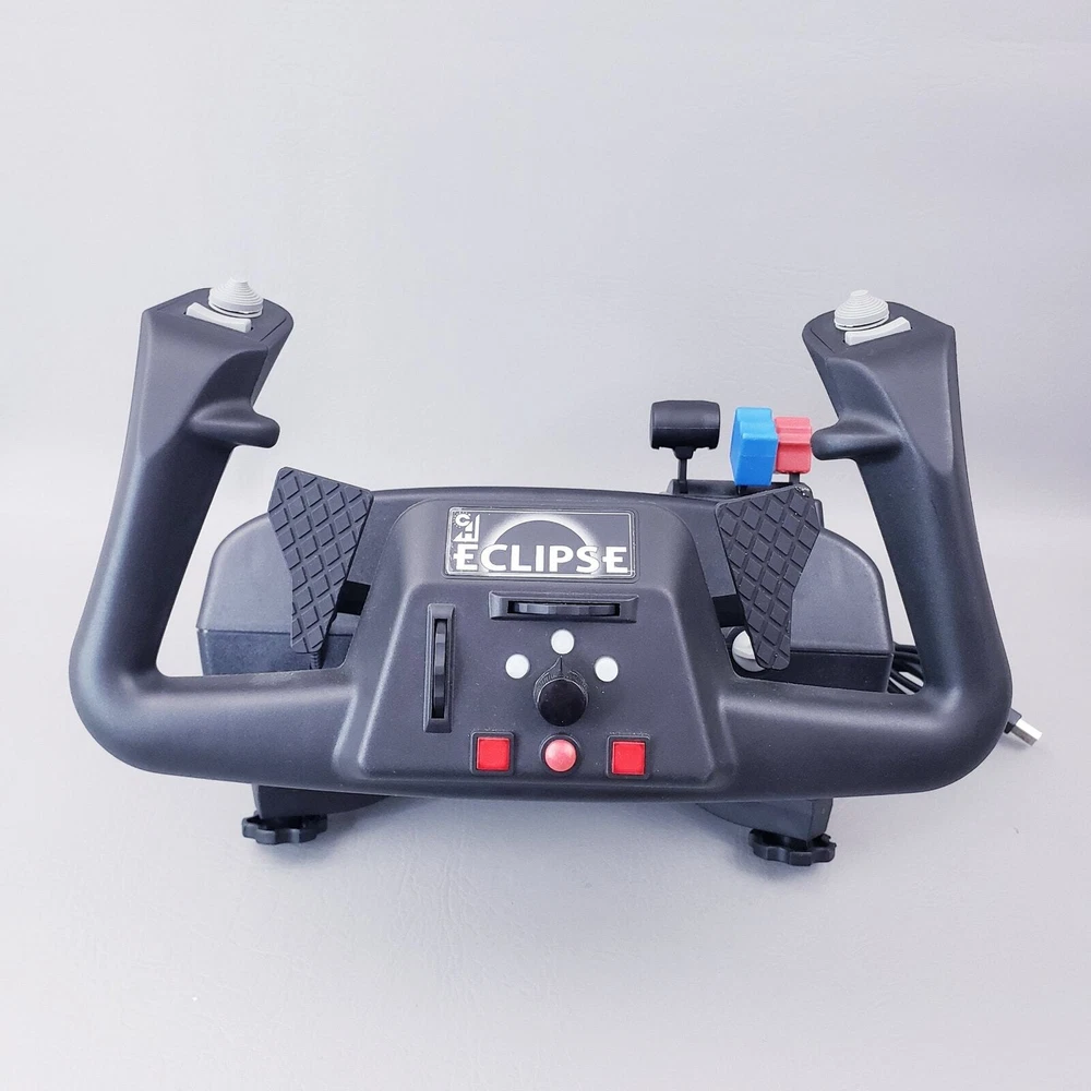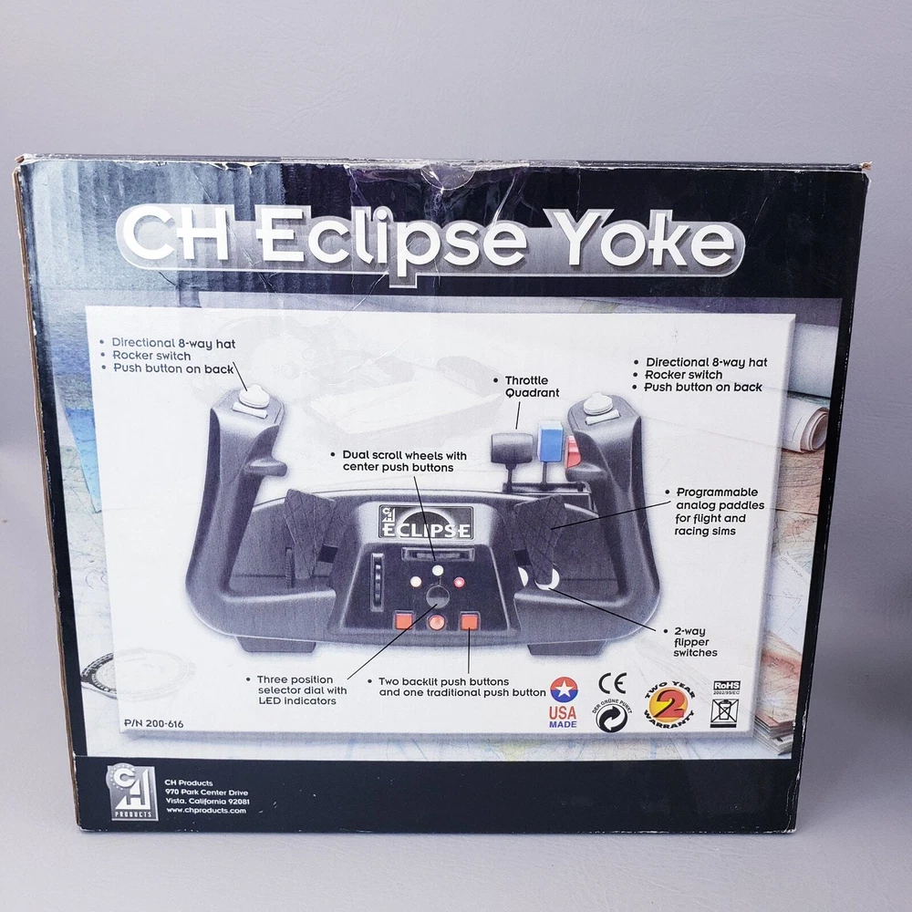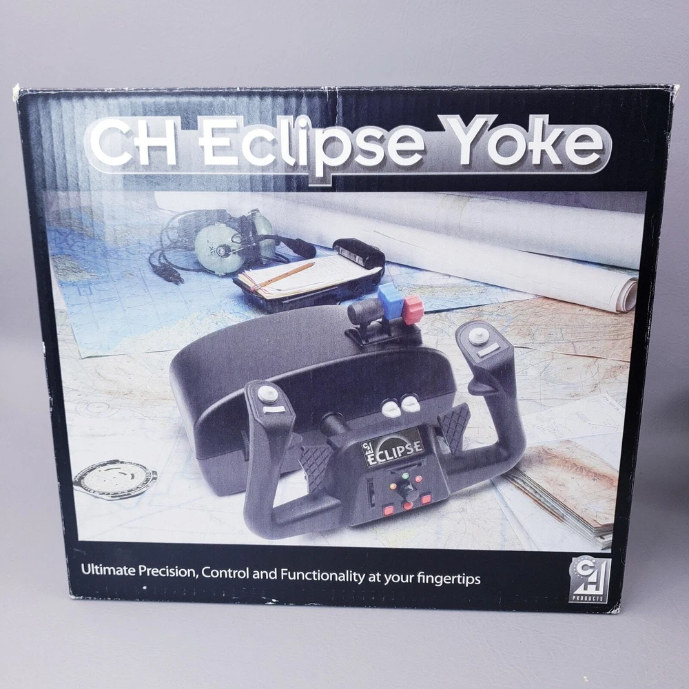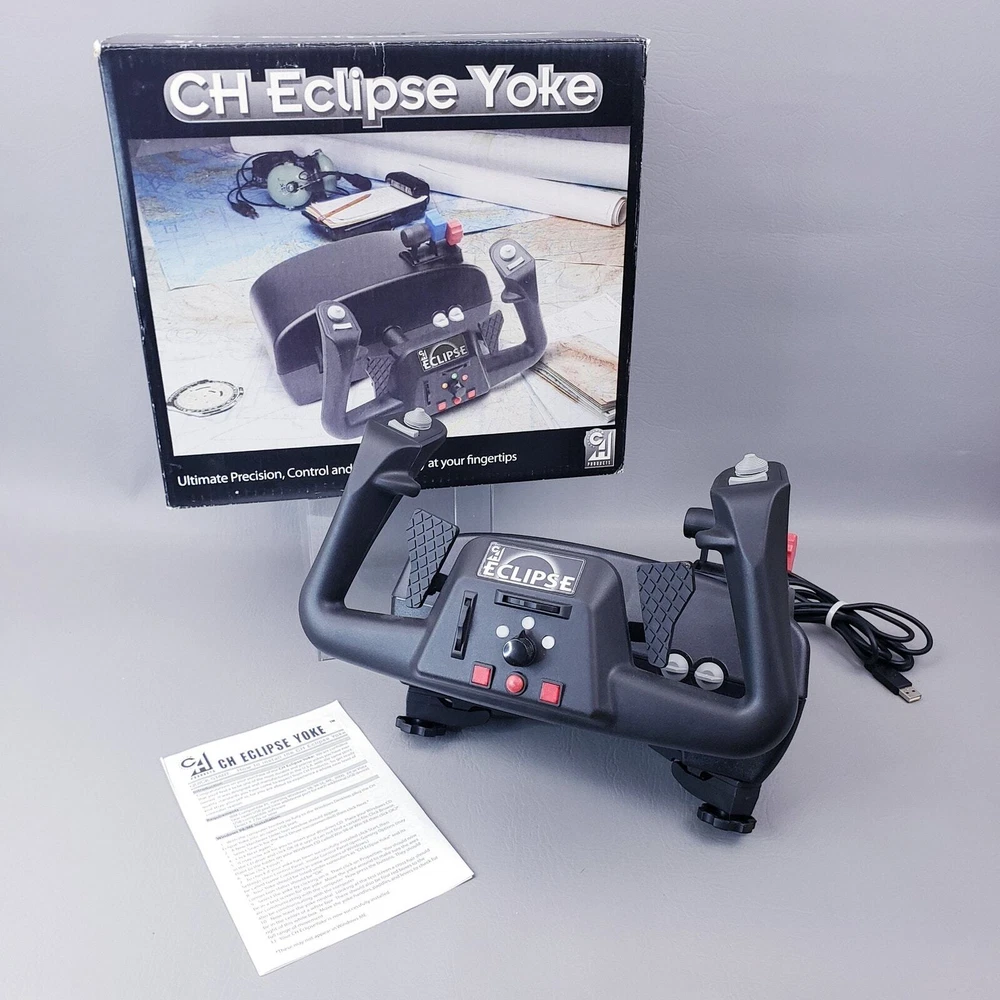 CH PRODUCTS Eclipse Yoke Flight Controller 200-616 for USB PC in Original Box Very good pre-owned condition. Unused and untested, all buttons and levers move as they should. YokeWindows and Mac Compatible Mac OSX Compatible (CH Control Manager software for custom programming is not Mac compatible) Fully Programmable Fingertip Paddles: ideal for flight and racing sims 8-way POV hat and rocker switch on both left and right side of grip Programmable Trim/Scroll Wheel with center push function Three color LED selector dial Two backlit push buttons and third traditional push button Two 2-way flipper switches on base Two traditional push buttons on back of each grip 6 analog 10bit axes, traditionally used for: – Aileron – Elevator – Throttle – Propeller Pitch – Fuel Mixture – Rudder Colored handles for Throttle/Prop/Mixture New and Improved Industrial grade material and components Free Floating, non-binding shaft Adjustable clamps recommended for desks 3/4" to 2 1/4" inch thick Ergonomic Yoke handles with realistic in and out movement Large sturdy mounting base with 7 foot USB cable Plug and Play driverless USB installation Thank you for looking!