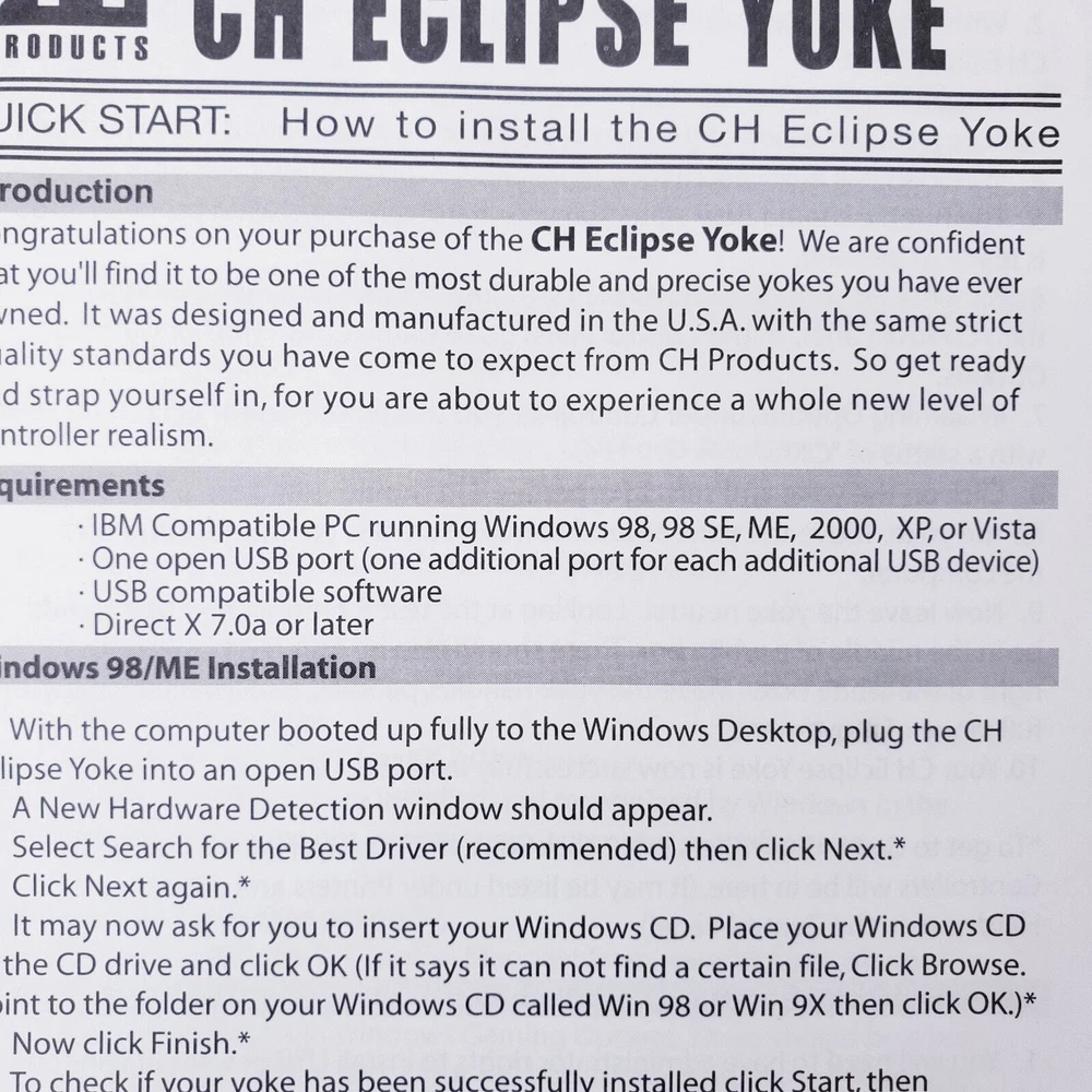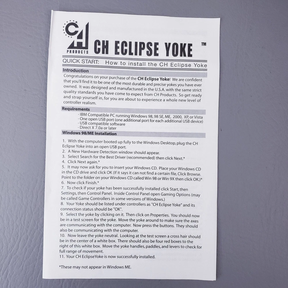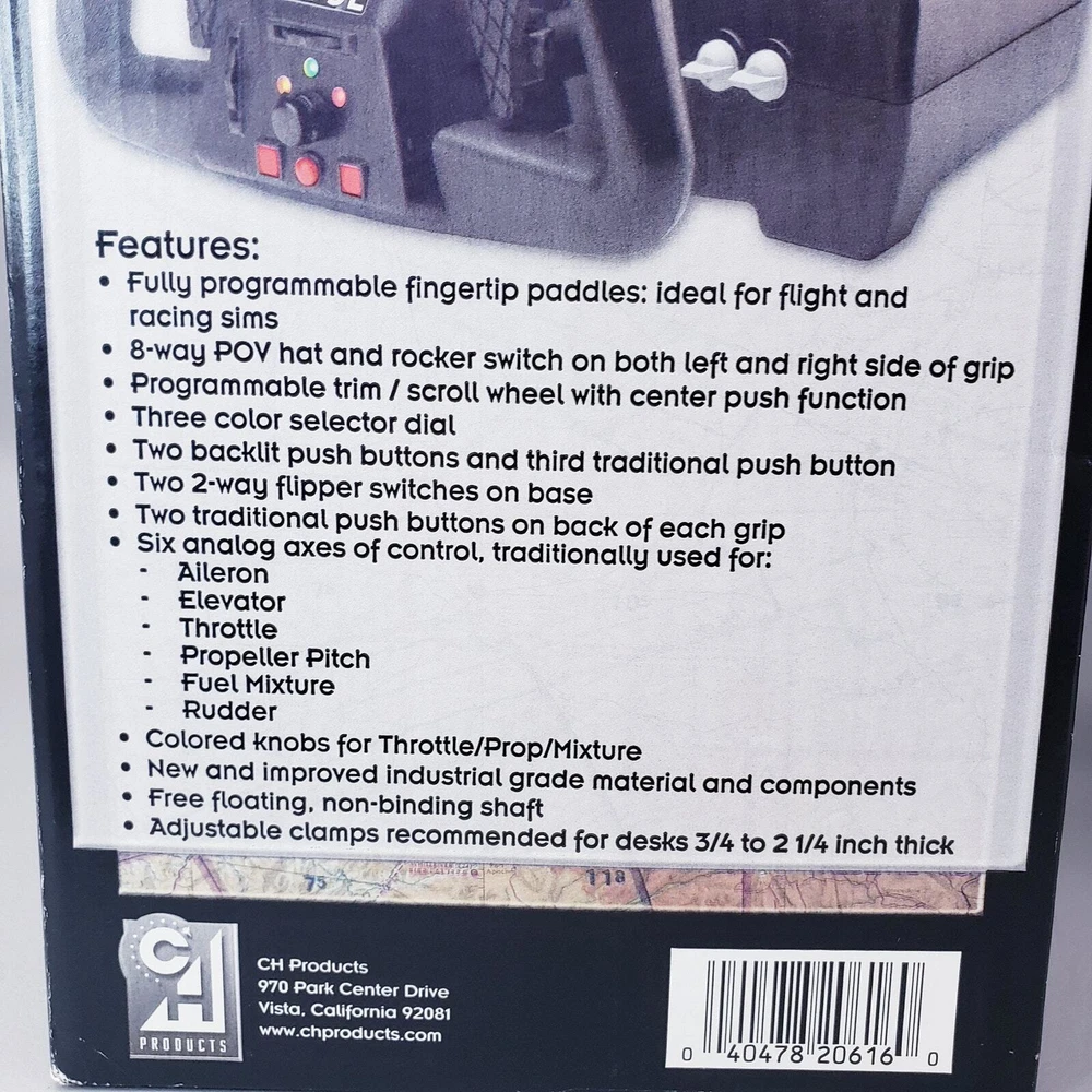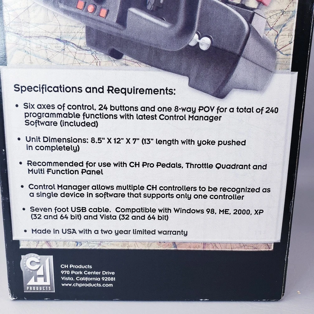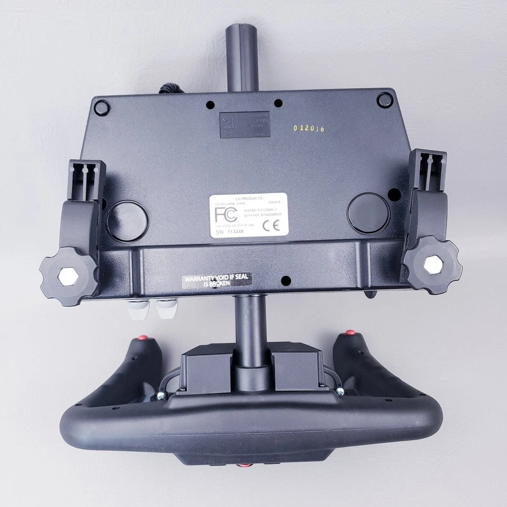 CH PRODUCTS Eclipse Yoke Flight Controller 200-616 for USB PC in Original Box Very good pre-owned condition. Unused and untested, all buttons and levers move as they should. YokeWindows and Mac Compatible Mac OSX Compatible (CH Control Manager software for custom programming is not Mac compatible) Fully Programmable Fingertip Paddles: ideal for flight and racing sims 8-way POV hat and rocker switch on both left and right side of grip Programmable Trim/Scroll Wheel with center push function Three color LED selector dial Two backlit push buttons and third traditional push button Two 2-way flipper switches on base Two traditional push buttons on back of each grip 6 analog 10bit axes, traditionally used for: – Aileron – Elevator – Throttle – Propeller Pitch – Fuel Mixture – Rudder Colored handles for Throttle/Prop/Mixture New and Improved Industrial grade material and components Free Floating, non-binding shaft Adjustable clamps recommended for desks 3/4" to 2 1/4" inch thick Ergonomic Yoke handles with realistic in and out movement Large sturdy mounting base with 7 foot USB cable Plug and Play driverless USB installation Thank you for looking!