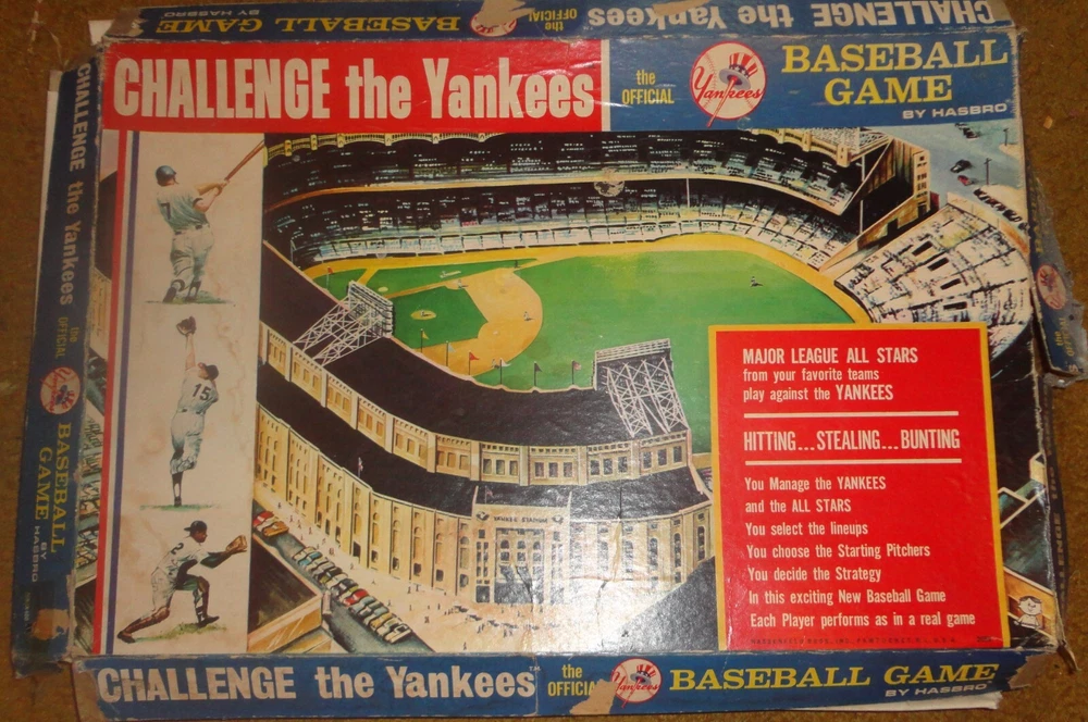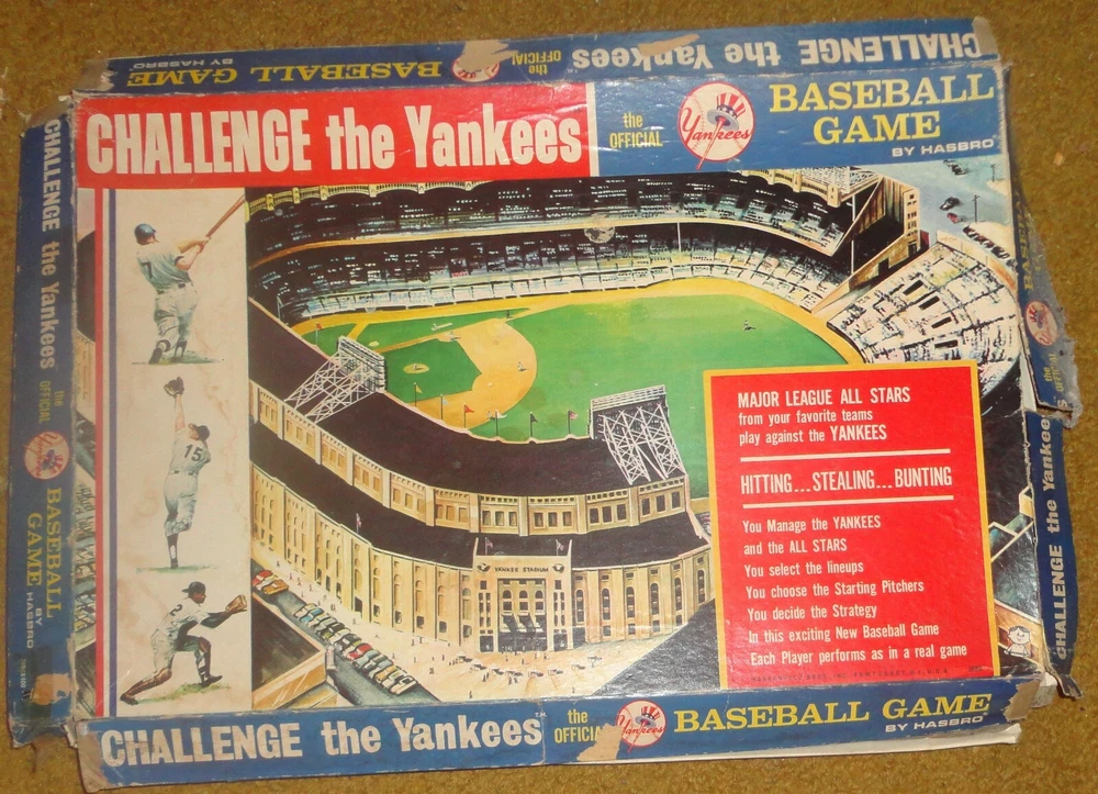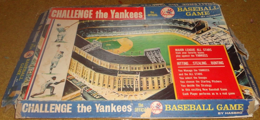 You are bidding on a game from Hasbro, produced in 1964, titled "Challenge the Yankees". I understand this to be a sort of legendary game, as it comes with individual and unique cards for about 50 major league stars of the early and mid 1960's. This is the first edition of the game Unfortunately, this copy is well worn and is not quite complete. The box top and bottom is broken at all the corners and there are additional tears and where along the sides in places. As far as the individual pieces, here is what is present - the number in parentheses is what is supposed to be there. Yankees Baseball Cards - 25 (25 is correct) All Stars Baseball Cards - 25 (24) Blank Baseball Cards - 25 (25) - about of third of these have been used in terms of having someone's name written on them. "Singles" cards - 24 (24) "Doubles" cards - 19 (24) "Triples" cards - 23 (24) "Ground Balls" cards - 24 (24) "Fly Balls" cards - 23 (24) Dice - 1 (2) Pegs - 3 (4) Manager Cards - 2 (2) There are score sheets, but they all appear to have been used. There is no instruction sheet The scoreboard and "infield" are intact, except that the "singles" and "Doubles" boxes are no longer attached to the scoreboard. The various cards are in generally good condition with minor wear to a few, which generally looks like slight tearing when they were separated from each other. I have included pictures of all 49 player cards (one is missing), but if you want to know how any one card looks, let me know and I will attach an individual picture. Almost all of the wear I'm speaking of are on the colored "single, double, etc." cards, and not the player cards, although there are a few of those with small tears. Winner pays for shipping and handling via ground advantage, which will vary based on the buyer's location. This is a large game and with the outer box to ship will weigh around six pounds. This is the preferred shipping method, but will send by other methods if less expensive, or if requested. Will combine shipping. Due to the weight of this item, I am unable to ship internationally. In the event of any problem with this item, a refund will be given upon the return shipment of the item. Thanks for looking!