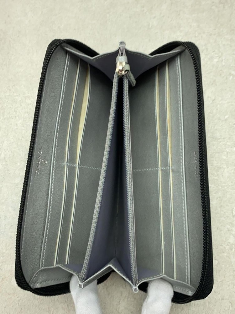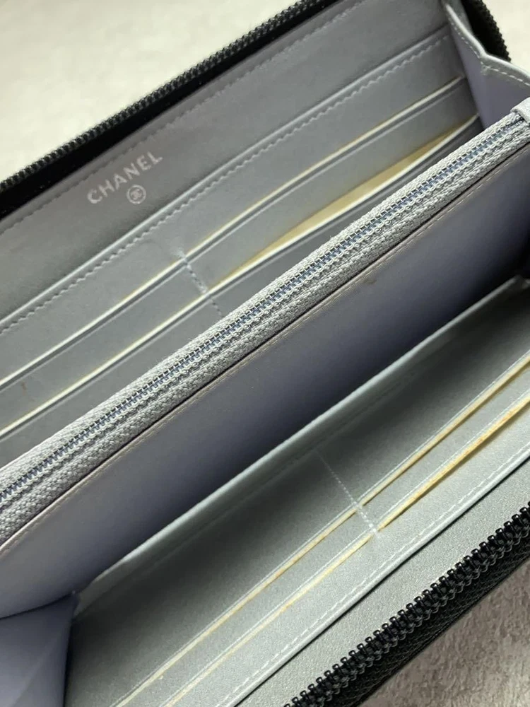 This CHANEL wallet is a stunning pre-loved piece with elegant camellia embossing and silver CC logo. The black leather is classic, and the zip-around design keeps everything secure. Though it has some corner scuffs (shown in photos), it’s still in great shape for daily use. Spacious enough for cards and cash, yet sleek at just 2.5cm thick. Perfect for Chanel lovers who want luxury at a better price!