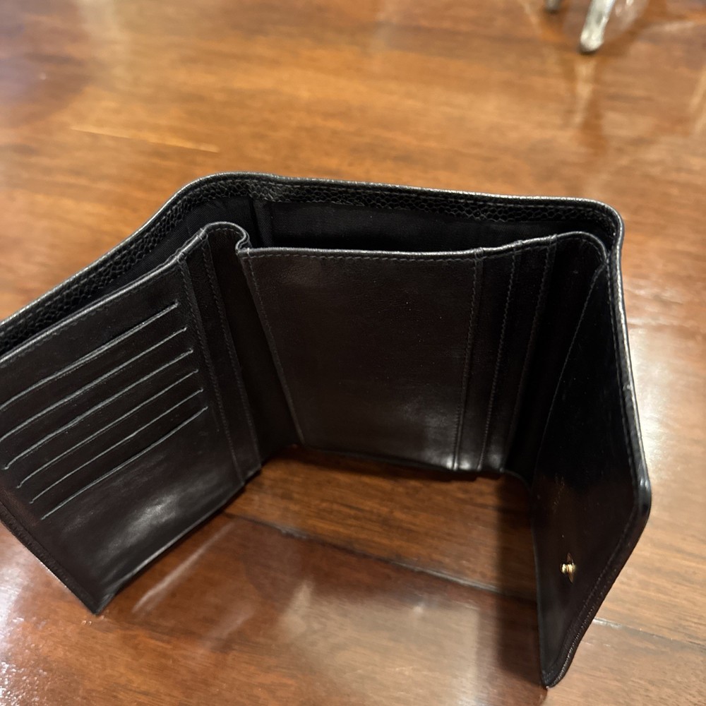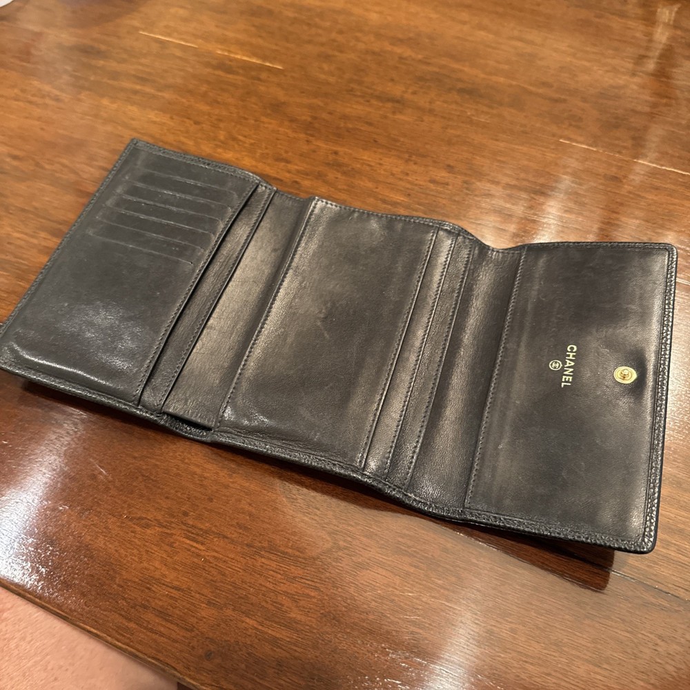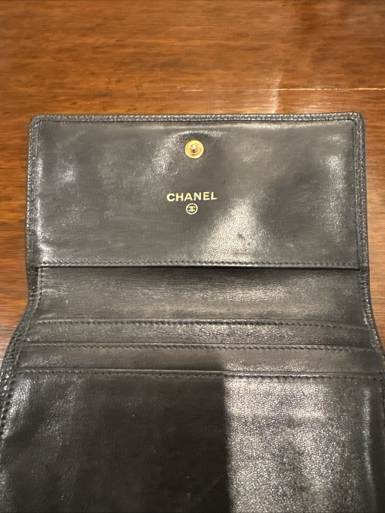 The CHANEL CC Logo Grained Calfskin Trifold Wallet in black is a luxurious and stylish accessory for women. Made of high-quality leather with a grained finish, this wallet features the iconic Chanel CC logo as an accent. The tri-fold design offers convenience and functionality, along with multiple credit card slots for organization. With its vintage charm, this wallet adds a touch of sophistication to any outfit, making it a must-have for Chanel enthusiasts and fashion-forward individuals alike. Used. Zipper pull is missing