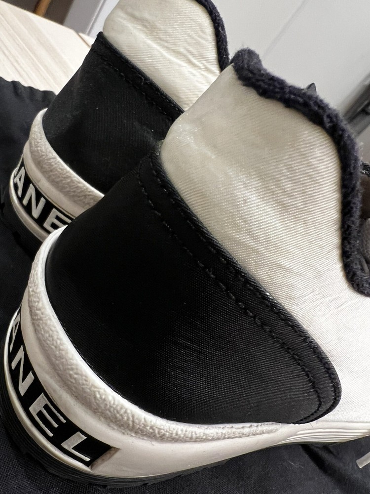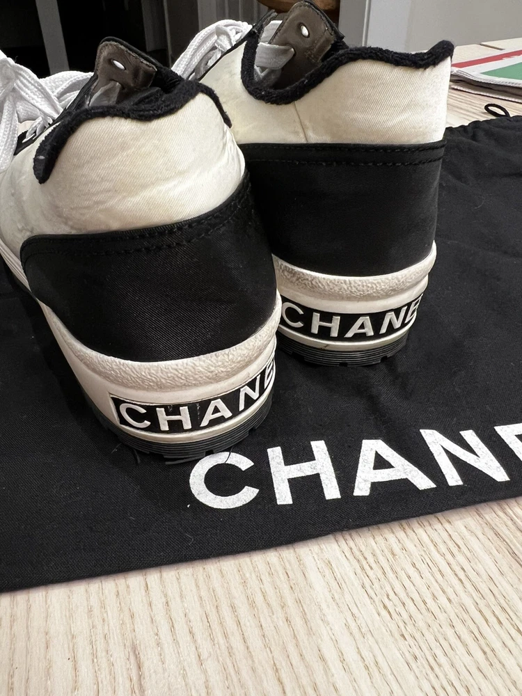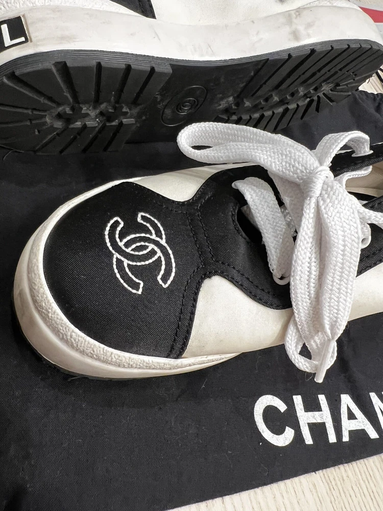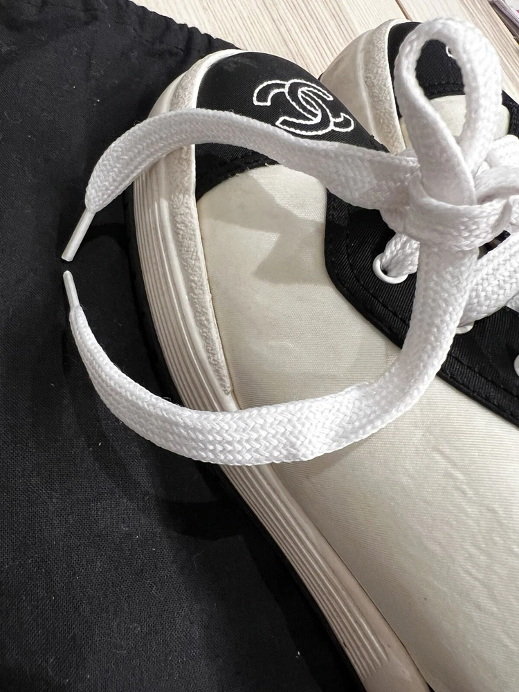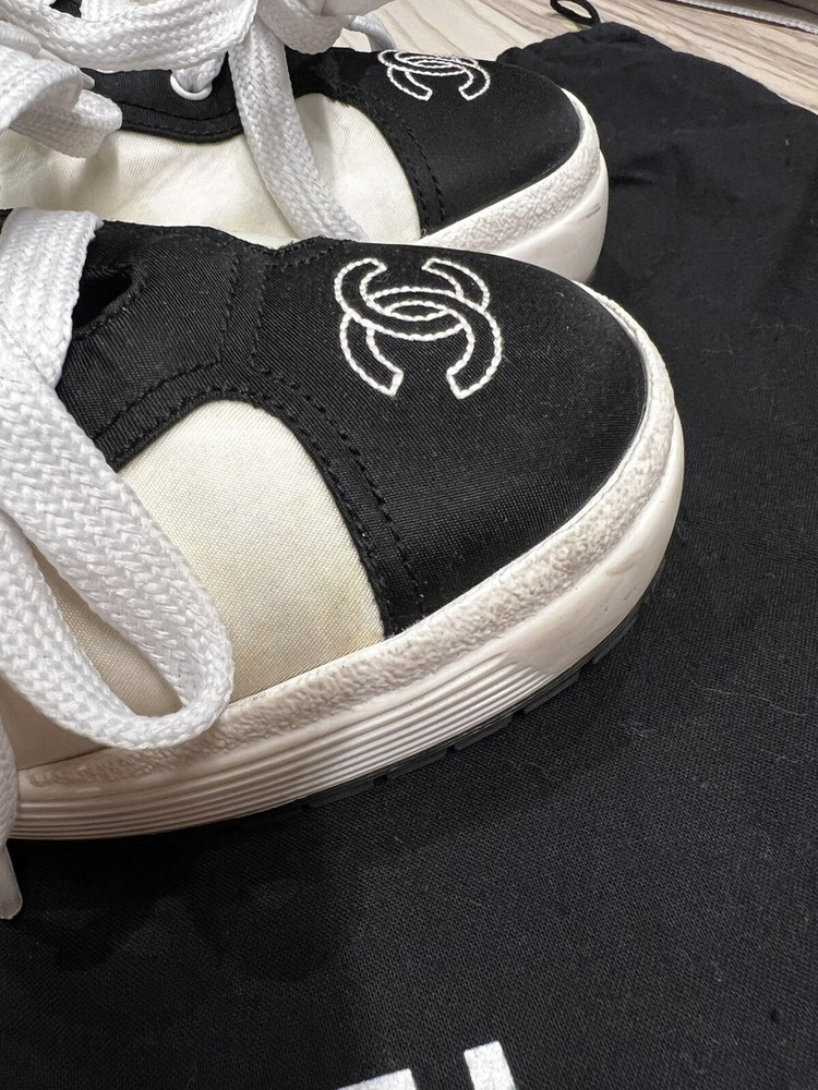 Gorgeous pair of Chanel size 37 black - white fabric sneakers Large CC logo on front Made in Italy Overall very good pre-loved condition; some light discolorations on rims/borders of soles; light outsole wear; dust bag included