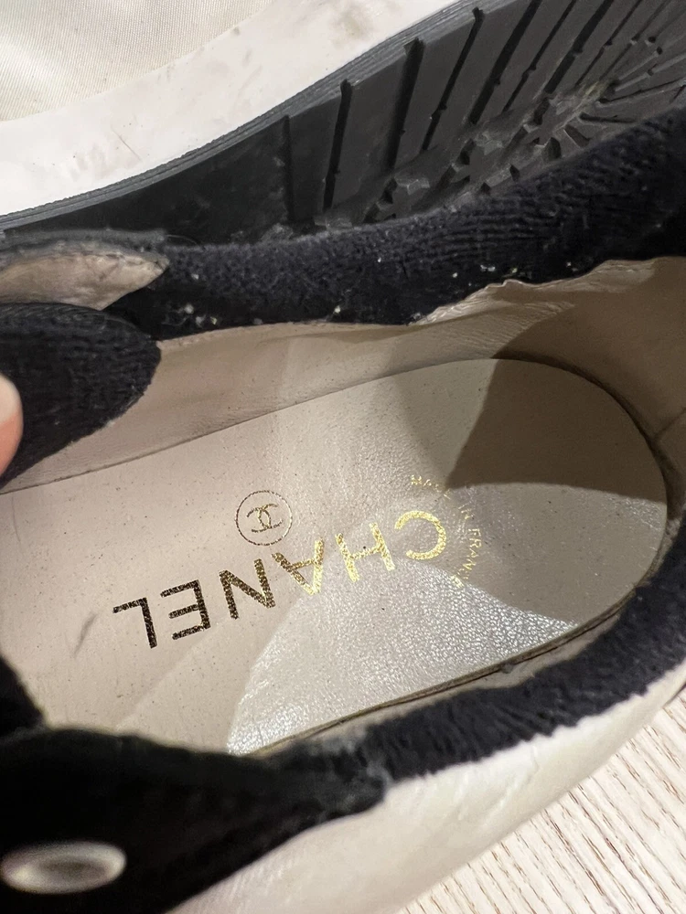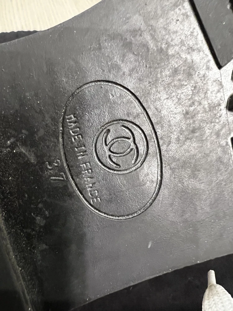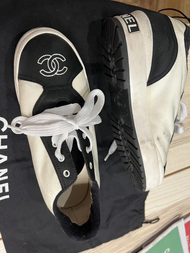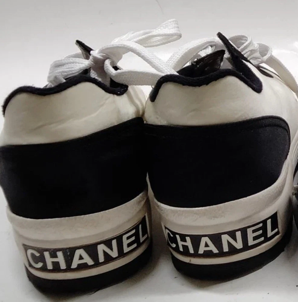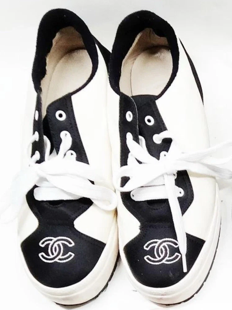 Gorgeous pair of Chanel size 37 black - white fabric sneakers Large CC logo on front Made in Italy Overall very good pre-loved condition; some light discolorations on rims/borders of soles; light outsole wear; dust bag included
