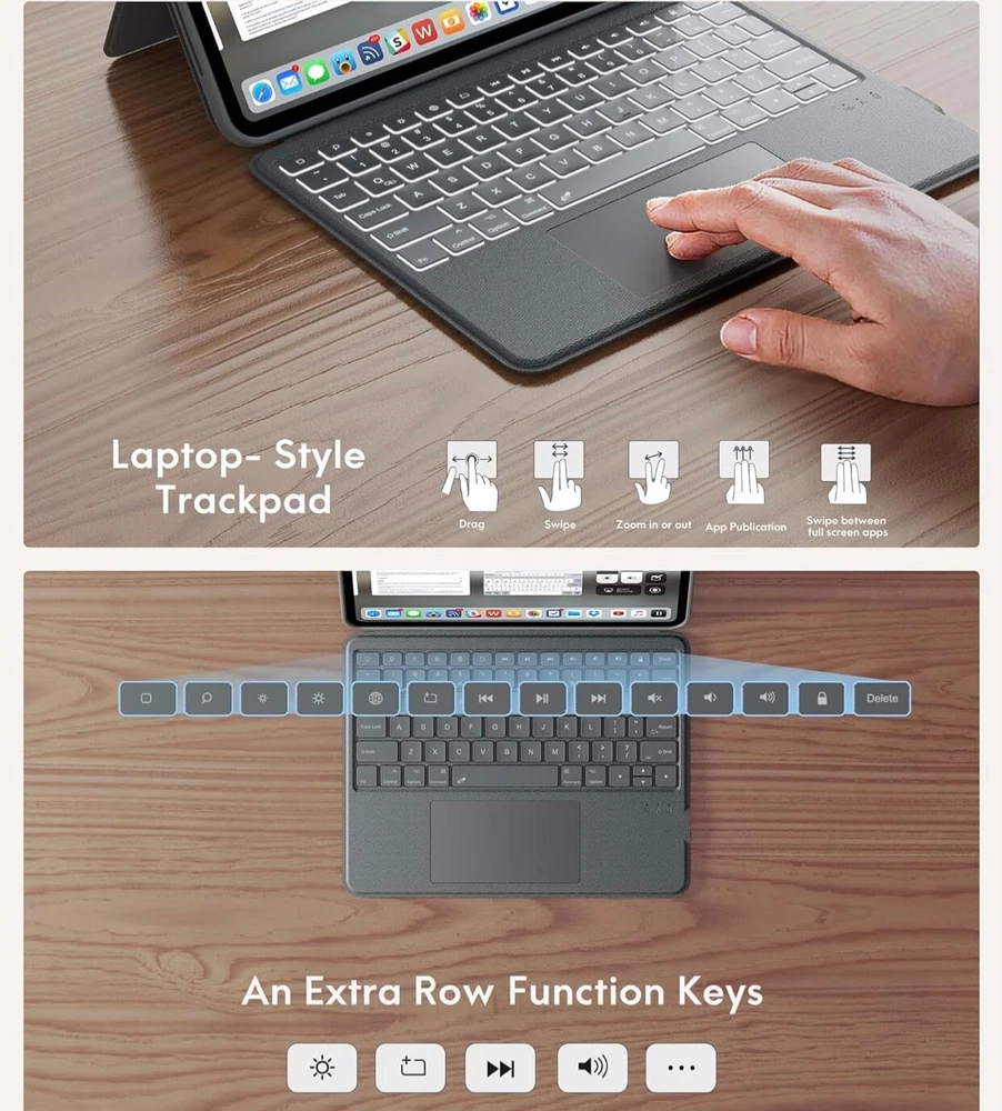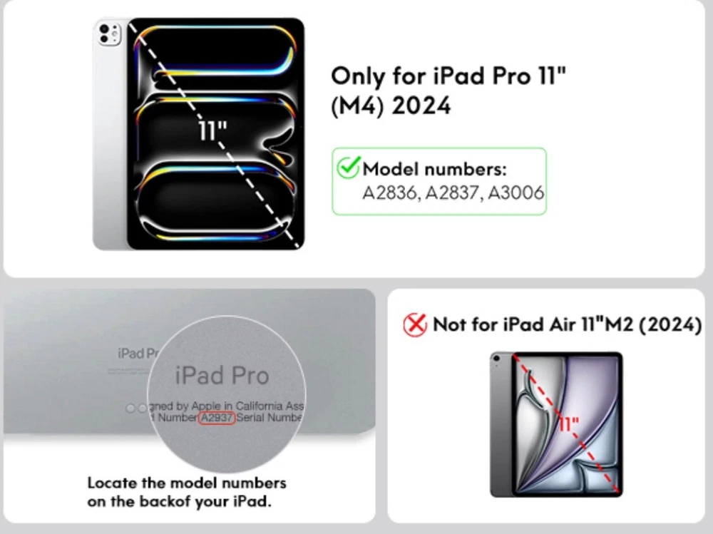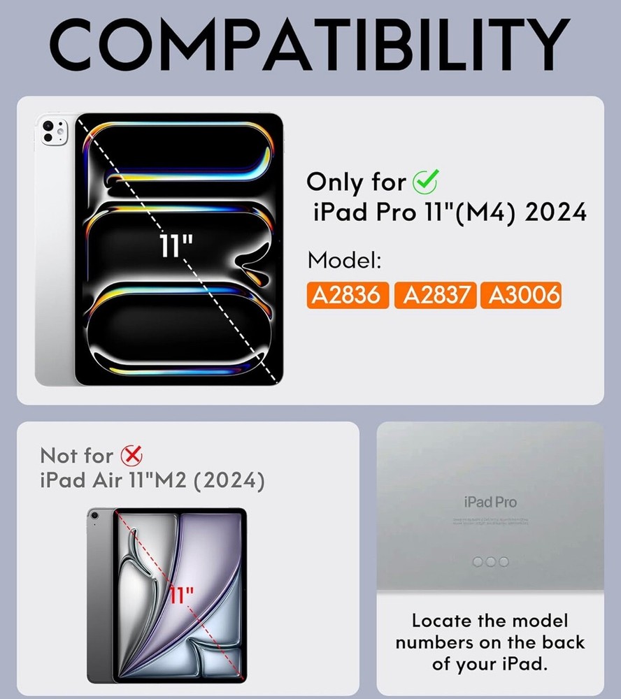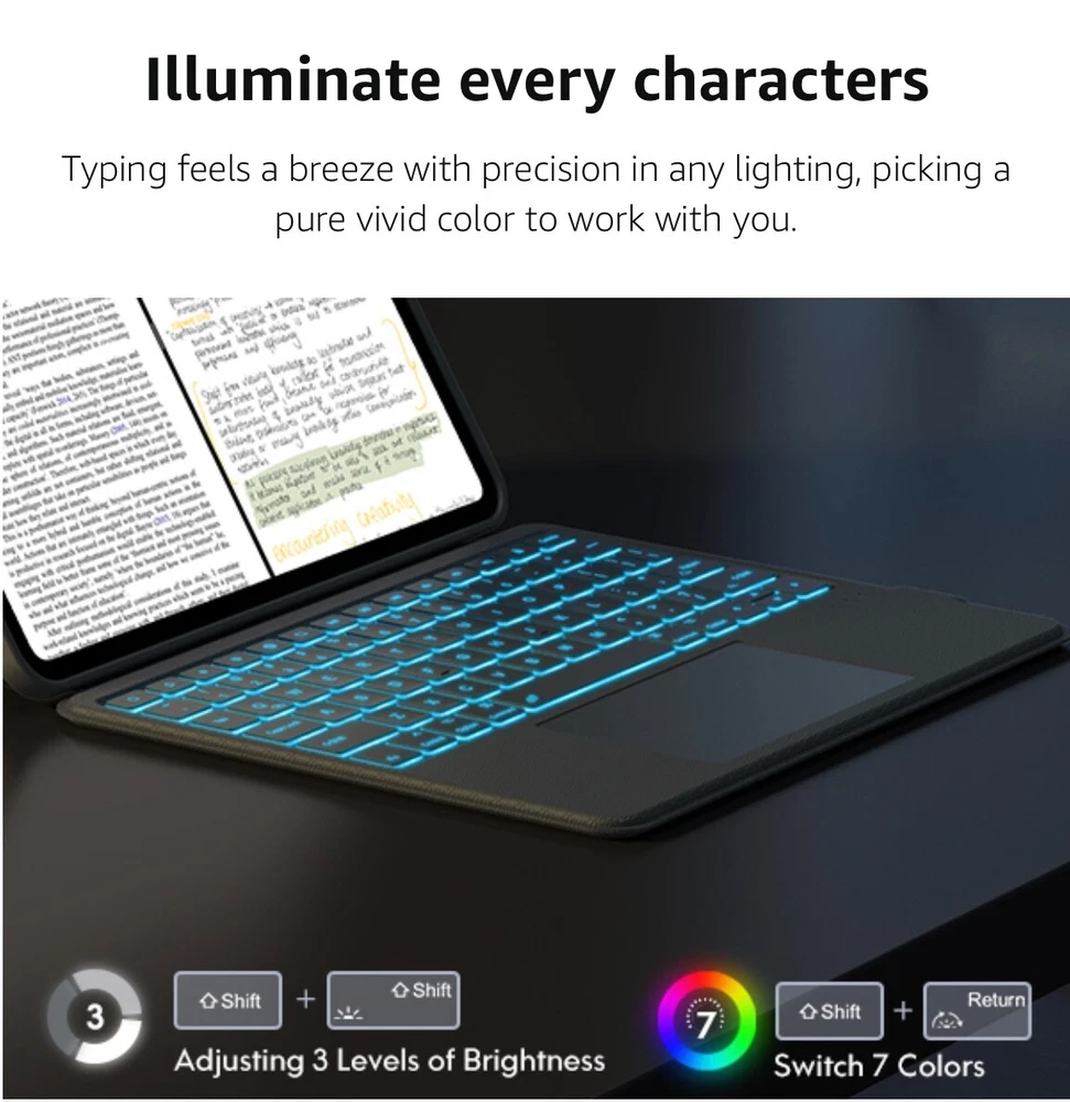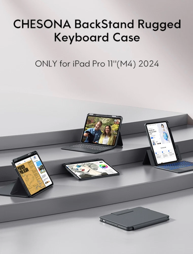 #1571 CHESONA Rugged for iPad Pro 11 (M4) 2024 Case with Keyboard, Magnetic Detachable Case & 7-Color Backlit, Smart Trackpad, 15°-180° Adjustable Stand, Portrait/Landscape, Gray Brand: CHESONA Compatible Devices: for iPad Pro 11 (M4) 2024 Connectivity Technology: Wireless Keyboard Description: Multi Functional Special Feature: Backlit Color: Gray 【 Compatibility 】 : This keyboard case is designed for iPad Pro 11-inch 2024. NOTE:NOT FIT FOR IPAD AIR 11(M2) 2024. 【 Magnetic Detachable Keyboard 】 : The intelligent keyboard case lets you switch between a lightweight laptop and your tablet.Ultra-strong magnets seamlessly integrate the case with your tablet, allowing you to remove it and change orientation if not needed. Precise cutouts allow easy access to all ports, camera, speakers, headphone jack and volume control. 【 Comprehensive Protection 】 : Premium hard-shell design protects all sides of tablet, and the included compatible camera case realizes 360° protection against accidental tablet drops, scratches and dust. Stunning pen slot design! The pencil holder prevents loss and won't get in the way of charging. Whether you're a student, writer, or professional, our keyboard case will meet your needs. 【 7-Colors Backlit & Shortcuts 】 : With 7 backlight colors and 3 levels of brightness, it's easy to use your tablet even in dark environments. Adjust the brightness to match your preferences, providing an excellent typing experience even in low light or at night. With a complete set of multimedia shortcuts, you can effortlessly control volume, and manage music playback, elevating the multimedia capabilities of your case with keyboard. 【 Precise Multi-touch Trackpad 】 : The case with keyboard for tablet includes a spacious multi-touch trackpad, delivering precise touch responses for editing, browsing and watching videos. Its larger trackpad allows for seamless navigation without an external mouse. Transform your tablet into a laptop-like, enhancing productivity and creativity. Ideal for business, school, and travel. 【 Battery & Support 】 : Built-in rechargeable battery extends battery life, working for over 50 hours on a full charge in 2-3 hours. If the keyboard does not work for 10 minutes, it will go into sleep mode and it will be disconnected from your tablet. When you press any key, it wakes up and connects to tablet again. What's in the box 1 x Pro 11(M4) Case (Tablet NOT included) 1 x Wireless Keyboard 1 x USB Charging Cable (No Charger) 1 x User Manual