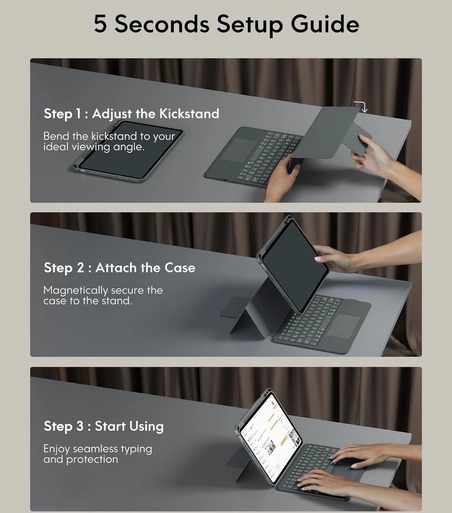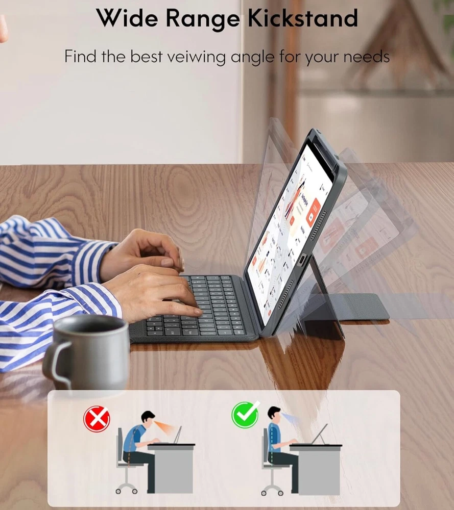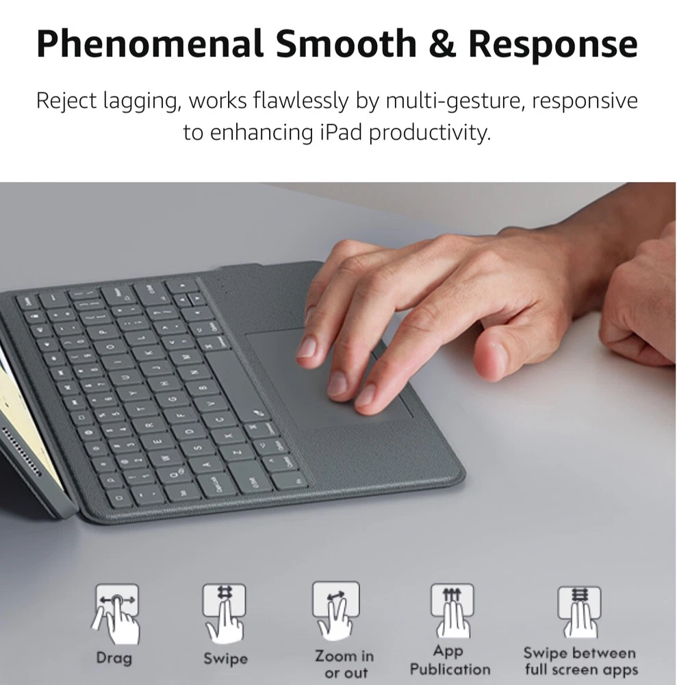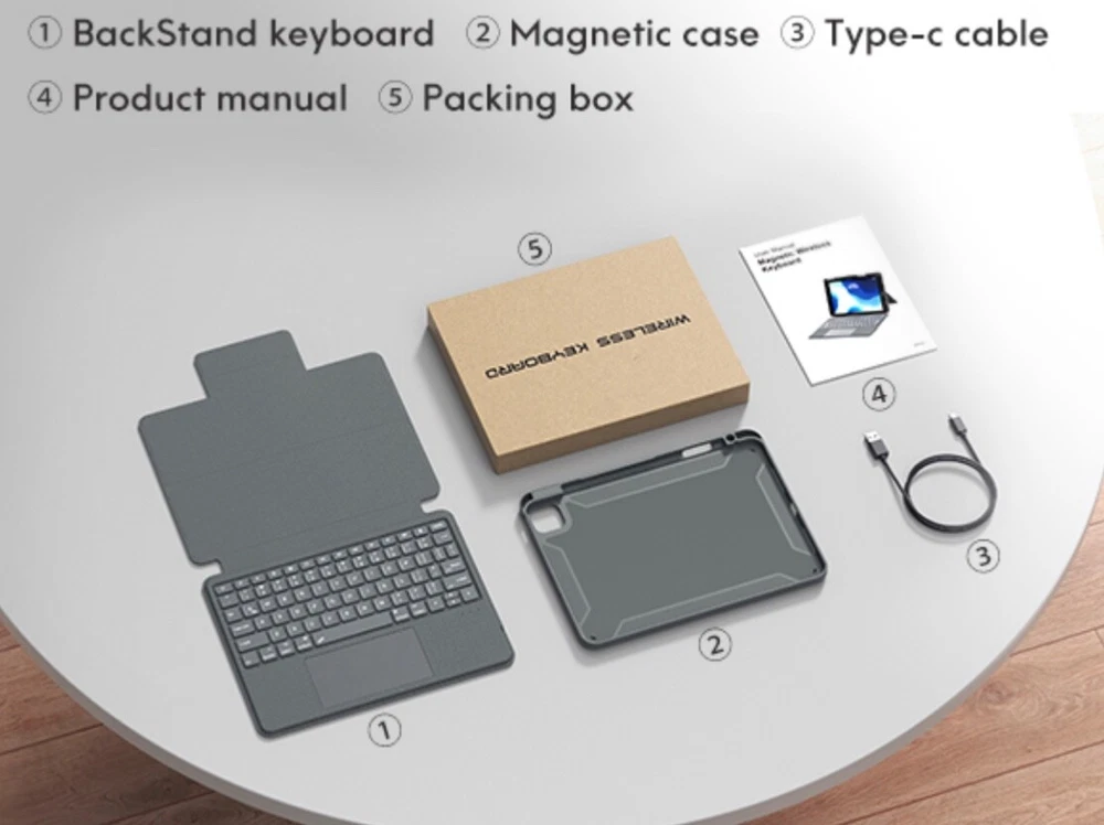 #1571 CHESONA Rugged for iPad Pro 11 (M4) 2024 Case with Keyboard, Magnetic Detachable Case & 7-Color Backlit, Smart Trackpad, 15°-180° Adjustable Stand, Portrait/Landscape, Gray Brand: CHESONA Compatible Devices: for iPad Pro 11 (M4) 2024 Connectivity Technology: Wireless Keyboard Description: Multi Functional Special Feature: Backlit Color: Gray 【 Compatibility 】 : This keyboard case is designed for iPad Pro 11-inch 2024. NOTE:NOT FIT FOR IPAD AIR 11(M2) 2024. 【 Magnetic Detachable Keyboard 】 : The intelligent keyboard case lets you switch between a lightweight laptop and your tablet.Ultra-strong magnets seamlessly integrate the case with your tablet, allowing you to remove it and change orientation if not needed. Precise cutouts allow easy access to all ports, camera, speakers, headphone jack and volume control. 【 Comprehensive Protection 】 : Premium hard-shell design protects all sides of tablet, and the included compatible camera case realizes 360° protection against accidental tablet drops, scratches and dust. Stunning pen slot design! The pencil holder prevents loss and won't get in the way of charging. Whether you're a student, writer, or professional, our keyboard case will meet your needs. 【 7-Colors Backlit & Shortcuts 】 : With 7 backlight colors and 3 levels of brightness, it's easy to use your tablet even in dark environments. Adjust the brightness to match your preferences, providing an excellent typing experience even in low light or at night. With a complete set of multimedia shortcuts, you can effortlessly control volume, and manage music playback, elevating the multimedia capabilities of your case with keyboard. 【 Precise Multi-touch Trackpad 】 : The case with keyboard for tablet includes a spacious multi-touch trackpad, delivering precise touch responses for editing, browsing and watching videos. Its larger trackpad allows for seamless navigation without an external mouse. Transform your tablet into a laptop-like, enhancing productivity and creativity. Ideal for business, school, and travel. 【 Battery & Support 】 : Built-in rechargeable battery extends battery life, working for over 50 hours on a full charge in 2-3 hours. If the keyboard does not work for 10 minutes, it will go into sleep mode and it will be disconnected from your tablet. When you press any key, it wakes up and connects to tablet again. What's in the box 1 x Pro 11(M4) Case (Tablet NOT included) 1 x Wireless Keyboard 1 x USB Charging Cable (No Charger) 1 x User Manual