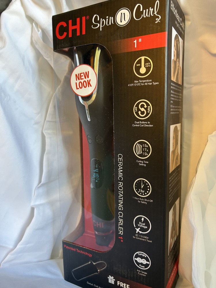 CHI Spin N Curl Ceramic Rotating 1" Hair Curler - Black Professional-Grade Styling Tool with Advanced Ceramic Technology This CHI Spin N Curl features a 1-inch ceramic barrel with automatic rotation functionality for effortless curl creation. The ceramic heating element provides even heat distribution and ionic technology to reduce frizz while maintaining hair's natural moisture balance. Key Specifications: 1-inch ceramic barrel diameter Automatic bi-directional rotation mechanism Multiple heat settings with digital temperature control Ceramic coating for consistent heat transfer Built-in safety features including auto-shutoff Professional-length swivel cord Color: Black Condition: New In Box What's Included: Original box and curling iron, unopened The ceramic construction ensures optimal heat retention and distribution, while the rotating mechanism eliminates the guesswork in curl direction. Suitable for all hair types and lengths that accommodate the 1-inch barrel size.