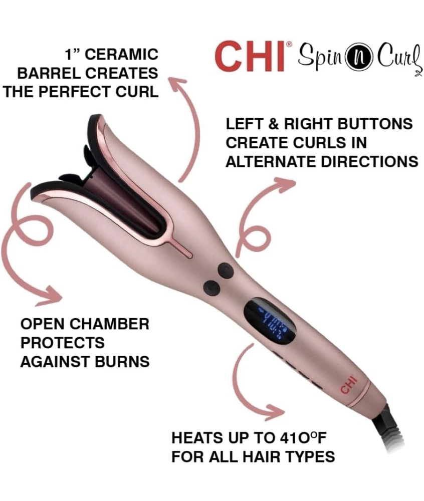 Power Source:ElectricType:Rotating Curling IronModel:CHI Spin n CurlNumber of Temperature Settings:3gtin13:0813843041501Barrel Size:1 inHair Type:All Hair TypesUPC:0813843041501Department:UnisexColor:PinkPower:25WBrand:CHIHeating Plate Material:CeramicMaximum Temperature:410 °FMaterial:Ceramic