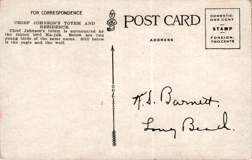 MAKE AN OFFER. THE MORE YOU BUY THE BETTER DEAL I WILL ACCEPT The postcard features an image of Chief Johnson's totem and residence in Ketchikan, Alaska. The totem pole is topped by the mythical bird Ka-juk, with two young birds of the same name below. The totem also includes depictions of an eagle and a wolf. The postcard includes instructions for addressing and postage rates for domestic and foreign mail.