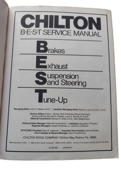CHILTON Best Service Manual Paperback John Weise 1983 Softcover #7398. 348 pages No tears on any pages No loose pages Some slight staining on the edges of the pages that you can only see when the book is closed most likely from sitting on a shelf in a garage/shop. Pages themselves are very clean and has little sign of wear. Book does not appear to have been used much or at all. Binding is secure and intact. Cover is in very good condition