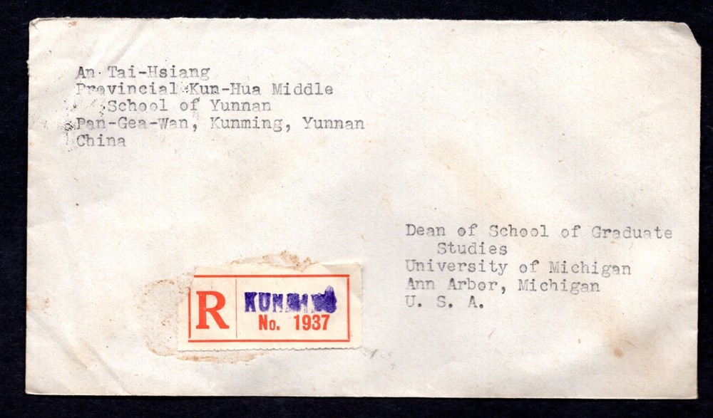 CHINA 1947 CIVIL WAR COVER REGISTERED TO U.S. "KUNMING" TYING SCOTT #614 (x2) & #645 (x3) TO UNIVERSITY OF MICHIGAN ANN ARBOR. KUNMING WAS STILL UNDER THE NATIONALIST GOVT. AND WAS AN ESSENTIAL BASE FOR THE U.S. FORCES & SUPPLY ROUTE THROUGH INDIA PLEASE NOTE: ADHESIONS TO THE BACK OF THE COVER ROUGHLY SOILED & REMOVED SEE SCANS PLEASE VISIT MY EBAY STORE : Filatco Stamps BUY 5 ITEMS SHIPPING & REGISTRATION IS FREE INTERNATIONAL BUYERS PLEASE NOTE: ALL SHIPMENTS INCLUDE TRACKING Feel free to ask if you have any questions. PAYMENT WITHIN 2 DAYS IS APPRECIATED . FEEDBACK : I APPRECIATE YOUR BUSINESS AND MY TOP CONCERN IS TO MAKE SURE YOU ARE 100% PLEASED WITH ANY ITEM YOU PURCHASE. IF YOU HAVE A CONCERN OR A PROBLEM WITH INVOICE, SHIPPING OR ANY ITEM YOU RECEIVED PLEASE CONTACT ME FIRST BEFORE YOU LEAVE ANY FEEDBACK. I GUARANTEE YOU WILL BE 100% SATISFIED WITH THE TRANSACTION. I WILL CERTAINLY LEAVE YOU A POSITIVE FEEDBACK AS SOON AS I RECEIVE YOURS.