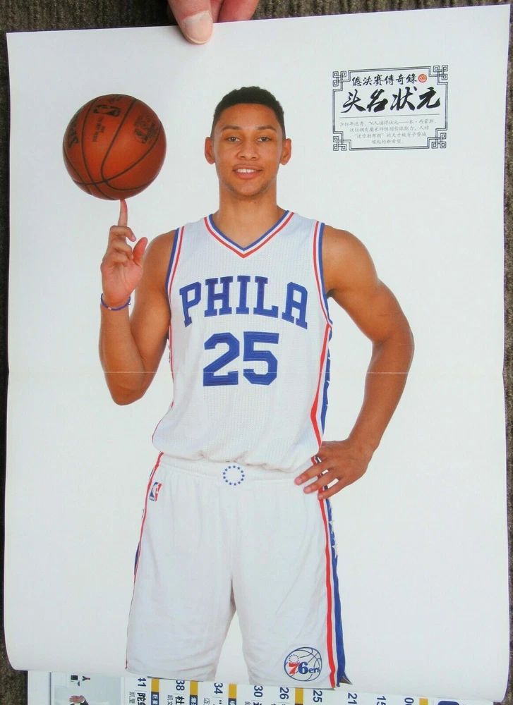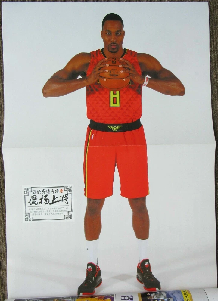 This is a used July 2016 issue of "Super Star Of Basketball" magazine from CHINA, picturing Kevin Durant, Draymond Green, Klay Thompson and Stephen Curry from the Golden State Warriors, Dwyane Wade from the Miami Heat, Tim Duncan from the San Antonio Spurs and Australian model Sarah Stephens on the cover. The insert posters of Ben Simmons from the Philadelphia 76ers and Dwight Howard from the Atlanta Hawks are still intact in the magazine, as pictured. Magazine is printed entirely in CHINESE!