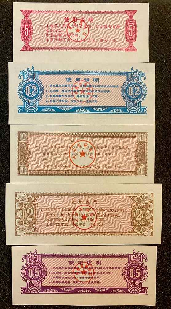 The grain rationing system in China was imposed by the People's Republic of China in the 1950s to control the production of food and to boost industrialization. People were given grain coupons with which they could buy a certain amount of grain at a low, state-imposed price, which varied somewhat with age, profession and location. Any quantity exceeding the coupon quota would have to be purchased at market price. Urban households in China therefore face a kinked budget constraint line. With this system, urban households were able to buy grain at a cheaper price, and at the same time rural areas, once they fulfilled the state-imposed quotas, were allowed to sell the excess supply at market price. - Authentic notes! (5pcs) - Free Shipping! - Great for Collectors! - Small notes.