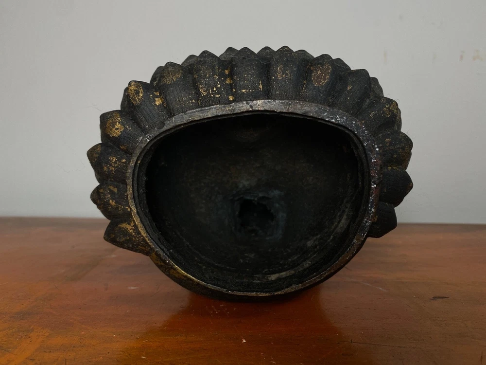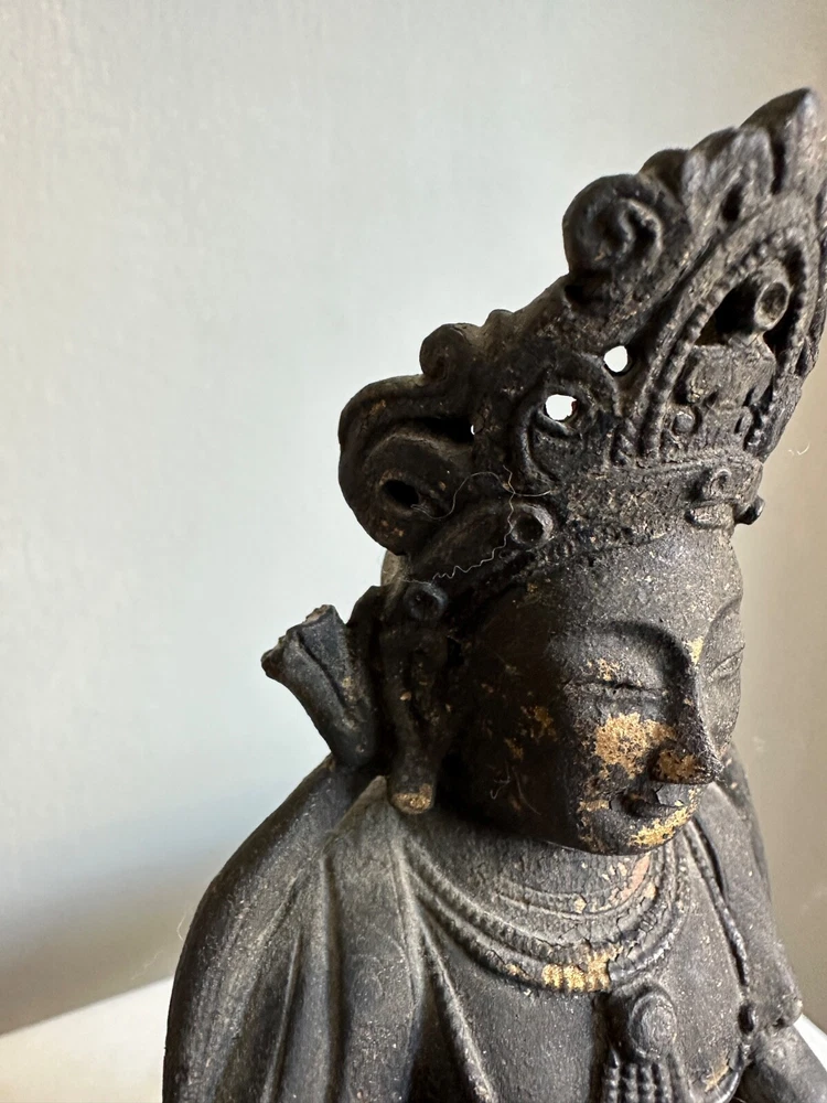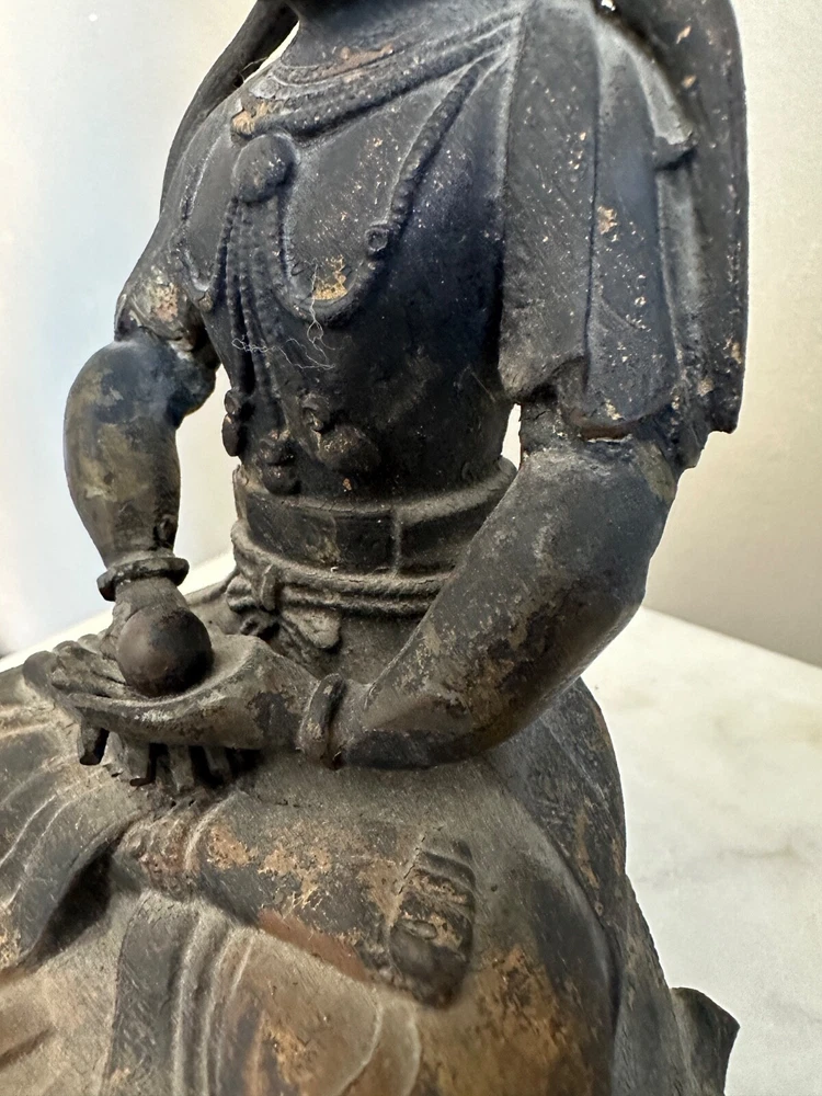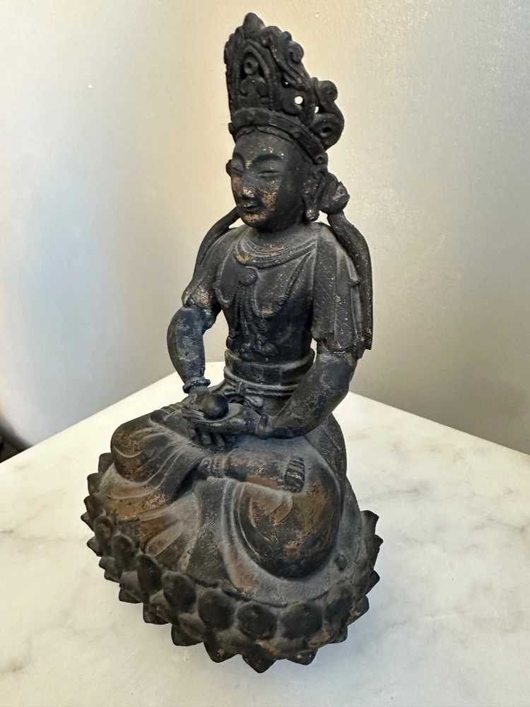 Height: 19in. (48cm) Age: Post-1940 Guanyin Statue: Cast Iron Color: Dark Patinated Bronze Chinese Dynasty: People's Republic Period (Post-1949) Maker: Unknown Original/Reproduction: Vintage Original Region of Origin: China Primary Material: Iron Animal Type: N/A Theme: Kwan-yin