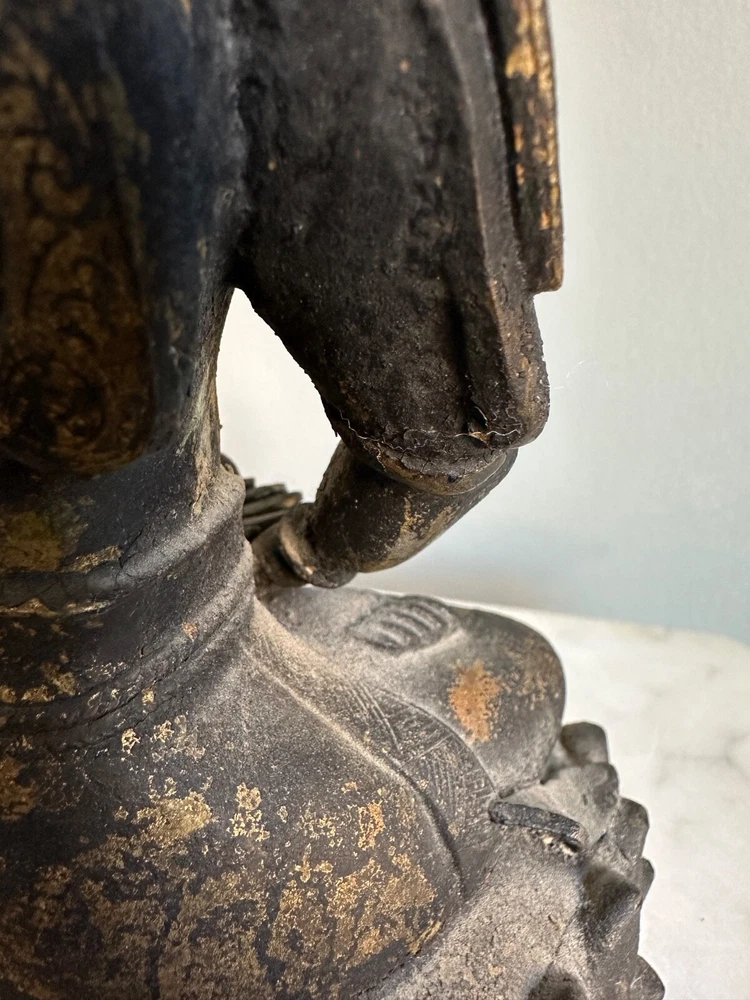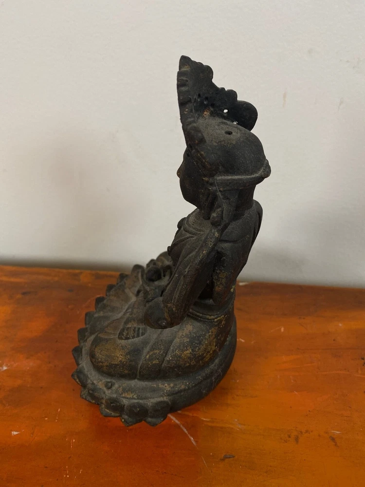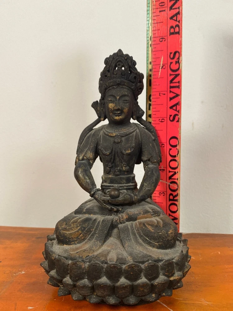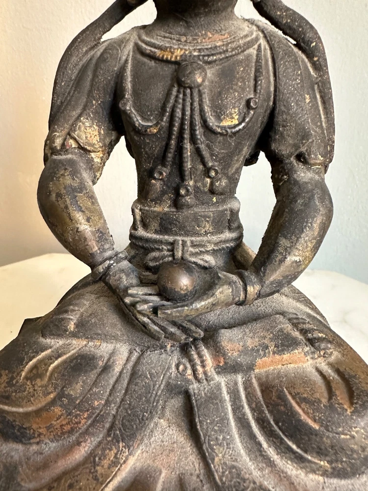 Repair to arms/elbow see all photos Sold *as is This Chinese cast iron statue features a seated Guanyin, also known as Kuan-yin, in the Ming Dynasty style. The dark patinated bronze color and intricate details of the statue make it a beautiful addition to any collection or display. The statue stands at 19 inches (48 cm) tall and is a vintage original from the People's Republic Period (post-1949) in China. The statue is made of cast iron and comes with a California Prop 65 warning. The Guanyin statue is a perfect representation of the Ming Dynasty era and is sure to impress anyone who sees it. This statue belongs to the Figurines & Statues category and is a great piece for collectors of Asian antiques.