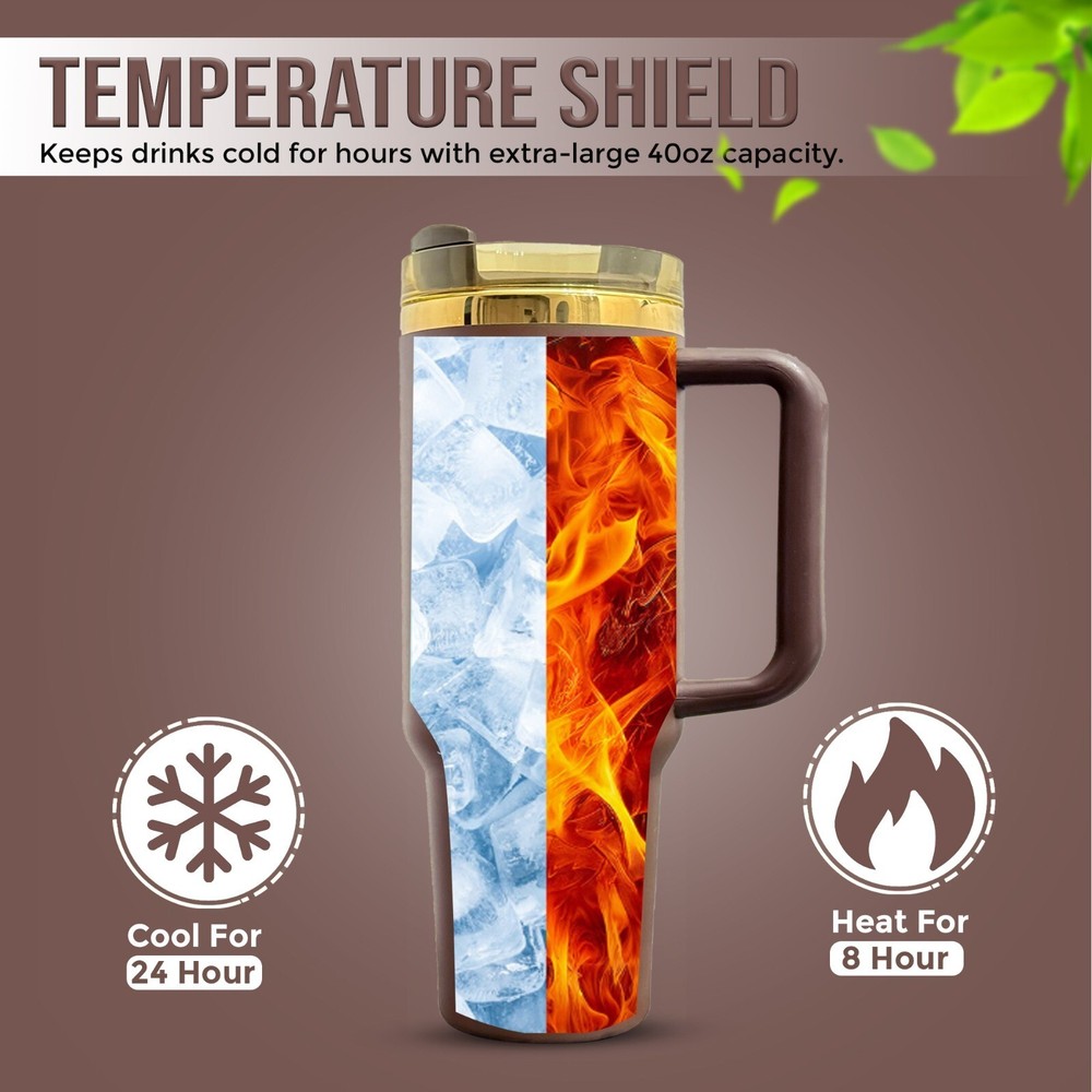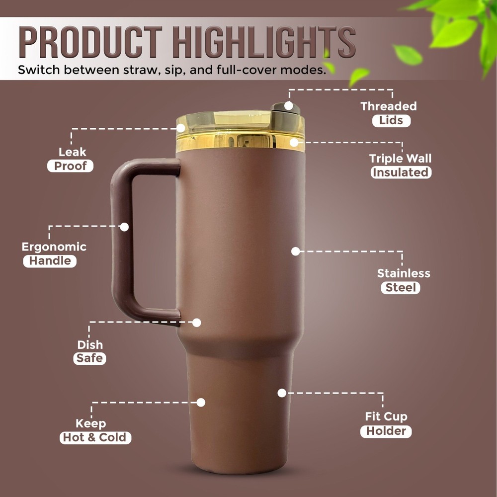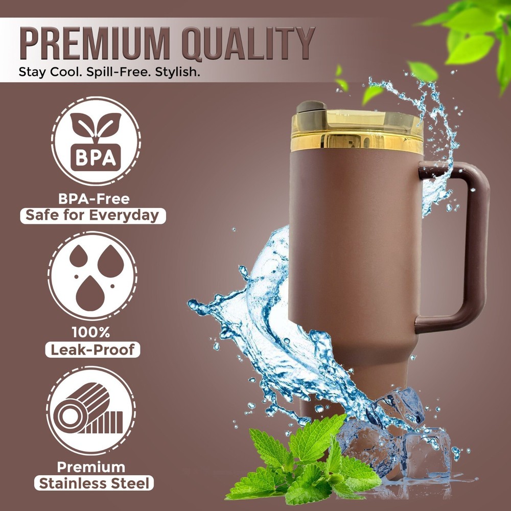 The CHOCOLATE GOLD Limited Edition Quencher H2.0 40 oz Tumbler Cup is a stylish and functional drinkware option for adults. This tumbler cup is made of durable stainless steel and BPA-free plastic, with a solid gold color and a lid that allows for easy drink-through access. It has a large 40 oz capacity and can keep beverages hot for 7 hours and cold for 11 hours, making it suitable for both hot and cold drinks. The tumbler also features a spill-proof design, insulated properties, and includes a handle for easy carrying. Perfect for on-the-go use, this limited edition cup is a must-have for chocolate lovers looking for a high-quality beverage container.