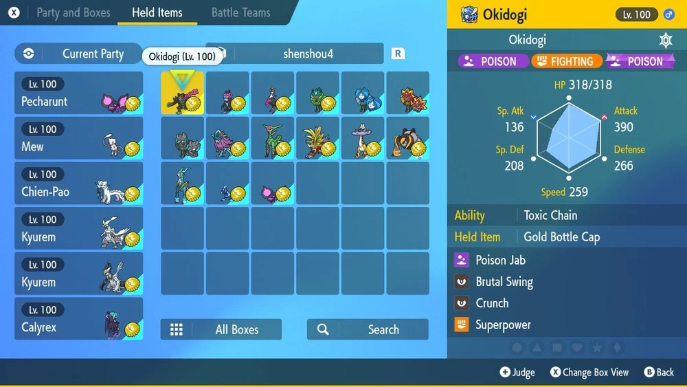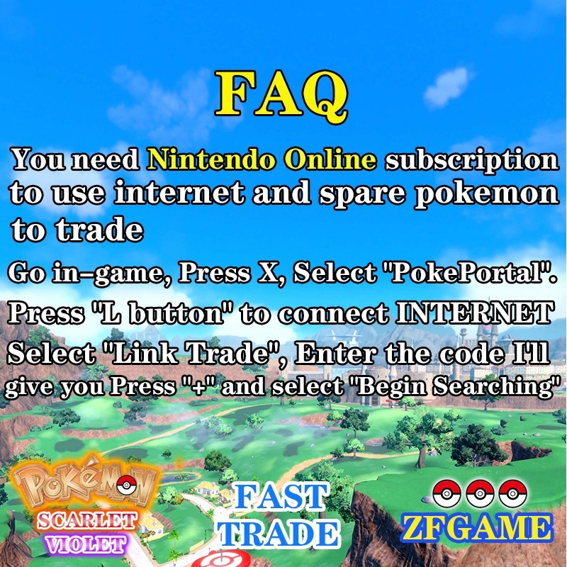 Pokémon Scarlet & Violet You need Nintendo Online subscription to use internet and sufficient spare pokemon to trade.Go in-game, Press X, Select "PokePortal".Press 'L button" to connect INTERNT Select "link Trade", Enter the code I'll give you Press "+" and select "Begin Searching'' After purchasing please let me know via a note or message what your Trainer Name (In Game Name) is, along with your availability. I will contact you as soon as possible. After purchase no returns/cancellations are accepted. All the items held are defaulted to be Gold Bottle Cap. If you need to change the held items, please let me know.