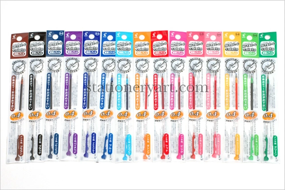 CHOOSE ANY 5x HI-TEC-C Coleto Refills 15 beautiful colors to choose from! This listing doens't come with any pens! Please see our store for all the pens available - dozens of varieties! Search our store for "coleto" - see the red store icon next to our feedback score (top right of screen) 3 different sizes to choose from : 0.3mm, 0.4mm, 0.5mm Refill co lours: Black, Blue Black , Blue, Aqua Blue, Clear Blue, Green, Apple Green, Orange, Apricot Orange, Violet, Pink, Baby Pink, Cherry Pink, Red, Brown PLEASE LEAVE A NOTE OR SEND US A MESSAGE OF THE COLORS AND SIZE YOU NEED! Value Set! If you have any special request, just send me a message! Please check our other items when shopping! Airmail delivery from Taiwan to Worldwide For delivery estimate to your country, please see below.