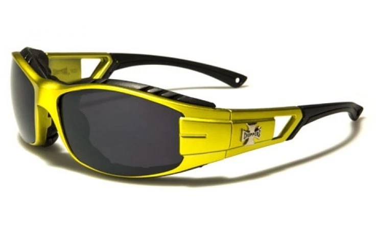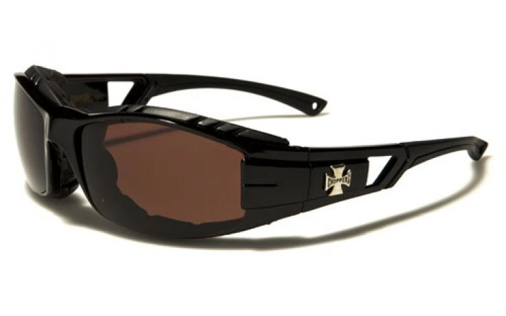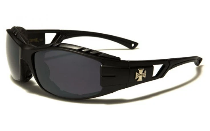 These CHOPPERS sunglasses (135) offer UV 400 CE protection, plastic frames and polycarbonate lenses. Have CHOPPERS logo on both legs and rubber grips at the nose area. Considered as a wrap around style. The wind resistance feature & padded lenses are perfect for motorcycle riding, biking or any kind of outdoor and sport activities. Free shipping in the United States.