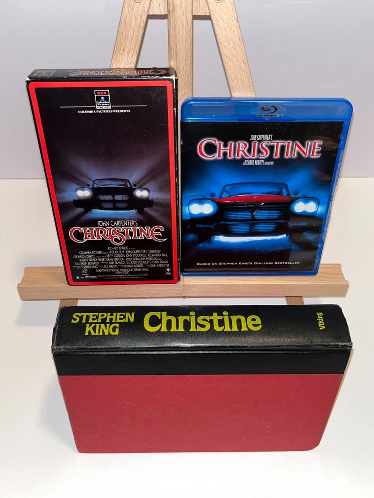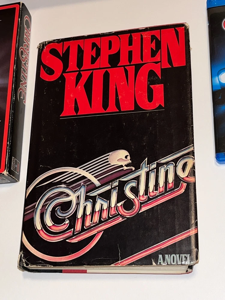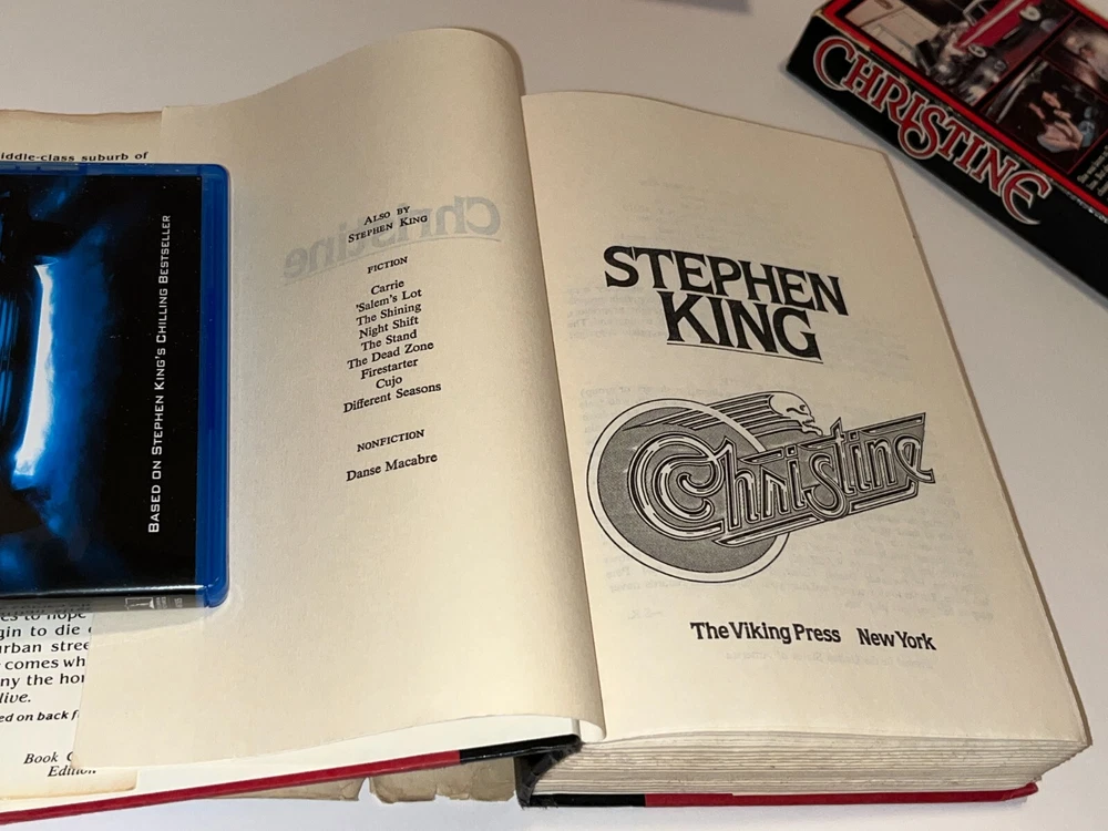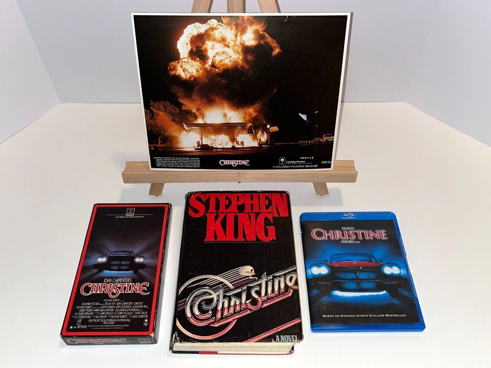 You are bidding on: A CHRISTINE Collection Lot of 4 items including the Stephen King Hardcover Book (1983 Book Club Edition, The Viking Press, NY.), a VHS (1984 release) & Blu Ray (2015 release) of the John Carpenter Movie, and ONE 8 inch by 10 inch original Lobby Card (Printed in 1983) of the gas station explosion from the film. Great HALLOWEEN Time Book & Movie! All Items are originals. A Perfect collection for Stephen King & John Carpenter fan. See ALL Photos of details of Blu Ray back cover to see what extras are included on the disc, including deleted scenes. Check out Photos of the the Hardcover Book to the see the Copyright page for original printing date. The Book slipcover has a bit of normal wear for a 41 year old book. The book itself & inside pages are in GREAT shape, with embossed title on binding and "SK" on front cover. Book may have musty oder from storage, which is typical of older original books. All Items are from a Pet-free & Smoke-free home. There are 3 different Shipping Options available, including Insurance. All may have different delivery times.